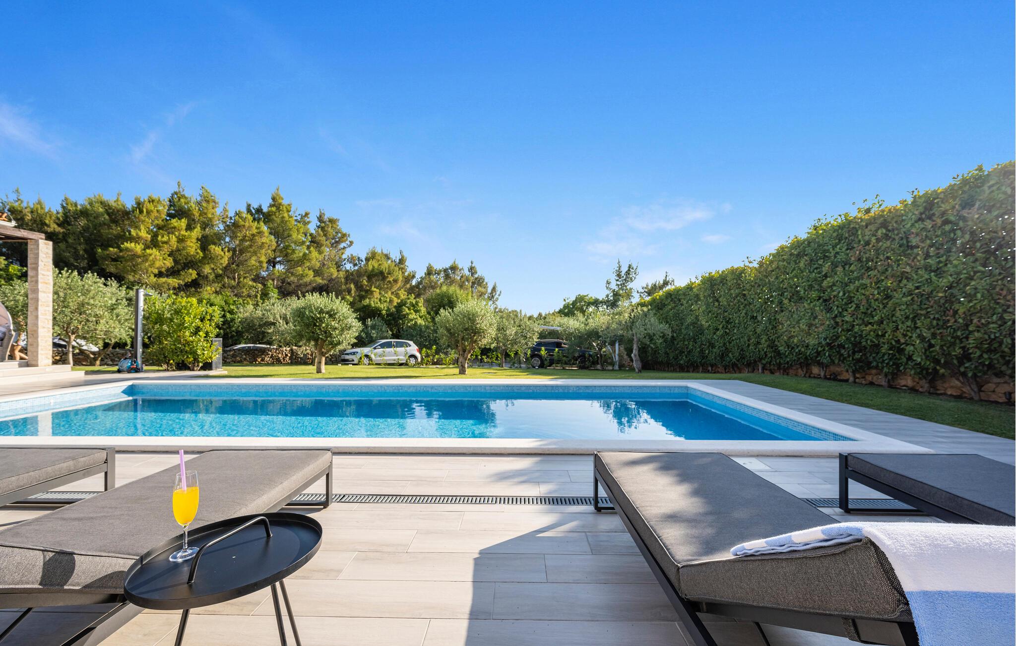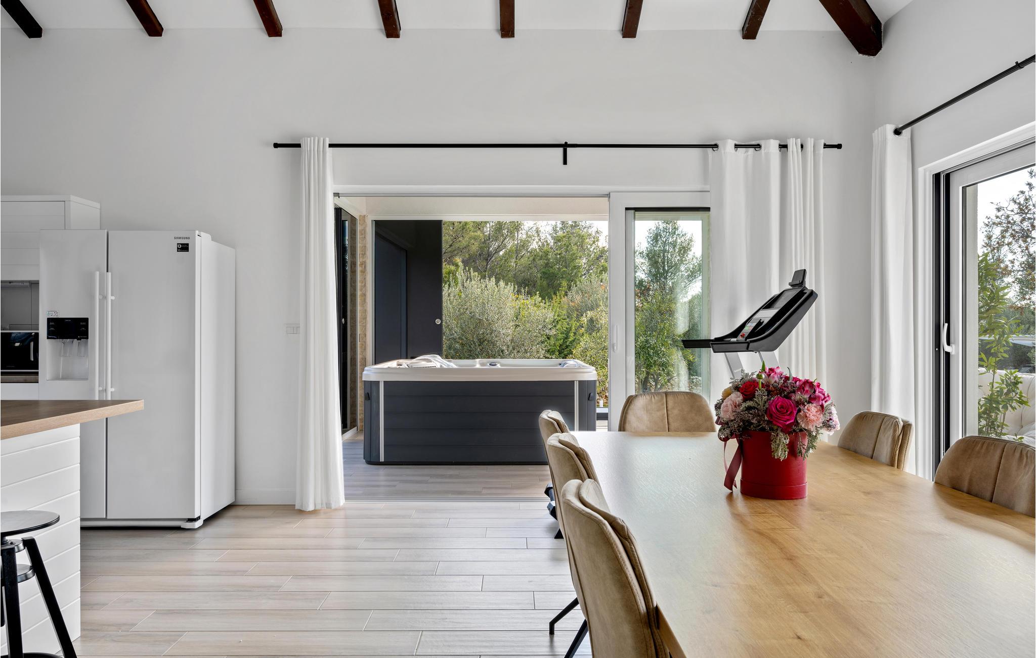 Den private pool er opvarmet og kan benyttes hele året rundt, og der er desuden sauna og jacuzzi.