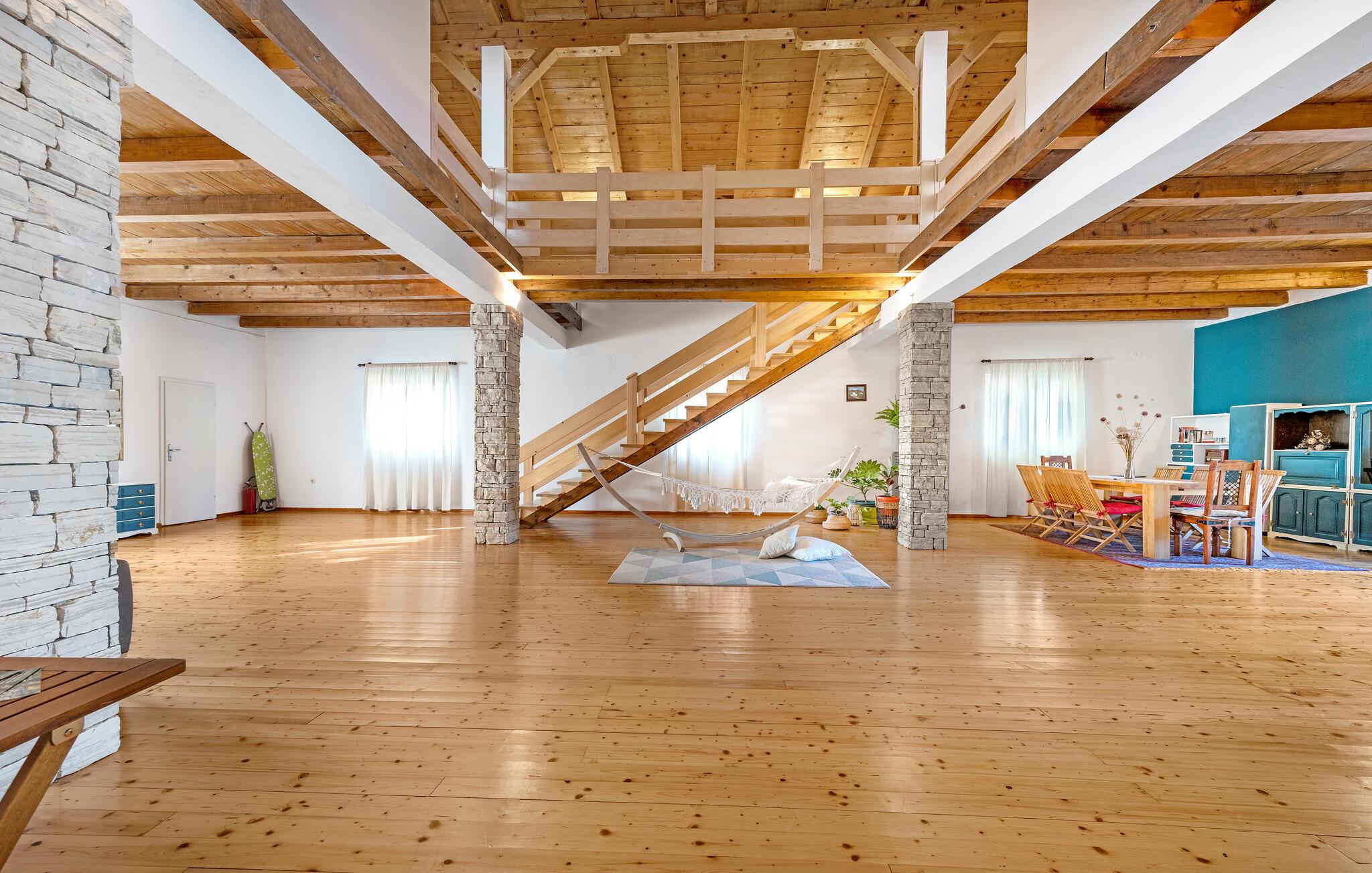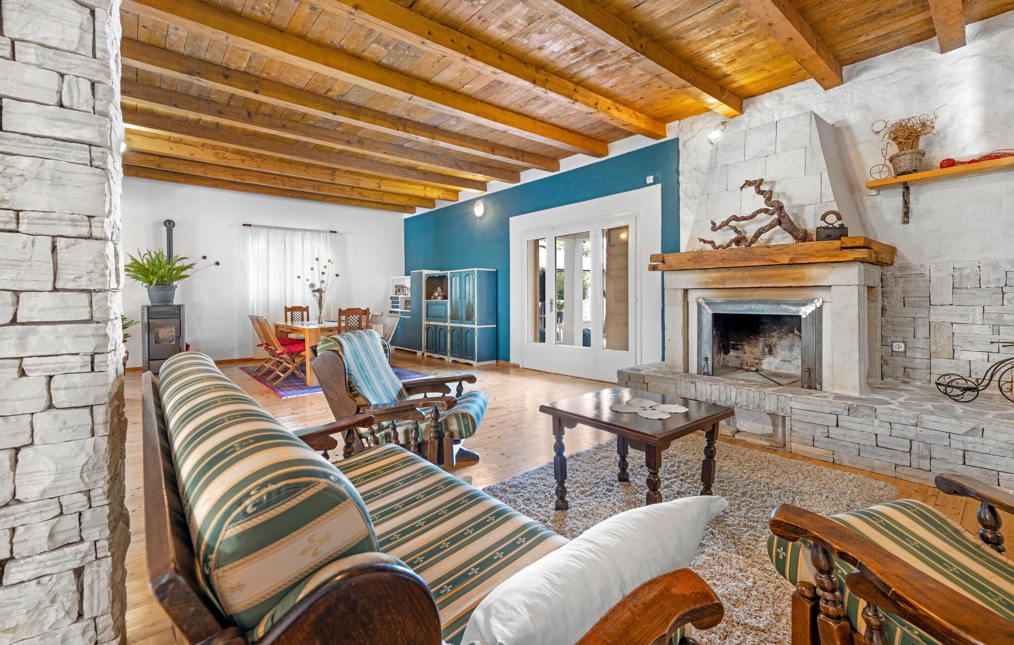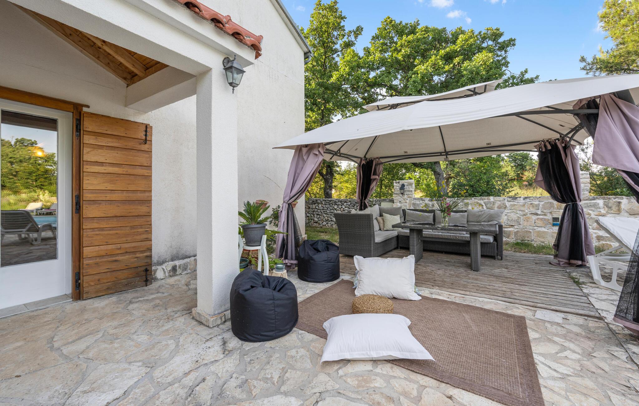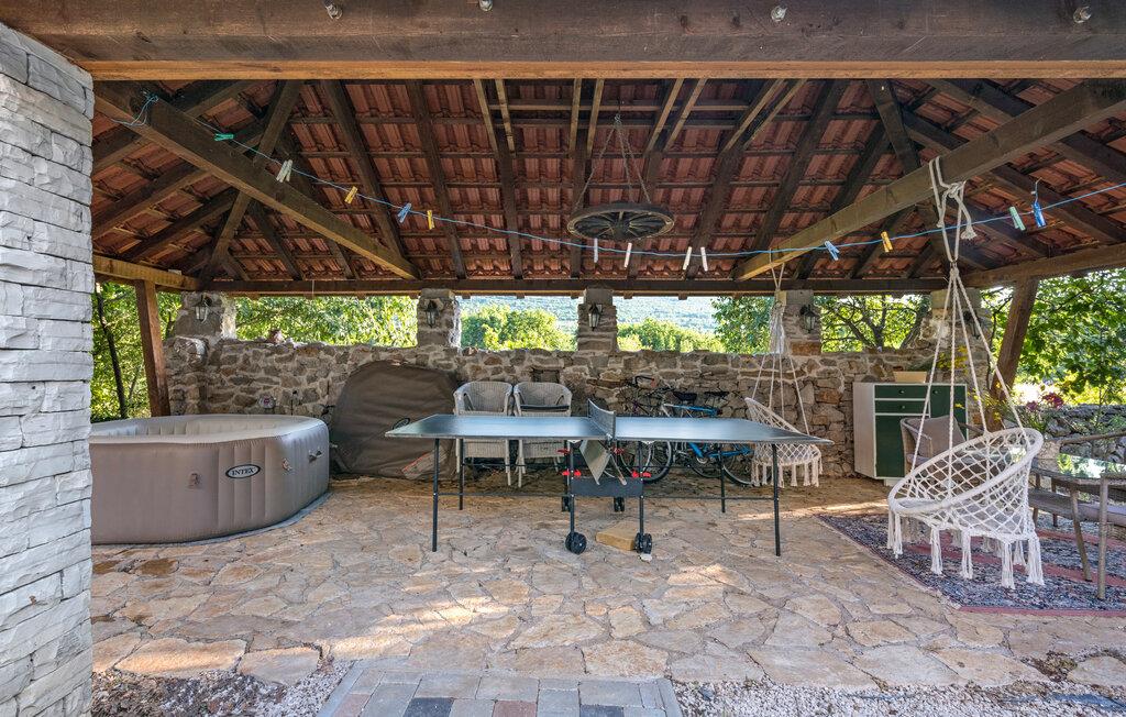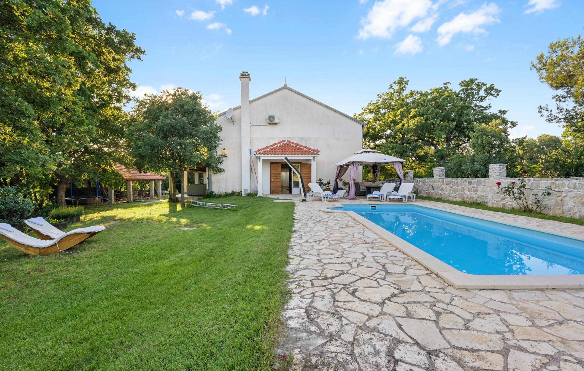 Dette komfortable og rustikt indrettede feriehus er med sin størrelse helt ideelt til store familier, som gerne vil holde ferie langt væk fra hverdagens stress og jag og slappe af uden at blive forstyrret. På grunden er der også en lækker swimmingpool, som lokker til en forfriskende dukkert. I stueplan imponerer huset med sit store spiseområde, hvor I alle sammen med garanti hurtigt finder jer en yndlingsplads! Her kan I sidde og nyde jeres måltider i fulde drag, mens snakken går. En trætrappe fører jer op til soveområdet. Derudover er der et lille tekøkken, hvor I kan tilberede jer et lille morgenmåltid. Til ejendommen hører der også nogle separate huse, hvor I finder en Konoba, en stengrill og et køkken. Fra den overdækkede terrasse kan I nyde den fantastiske udsigt. Har I lyst til at opleve naturen, er det oplagt at besøge nationalparken Krka, som kun ligger 2 km. fra huset. Særligt attraktiv er også udsigtstårnet, fra hvilket I både kan se nationalparken Kornati og øgruppen i ?ibenik.