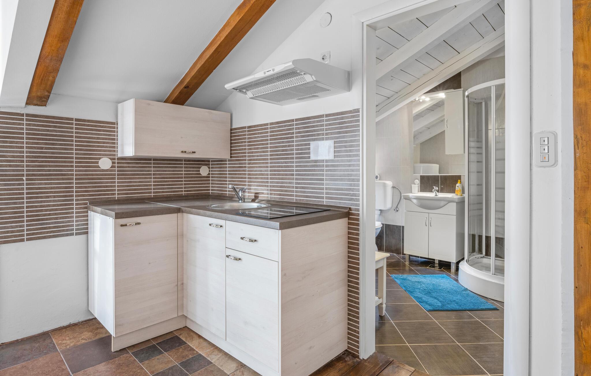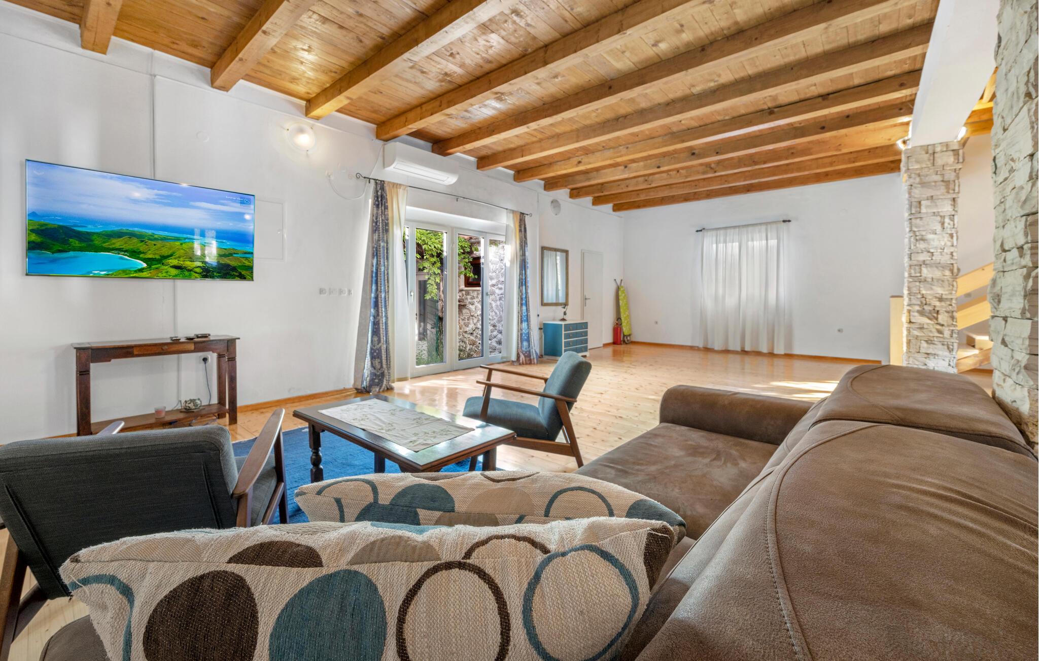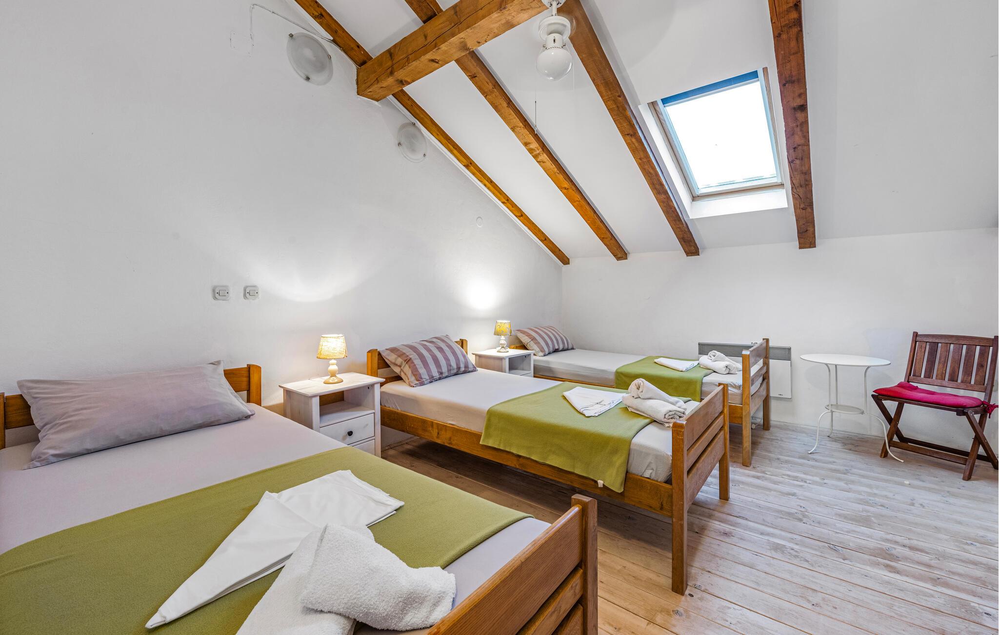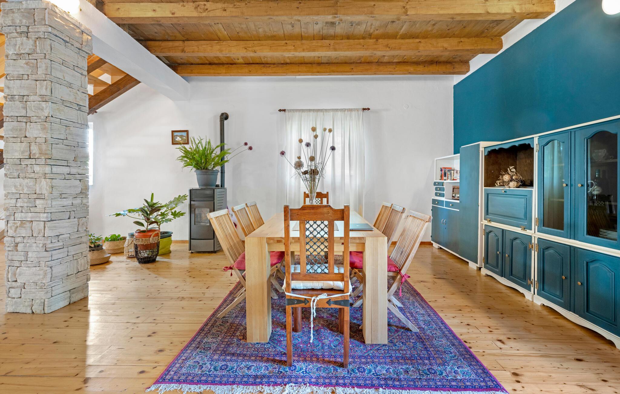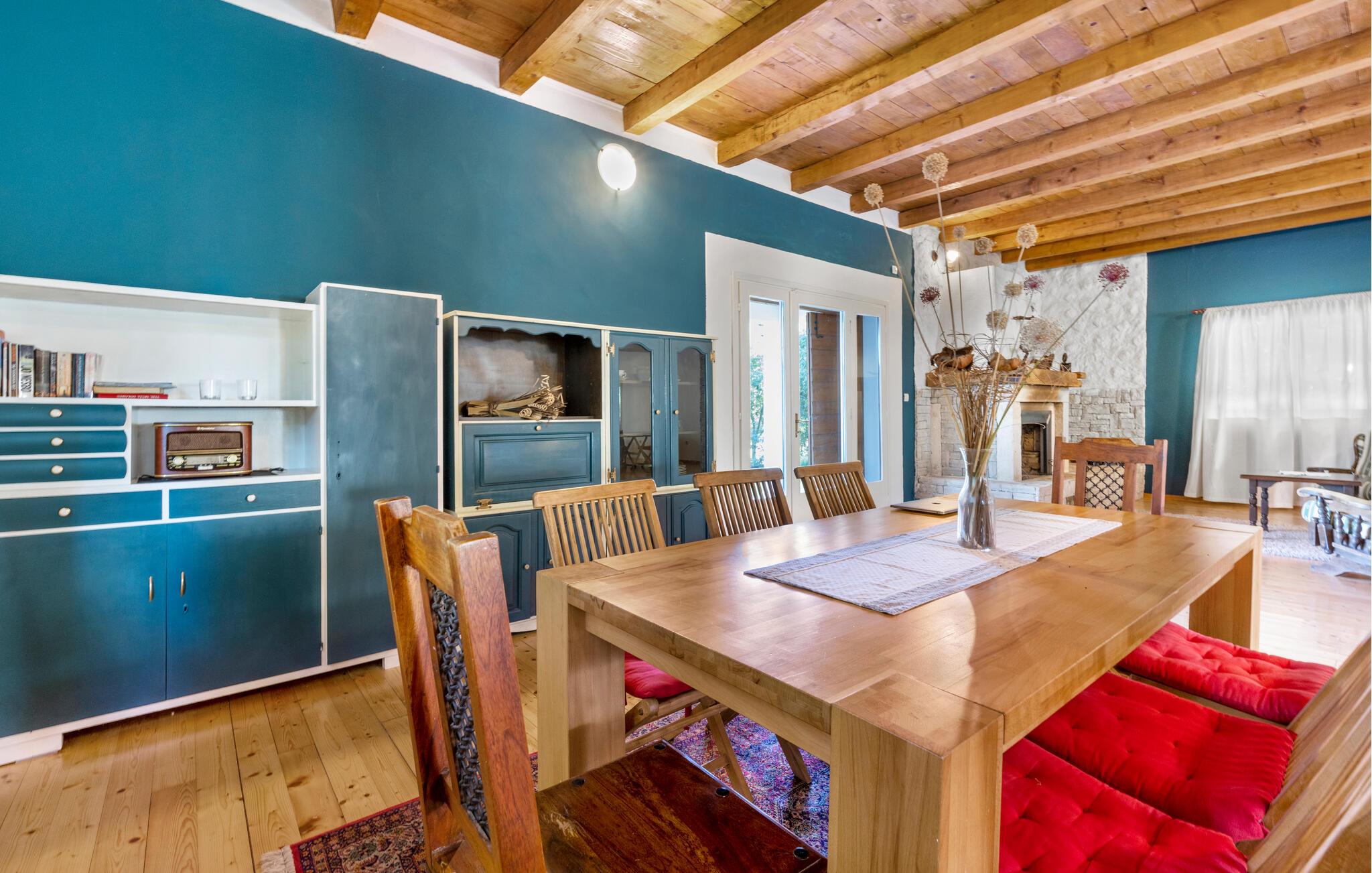Dette komfortable og rustikt indrettede feriehus er med sin størrelse helt ideelt til store familier, som gerne vil holde ferie langt væk fra hverdagens stress og jag og slappe af uden at blive forstyrret. På grunden er der også en lækker swimmingpool, som lokker til en forfriskende dukkert. I stueplan imponerer huset med sit store spiseområde, hvor I alle sammen med garanti hurtigt finder jer en yndlingsplads! Her kan I sidde og nyde jeres måltider i fulde drag, mens snakken går. En trætrappe fører jer op til soveområdet. Derudover er der et lille tekøkken, hvor I kan tilberede jer et lille morgenmåltid. Til ejendommen hører der også nogle separate huse, hvor I finder en Konoba, en stengrill og et køkken. Fra den overdækkede terrasse kan I nyde den fantastiske udsigt. Har I lyst til at opleve naturen, er det oplagt at besøge nationalparken Krka, som kun ligger 2 km. fra huset. Særligt attraktiv er også udsigtstårnet, fra hvilket I både kan se nationalparken Kornati og øgruppen i ?ibenik.