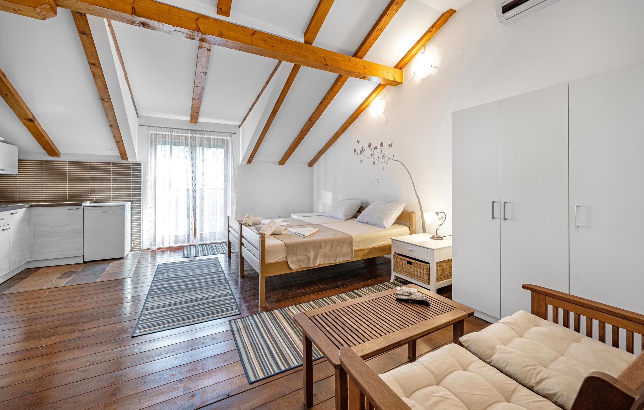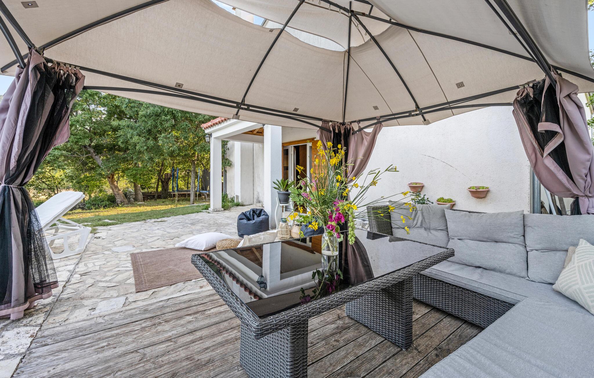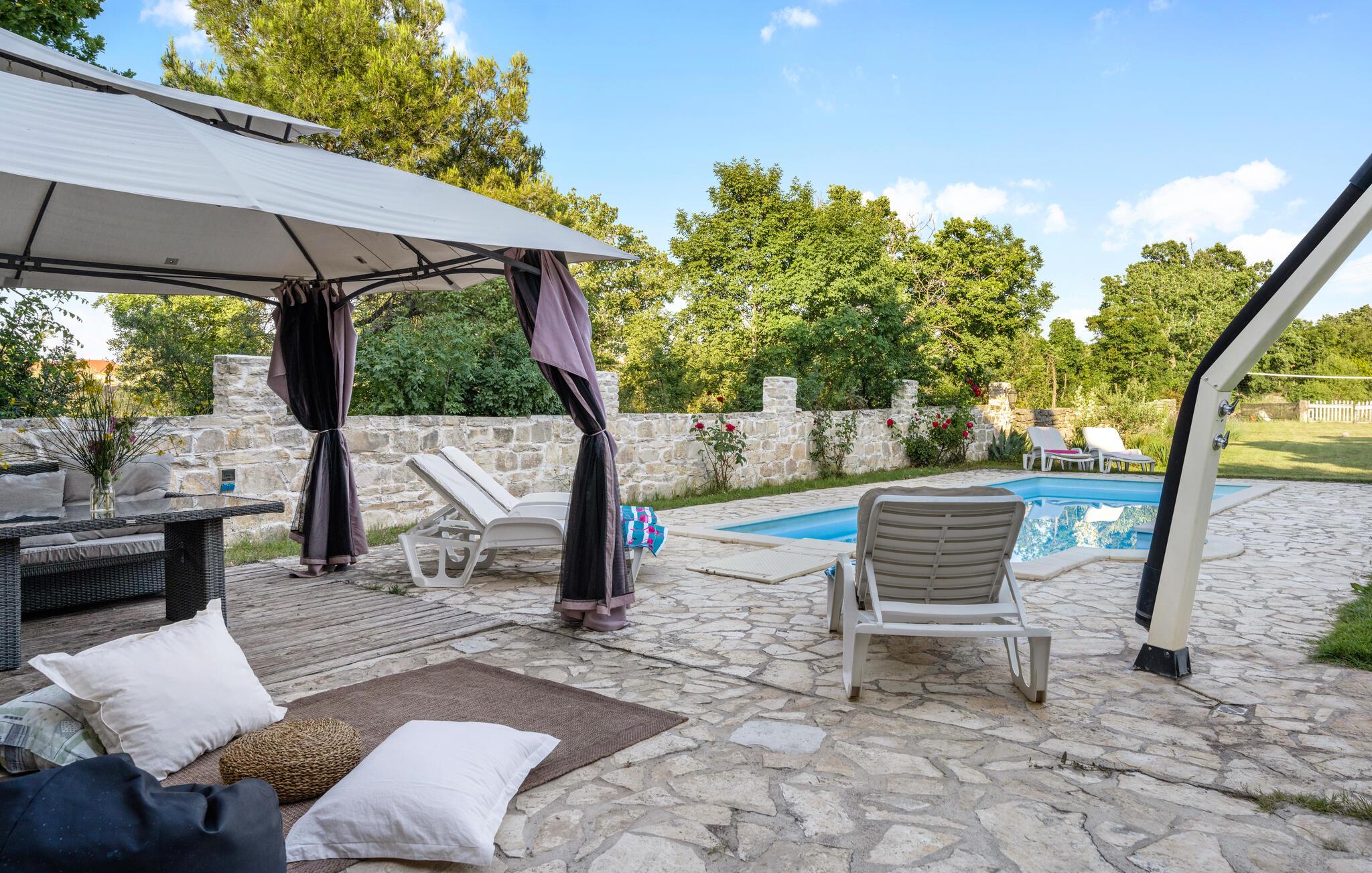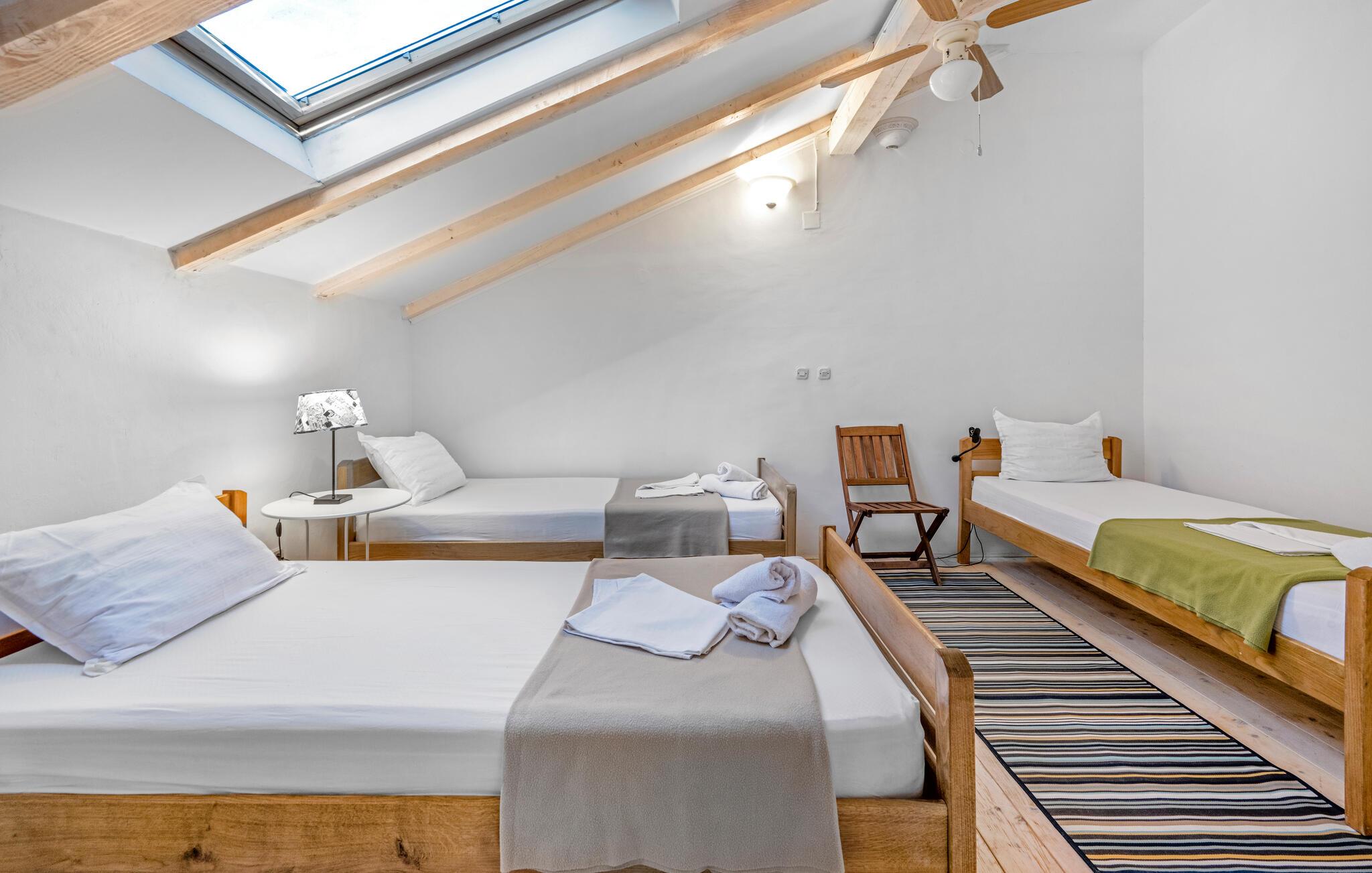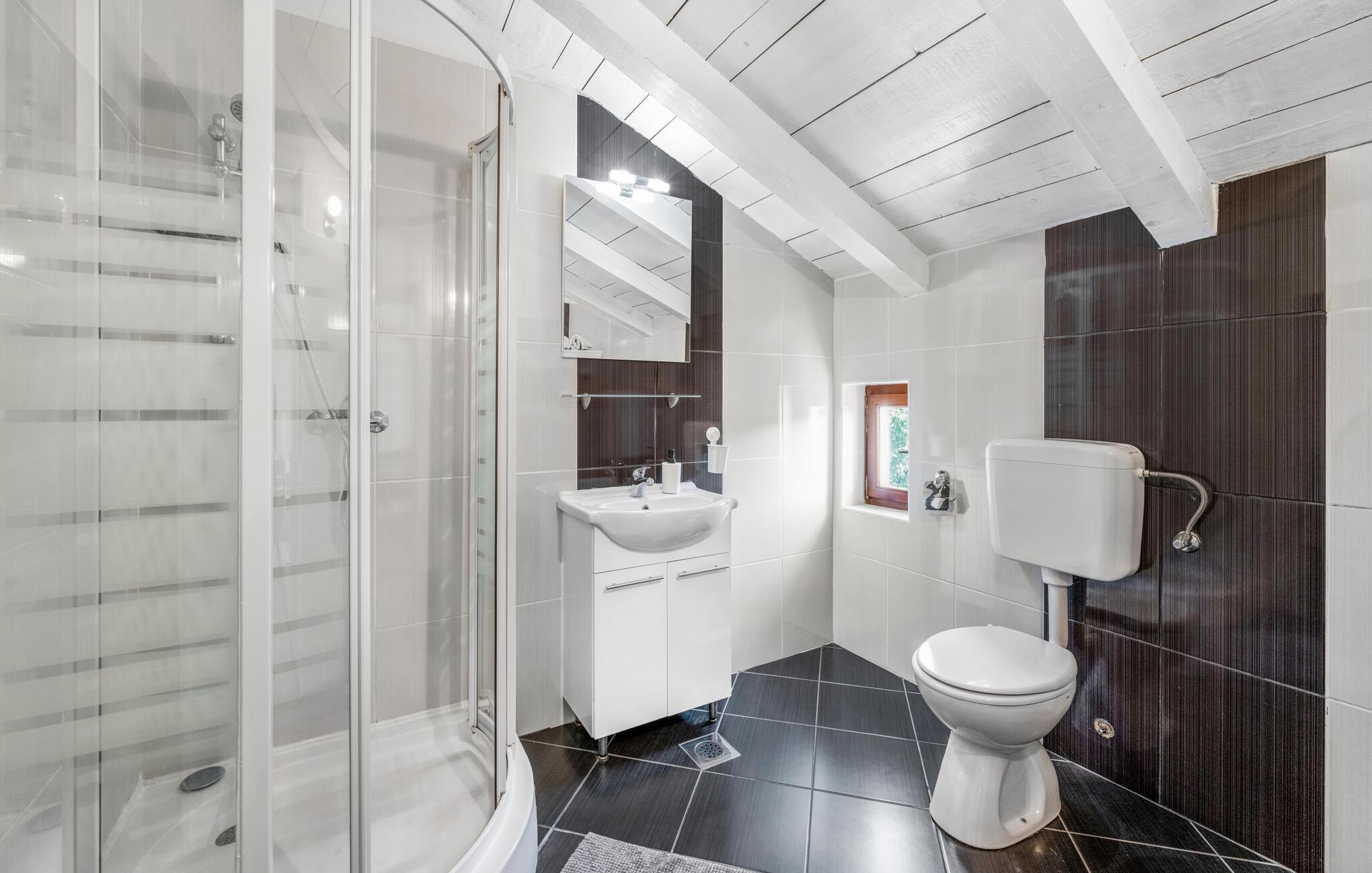 Dette komfortable og rustikt indrettede feriehus er med sin størrelse helt ideelt til store familier, som gerne vil holde ferie langt væk fra hverdagens stress og jag og slappe af uden at blive forstyrret. På grunden er der også en lækker swimmingpool, som lokker til en forfriskende dukkert. I stueplan imponerer huset med sit store spiseområde, hvor I alle sammen med garanti hurtigt finder jer en yndlingsplads! Her kan I sidde og nyde jeres måltider i fulde drag, mens snakken går. En trætrappe fører jer op til soveområdet. Derudover er der et lille tekøkken, hvor I kan tilberede jer et lille morgenmåltid. Til ejendommen hører der også nogle separate huse, hvor I finder en Konoba, en stengrill og et køkken. Fra den overdækkede terrasse kan I nyde den fantastiske udsigt. Har I lyst til at opleve naturen, er det oplagt at besøge nationalparken Krka, som kun ligger 2 km. fra huset. Særligt attraktiv er også udsigtstårnet, fra hvilket I både kan se nationalparken Kornati og øgruppen i ?ibenik.
