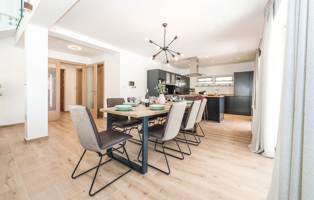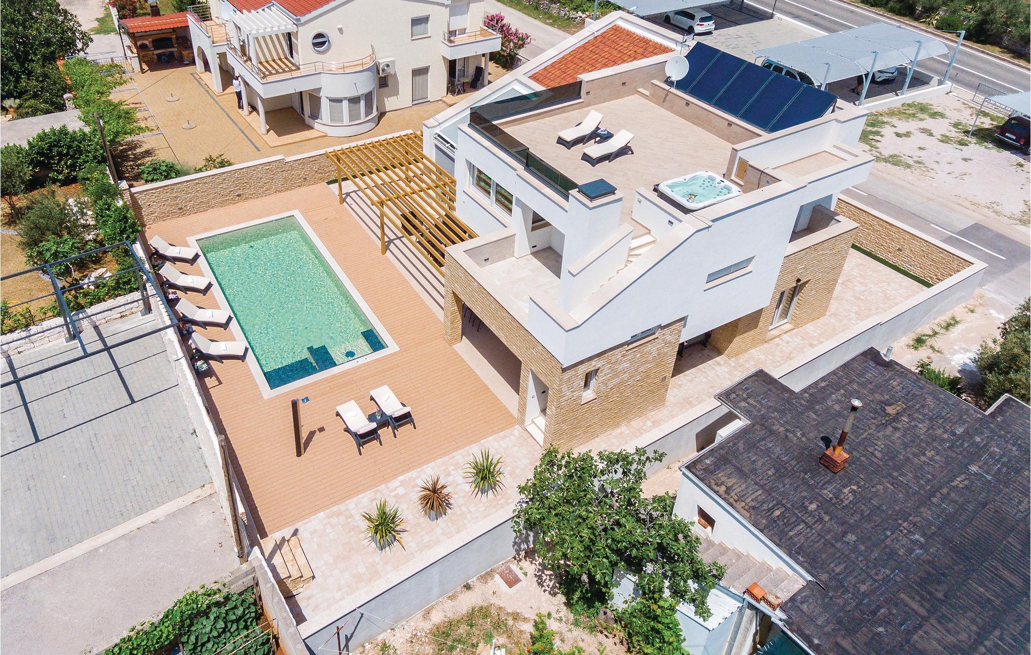 Lad ferien blive til noget særligt, og hold den i denne elegante ferievilla med egen pool. Betagende arkitektur, moderne design og alt i høj kvalitet, er betegnende for dette feriehus. På tagterrassen står whirlpoolen, hvor I kan nyde livet med panoramaudsigt over den skønne lille by Pirovac. I kan selvfølgelig også køle ned på de varme dage, med en tur i poolen. Lav mad på grillen og nyd den under åben himmel, mens mørket sænker sig. Der er kun 300 m til den nærmeste kiesstrand hvor I kan tilbringe dejlige badedage. Beliggenheden er perfekt til udflugter: fx til den nærliggende skønne ø Murter, som er porten til Nationalpark Kornati-øgruppen. Besøg de spændende byer Sibenik og Zadar, med kultur, historie og sommerunderholdning samt den nærliggende livlige lille by Vodice.