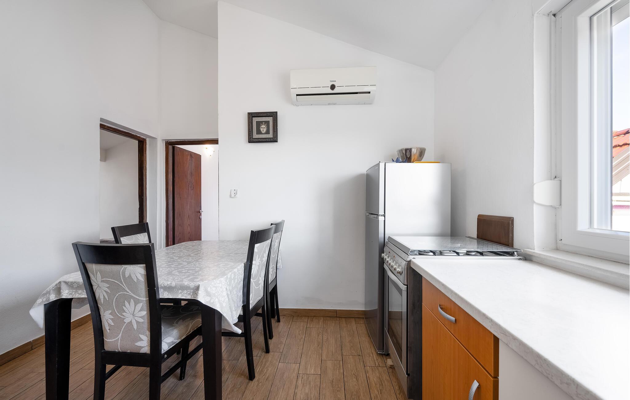 Denne moderne ferielejlighed byder på et lyst, minimalistisk indrettet interiør, der skaber en indbydende atmosfære. Det lyse køkken har alt, hvad I skal bruge for at tilberede lækre måltider. Her finder I også en hyggelig spiseplads, hvor I kan nyde aftener med familie eller venner og planlægge jeres kommende feriedage.