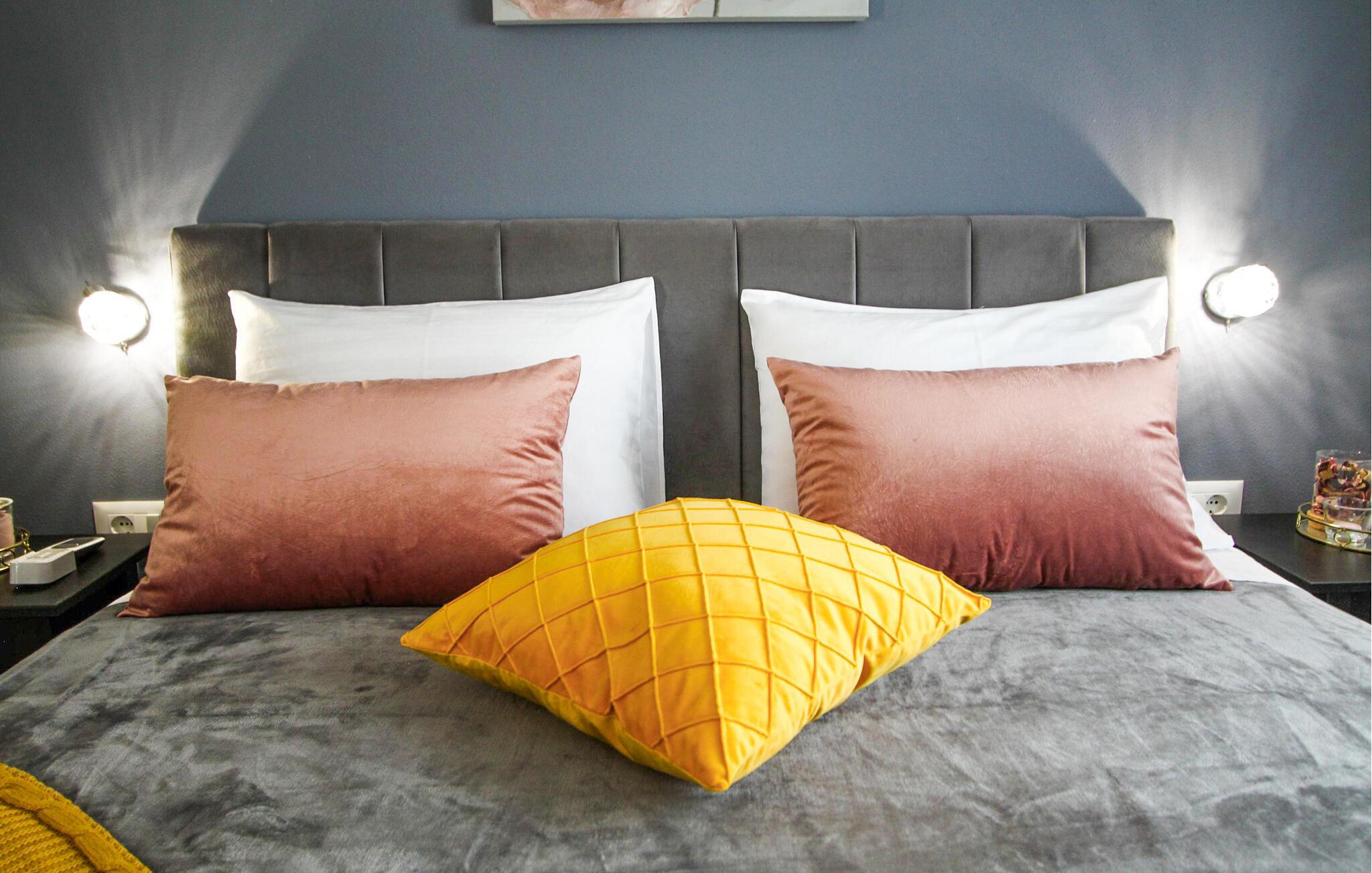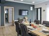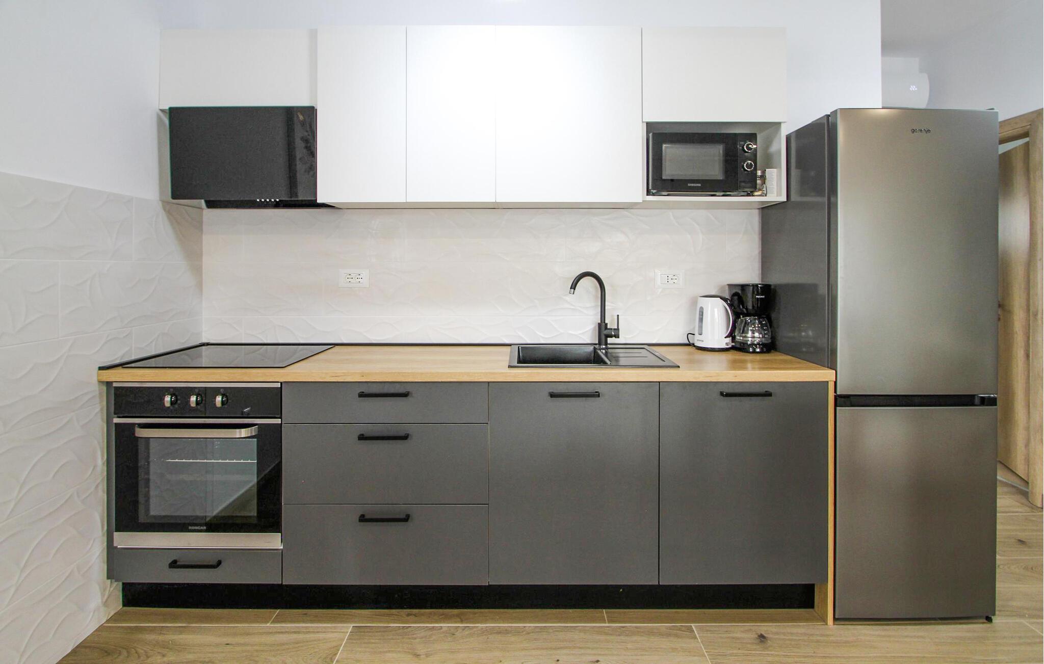 Det moderne og rummelige interiør med elegante linjer og traditionel charme er det optimale valg for familier eller vennegrupper. Bløde farver og tilføjelsen af ??træ forstærker den afslappede atmosfære. Den luftige stue, der er forbundet med det elegante køkken, giver et behageligt miljø til socialt samvær.
