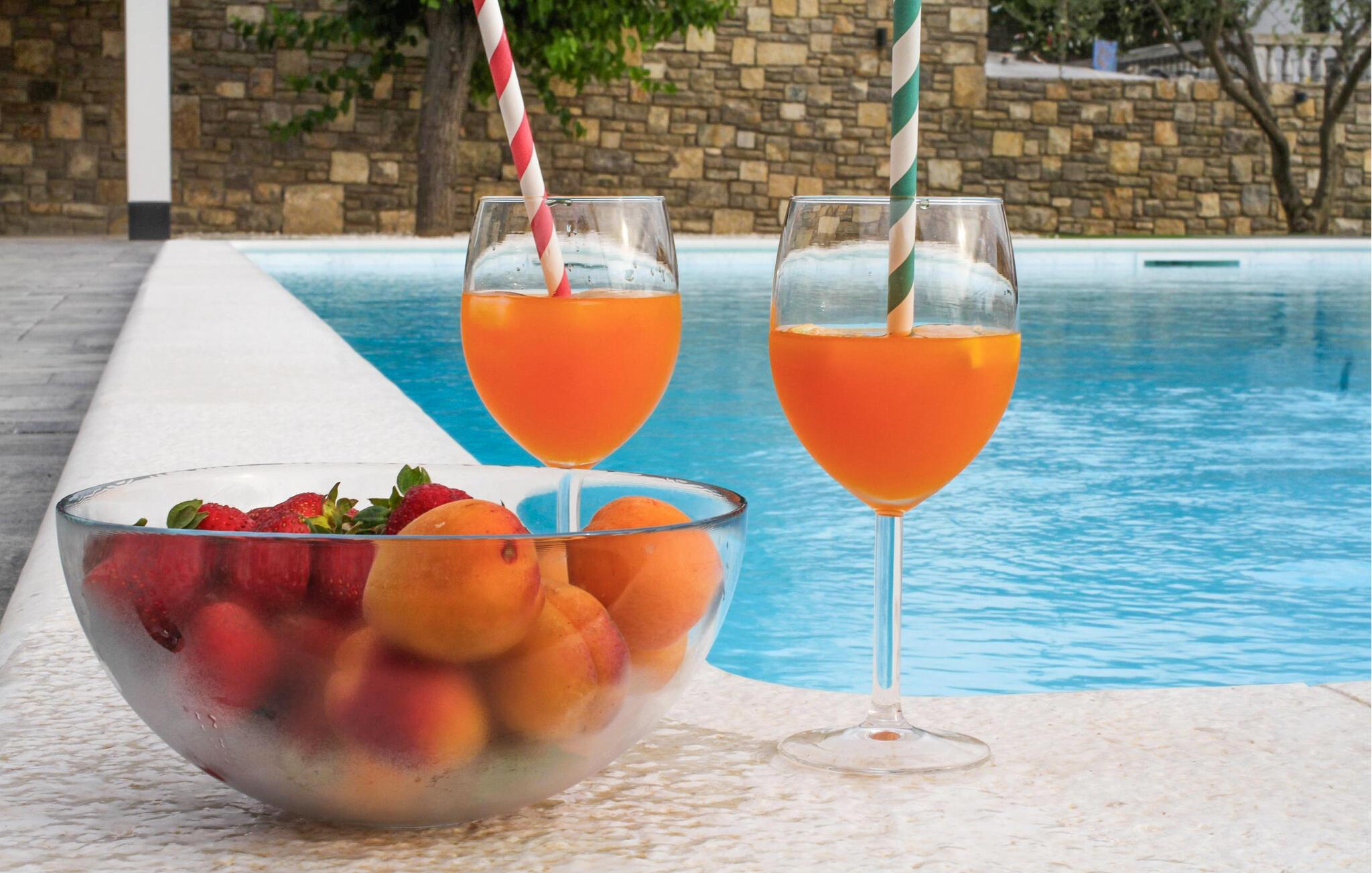 Går I ud på terrassen, kan I spise morgenmad med en vidunderlig udsigt. Villaens højdepunkt er utvivlsomt det omfattende udendørs område, skjult af stenmure, hvilket giver jer fuldstændig privatliv. Her kan I slappe af, køle ned eller solbade ved den private, store saltvandspool med massagebænk.