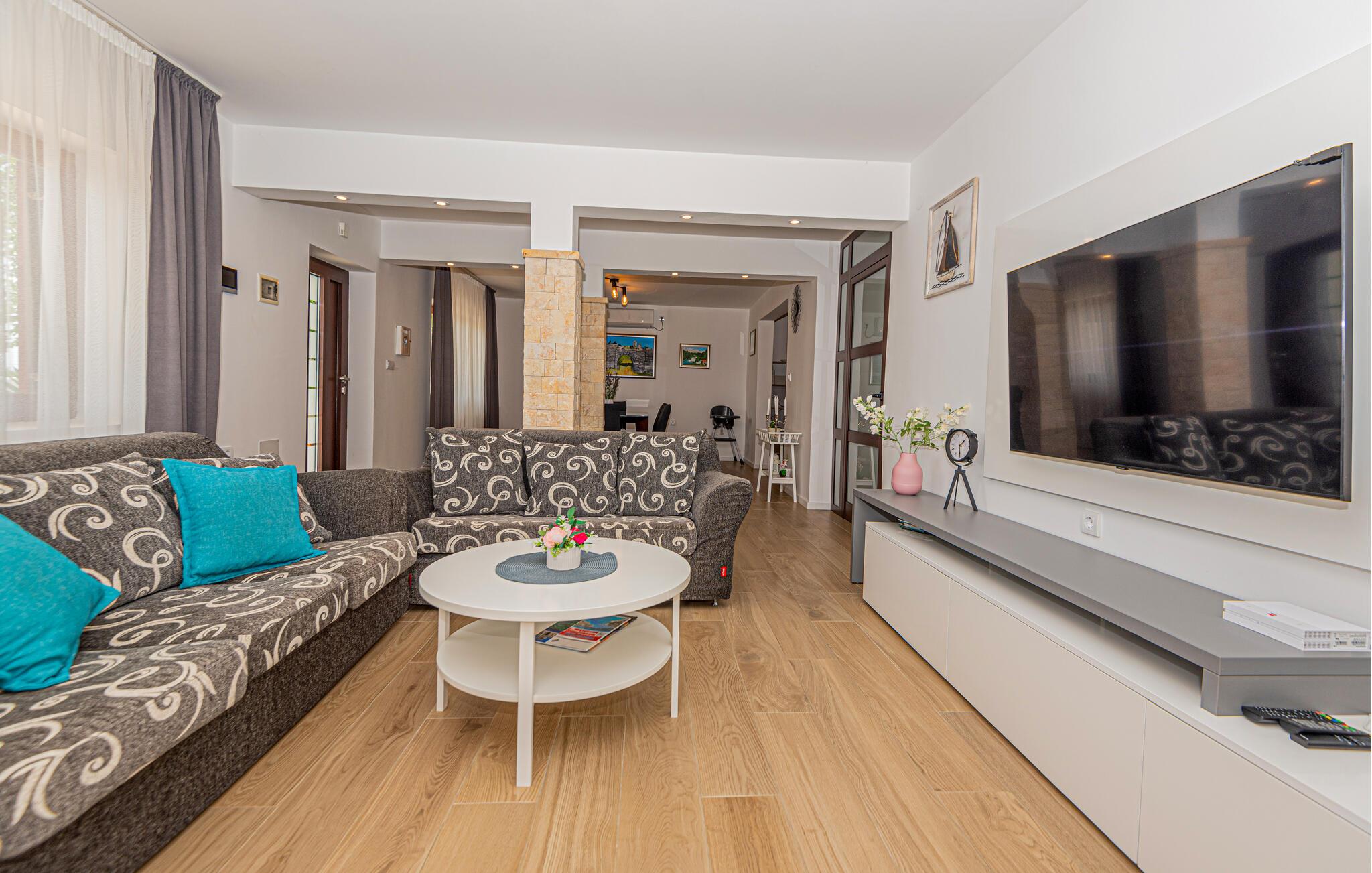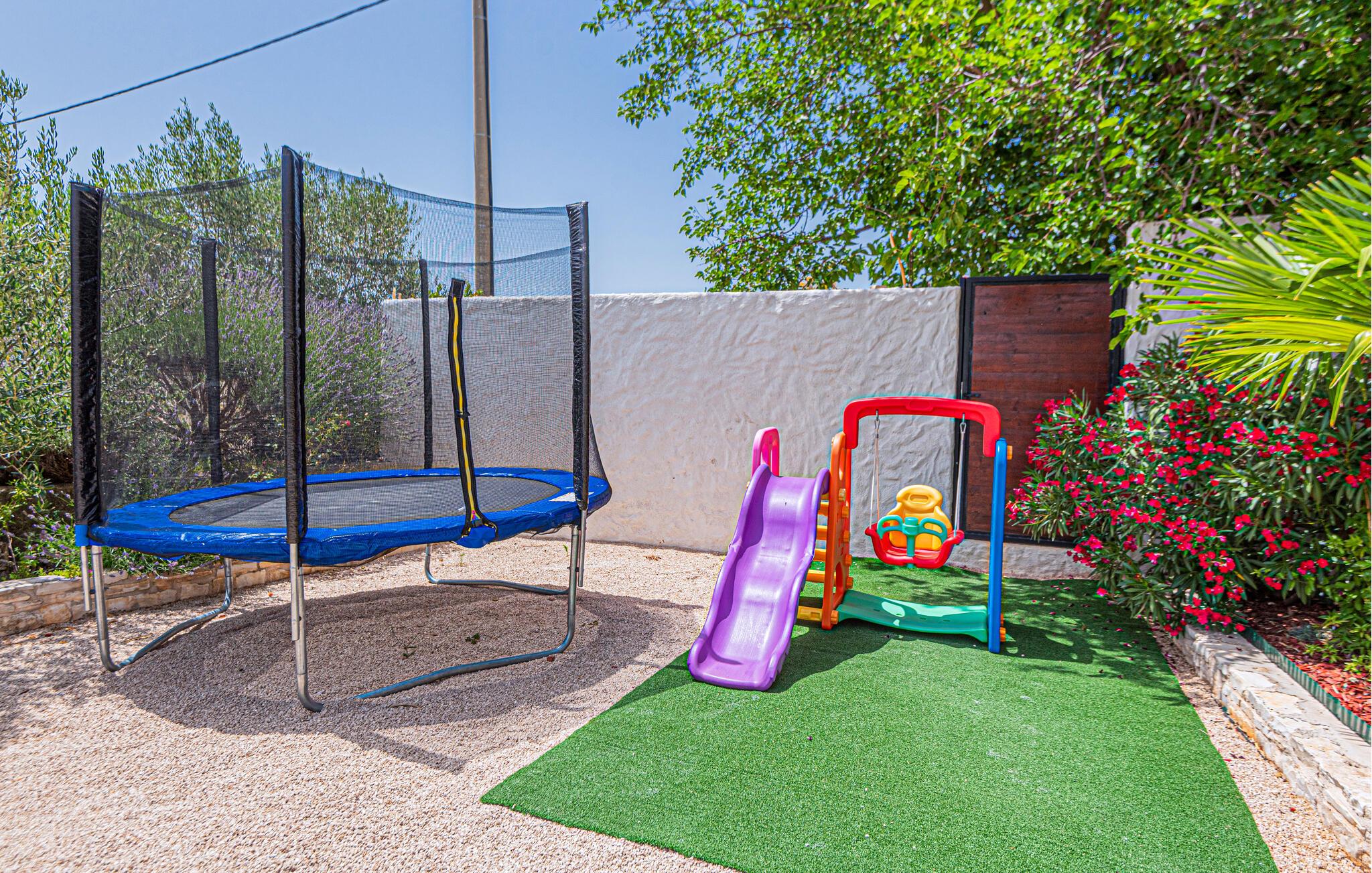 Nyd solen ude i det smukke poolområde, slap af på liggestolene eller tag en dukkert i den udendørs pool. I mellemtiden kan børnene lege og være aktive med deres kæledyr på den store ejendom. Om aftenen inviterer terrasserne med havemøbler jer til at holde hyggelige grillmiddage sammen med familie eller venner.