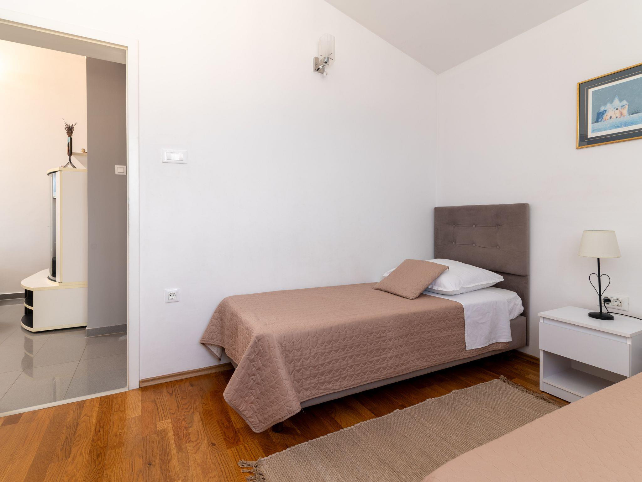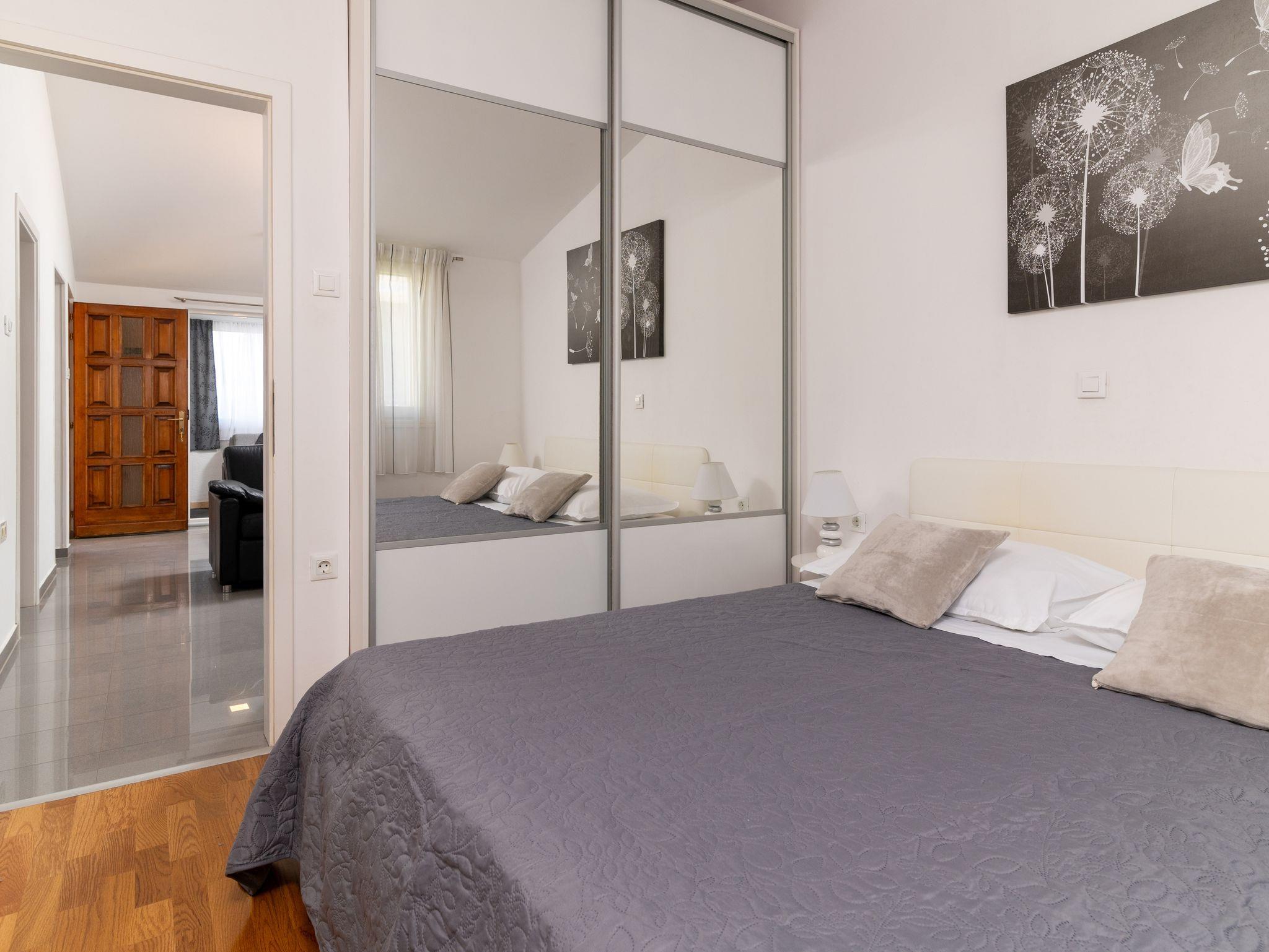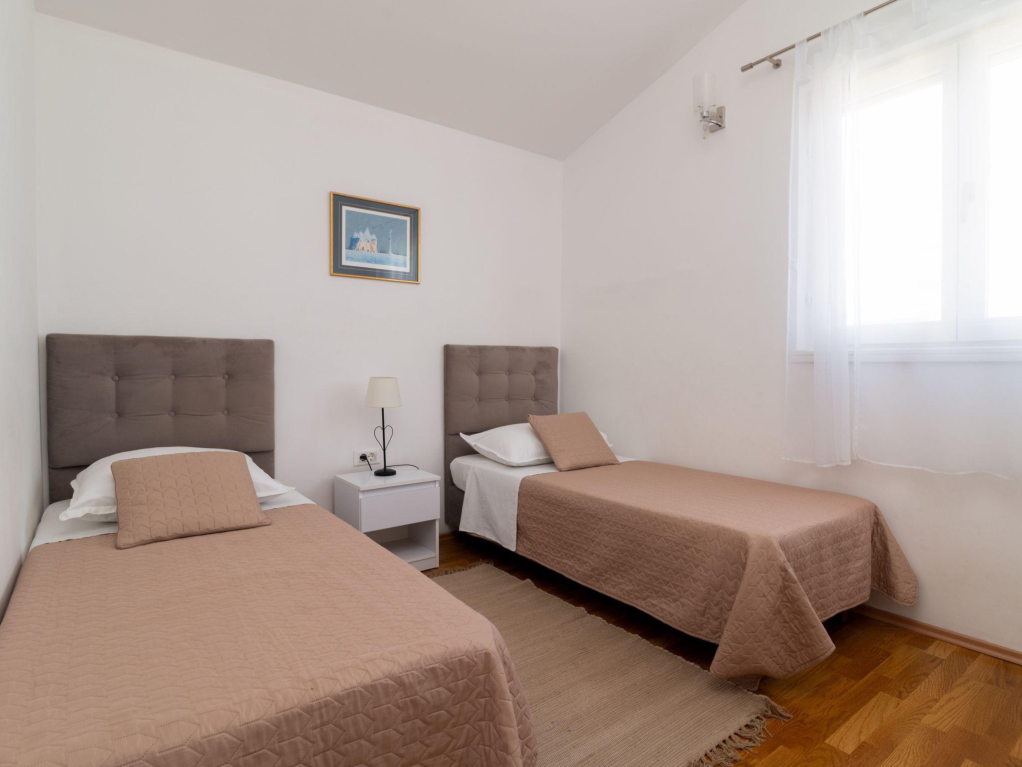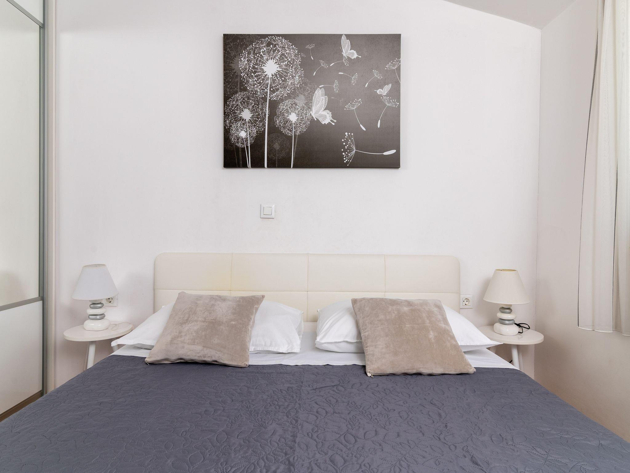 Ferienwohnung bietet Platz für 5 Gäste. Die Betten sind in Schlafzimmern, die es 2 gibt, und in Wohnzimmer, innerhalb einer Gesamtfläche von 48m2, angeordnet. Die Gäste haben eine eigene Terrasse zur Verfügung, auf der sie in warmen Sommernächten genießen können. Das Apartment bietet Meerblick. Für vollen Genuss und Entspannung gibt es einen privaten Grill für Gäste dieser Unterkunft. IM PREIS INBEGRIFFEN: Kurtaxe, Endreinigung, Klimatisierung, Parkplatz, Internet, Bügeleisen, Bügelbrett, Föhn, Sonnenschirm. Die Verfügbarkeit zusätzlicher Dienstleistungen in Ihrem reservierten Termin und die Preise derselben (falls nicht aufgeführt) müssen im Voraus überprüft werden. Zusätzliche Dienstleistungen die in der Zahlungsaufforderung nicht aufgeführt sind werden direkt beim Vermieter bezahlt, angenommen der Gast nutzt auch diese.