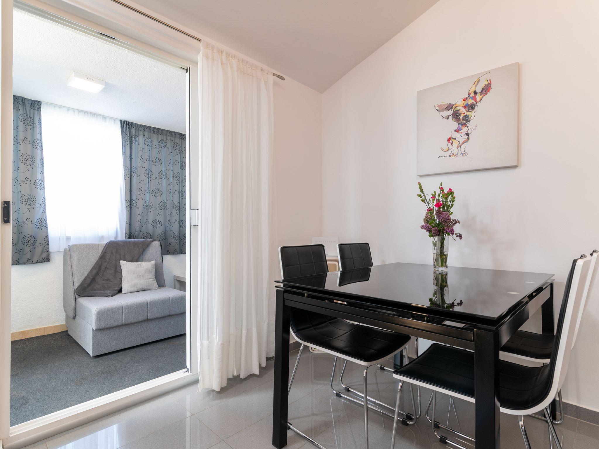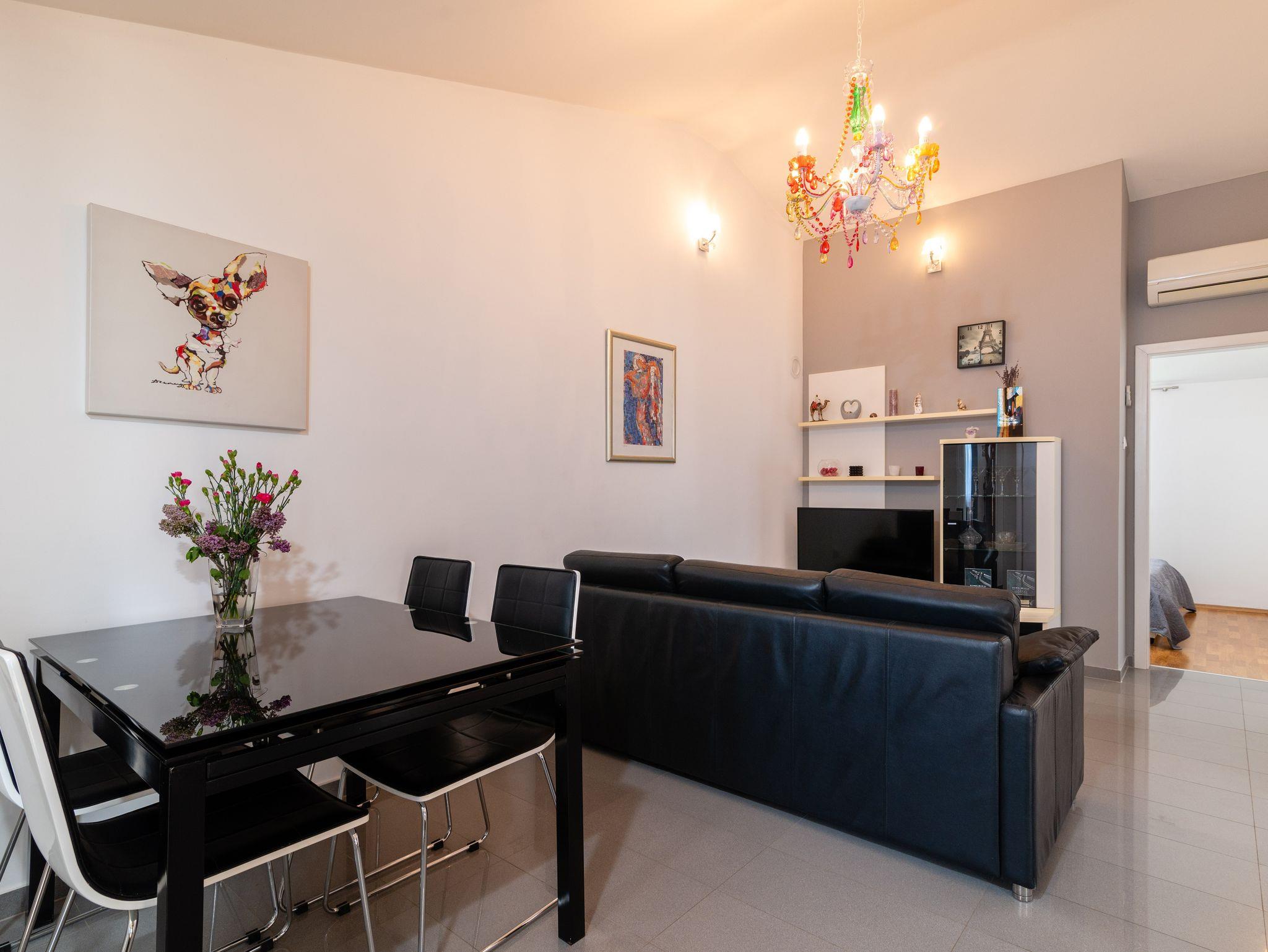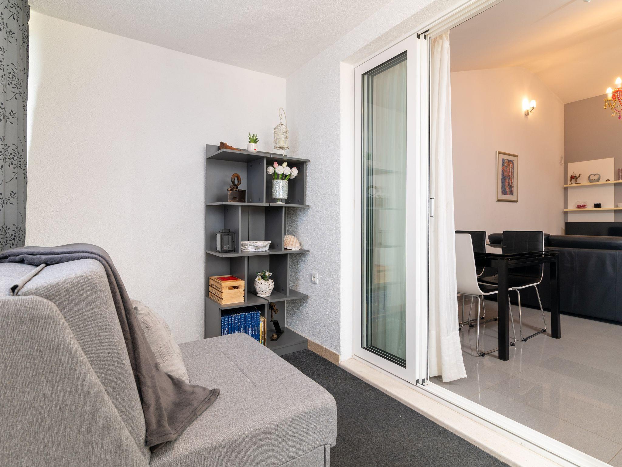 Ferienwohnung bietet Platz für 5 Gäste. Die Betten sind in Schlafzimmern, die es 2 gibt, und in Wohnzimmer, innerhalb einer Gesamtfläche von 48m2, angeordnet. Die Gäste haben eine eigene Terrasse zur Verfügung, auf der sie in warmen Sommernächten genießen können. Das Apartment bietet Meerblick. Für vollen Genuss und Entspannung gibt es einen privaten Grill für Gäste dieser Unterkunft. IM PREIS INBEGRIFFEN: Kurtaxe, Endreinigung, Klimatisierung, Parkplatz, Internet, Bügeleisen, Bügelbrett, Föhn, Sonnenschirm. Die Verfügbarkeit zusätzlicher Dienstleistungen in Ihrem reservierten Termin und die Preise derselben (falls nicht aufgeführt) müssen im Voraus überprüft werden. Zusätzliche Dienstleistungen die in der Zahlungsaufforderung nicht aufgeführt sind werden direkt beim Vermieter bezahlt, angenommen der Gast nutzt auch diese.