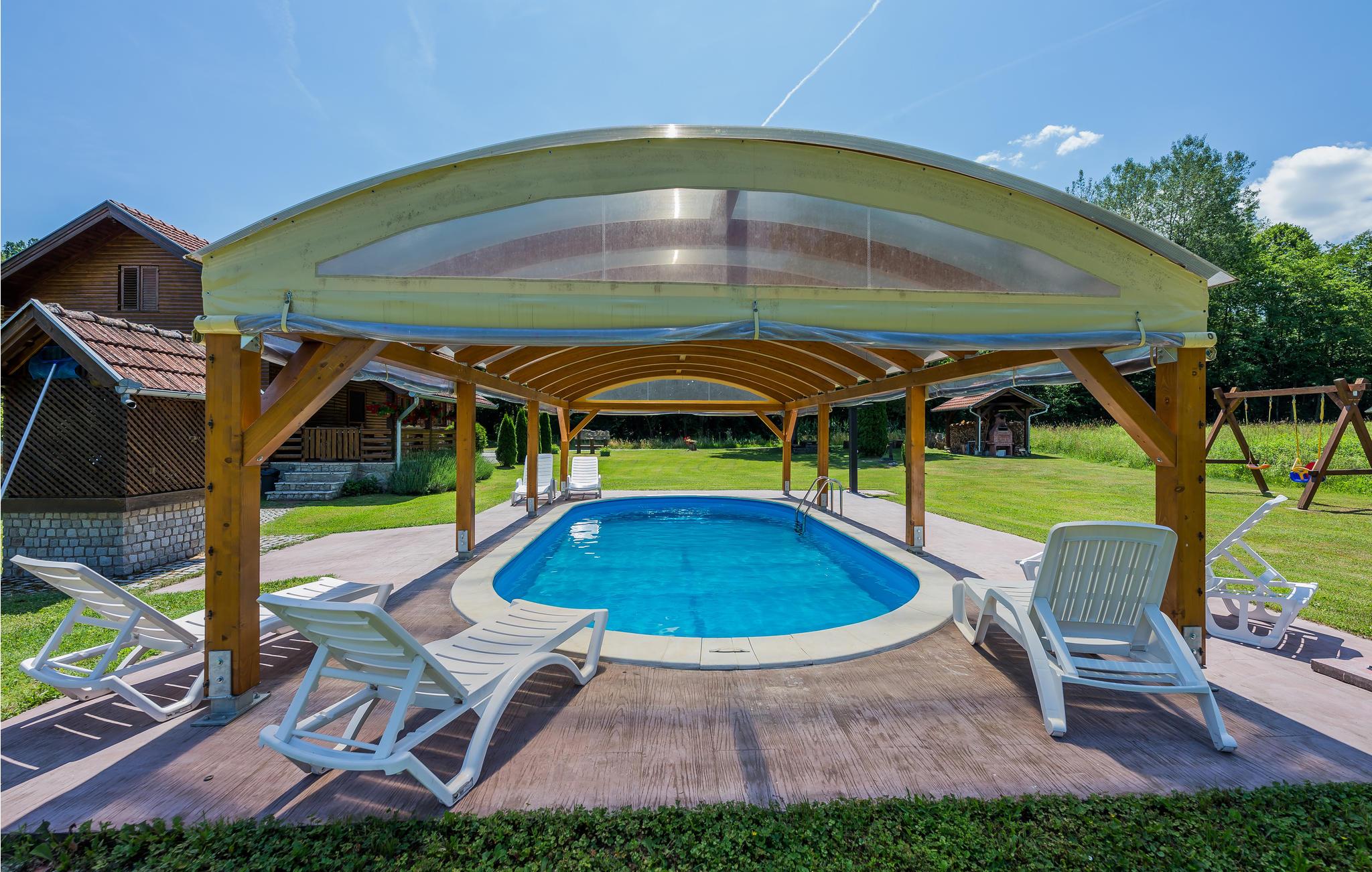 Nyd forfriskninger i den private pool på varme dage. I kan slappe af på flere terrasser, der er et legehus og en gynge på ejendommen til børnene.