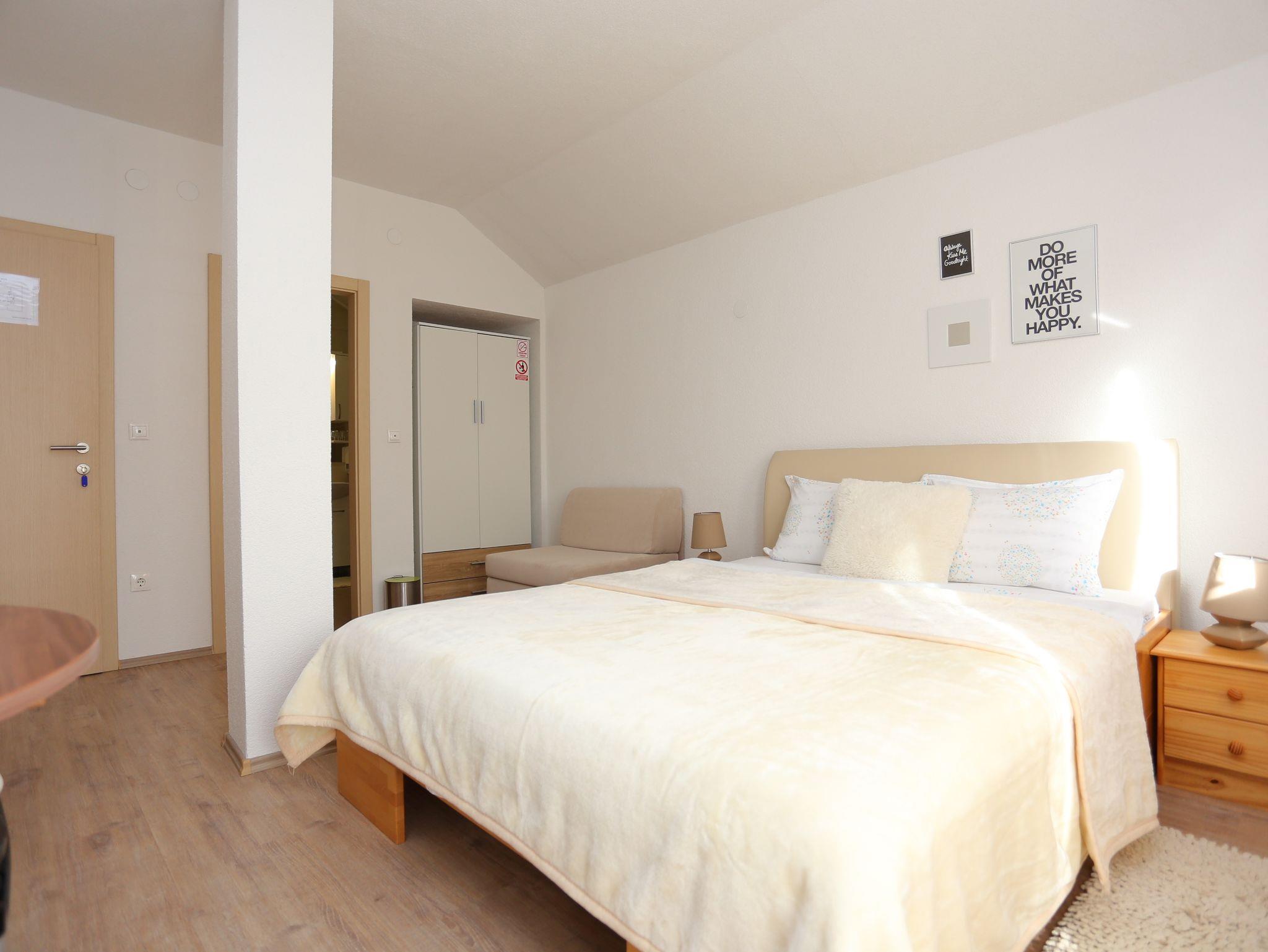 Zimmer bietet Platz für 2 Gäste. Die Betten sind in Schlafzimmern, die es 1 gibt, innerhalb einer Gesamtfläche von 20m2, angeordnet. Die reservierte Unterkunftseinheit ist ein Zimmer mit eigenem Badezimmer ohne die Möglichkeit der Nutzung einer Küche. Die reservierte Unterkunftseinheit verfügt über einen gemeinsamen Balkon. Die reservierte Unterkunftseinheit verfügt über einen gemeinsame Terrasse. IM PREIS INBEGRIFFEN: Kurtaxe, Endreinigung, Klimatisierung, Zentralheizung, Parkplatz, Internet, Kinderbett, Bügeleisen, Bügelbrett, Föhn. UNVERBINDLICHE ZUSÄTZLICHE KOSTEN: Frühstück (5,00 €, 50% Nachlass für Kinder zwischen 4 und 12 Jahren, Kinder bis 4 Jahre sind frei.), Wäschewaschen (5,00 € Waschen). Die Verfügbarkeit zusätzlicher Dienstleistungen in Ihrem reservierten Termin und die Preise derselben (falls nicht aufgeführt) müssen im Voraus überprüft werden. Zusätzliche Dienstleistungen die in der Zahlungsaufforderung nicht aufgeführt sind werden direkt beim Vermieter bezahlt, angenommen der Gast nutzt auch diese.
