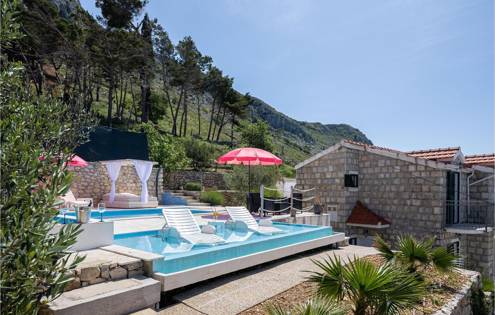 Et feriehus med herlig havudsigt i en fredet landsby. Huset er praktisk indrettet og opdelt. I stueplan finder I badeværelse og stue i åben kombination med køkken, mens de tre soveværelser og badeværelset ligger på første sal. I kommer fra parkeringspladsen og op til huset via trapper. På terrassen foran huset er en grill. Bag huset går en trappe op til en yderligere terrasse. I haven vokser biodynamisk grønt og frugt, som I kan plukke som I har lyst. En del af grunden ligger i en skov, hvis træer kaster behagelig skygge. Der er kun få minutter i bil til Split hvor der er meget at se og opleve. Snoet, stejl tilkørselsvej.