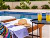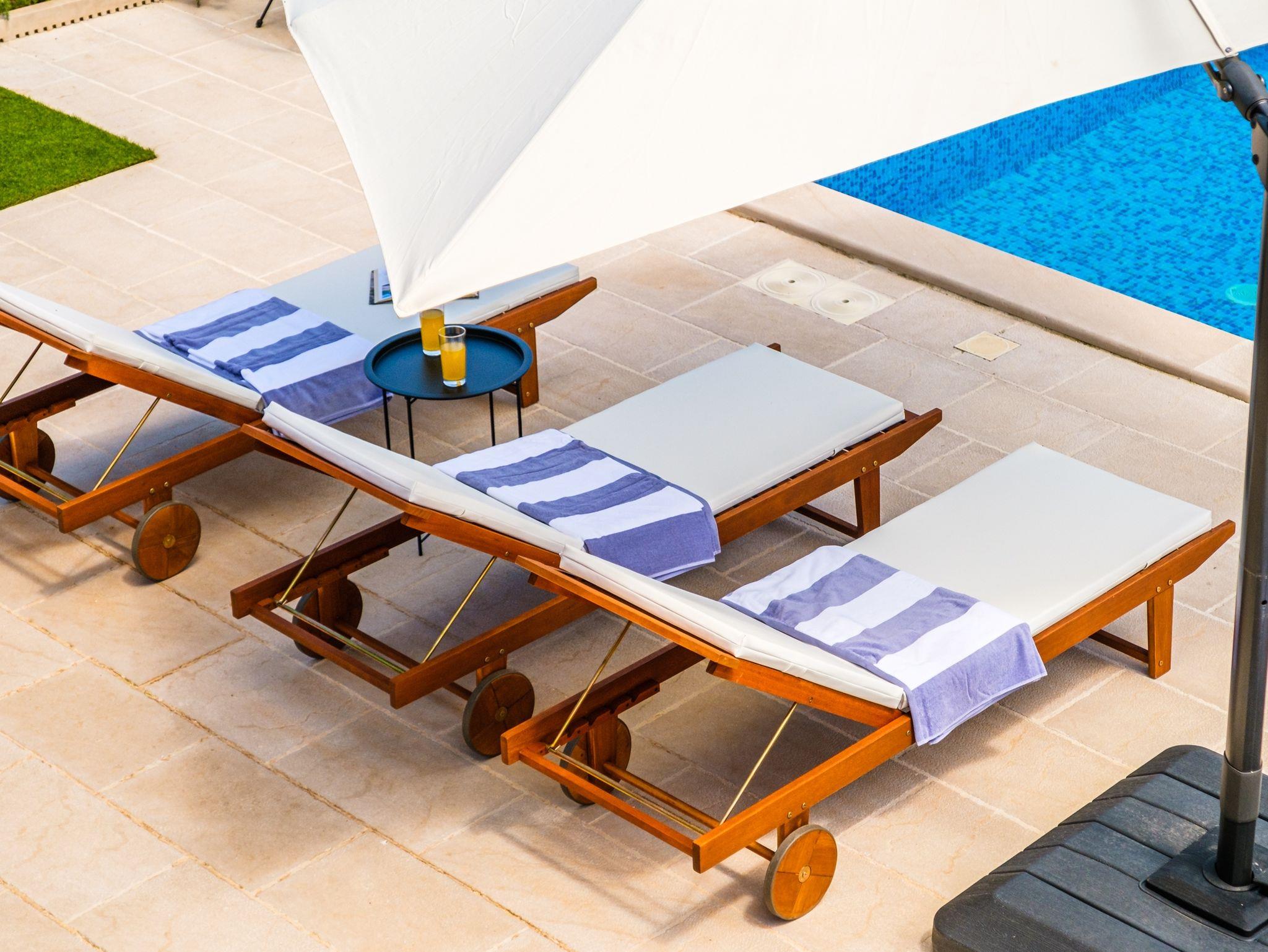Hof (400m2, Kinderbereich, Sitzbereich), Parkplatz (Anzahl der Parkplätze: 5, Entfernung vom Objekt: im Hof), Pool: privat, Dimensionen: 7.5m x 3.4m x 1.4m, Wassertyp: Süßwasser, WiFi Internet, Föhn, Bügeleisen, Bügelbrett, Sonnenschirm, Liegestühle, Kinderbett