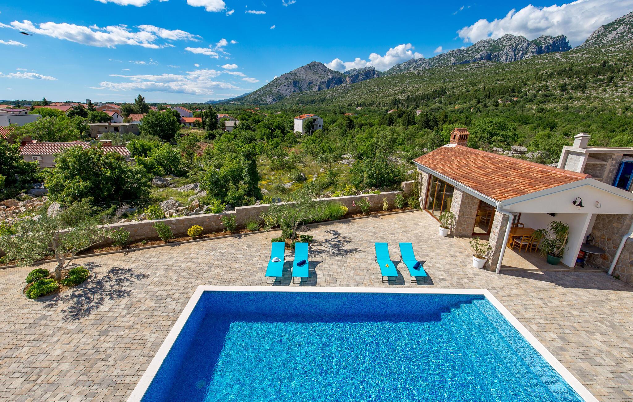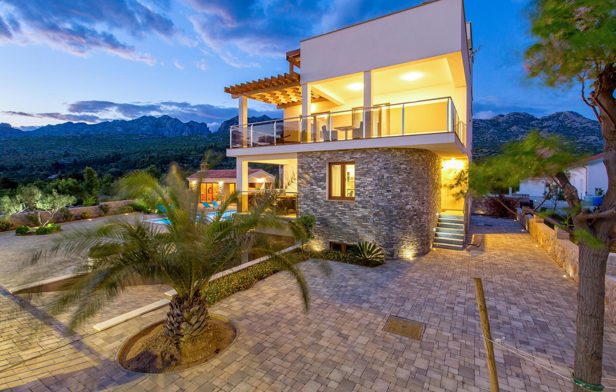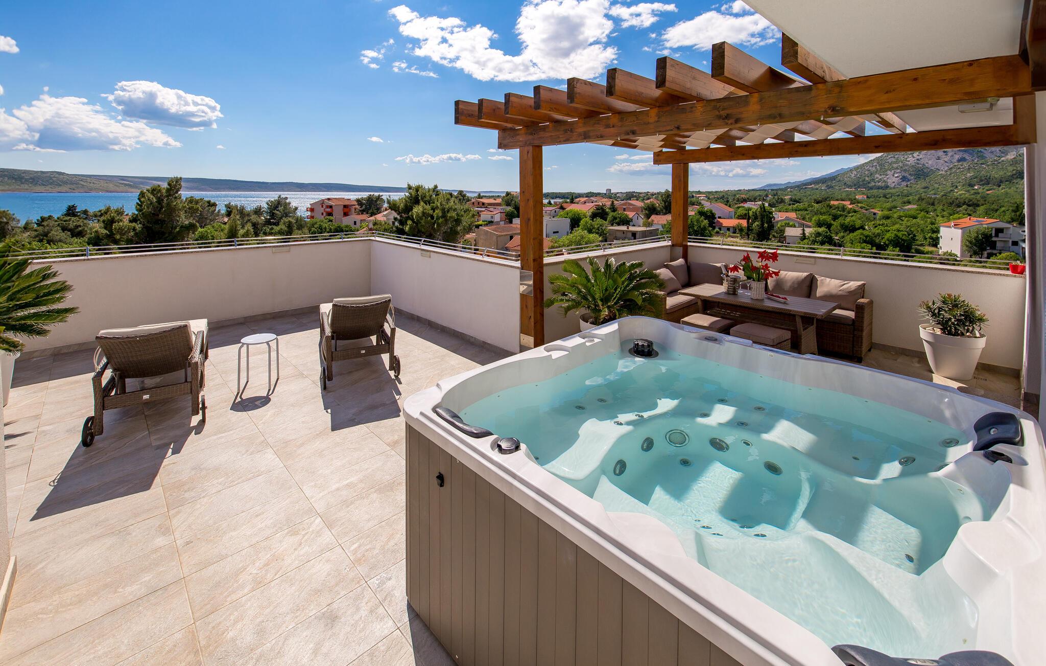 Dit rummelige feriehus ligger i Seline, et idyllisk sted ved foden af ??de majestætiske Velebit-bjerge. Start dagen afslappet med en familiemorgenmad ved det smukke træspisebord med udsigt over haven eller ved et af bordene udenfor og diskuter jeres planer for dagen i fred. Forkæl jer selv med et afslappende solbad ved poolen og lad jeres blik vandre over det smukke landskab og det nærliggende hav. Svøm et par længder i ny og næ og nyd det forfriskende vand. Ren afslapning er også dagens orden i spabadet på terrassen på øverste etage og i den interne sauna.