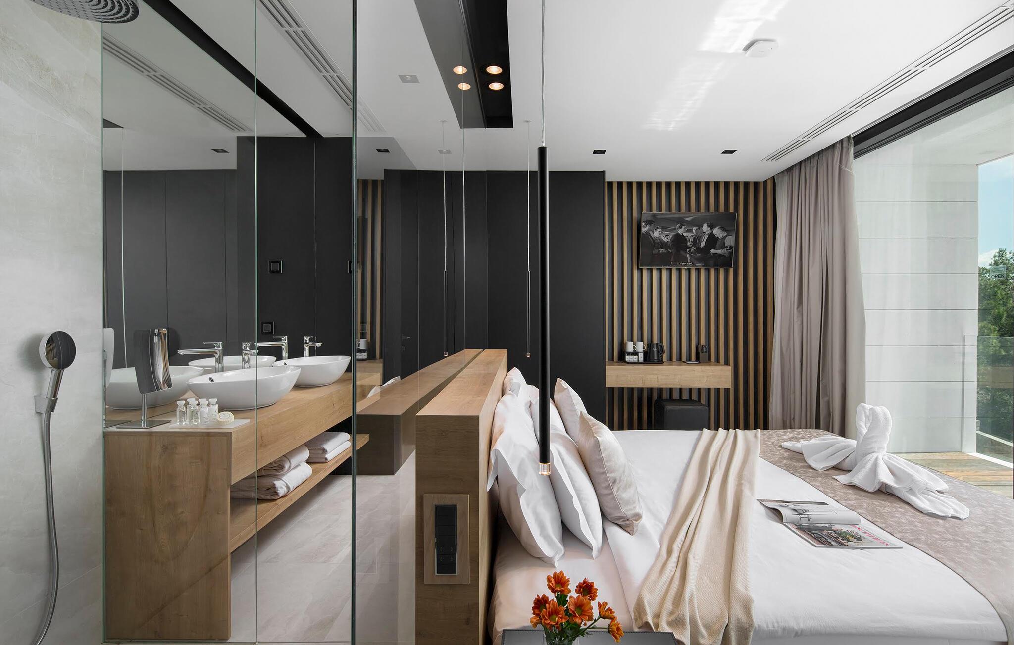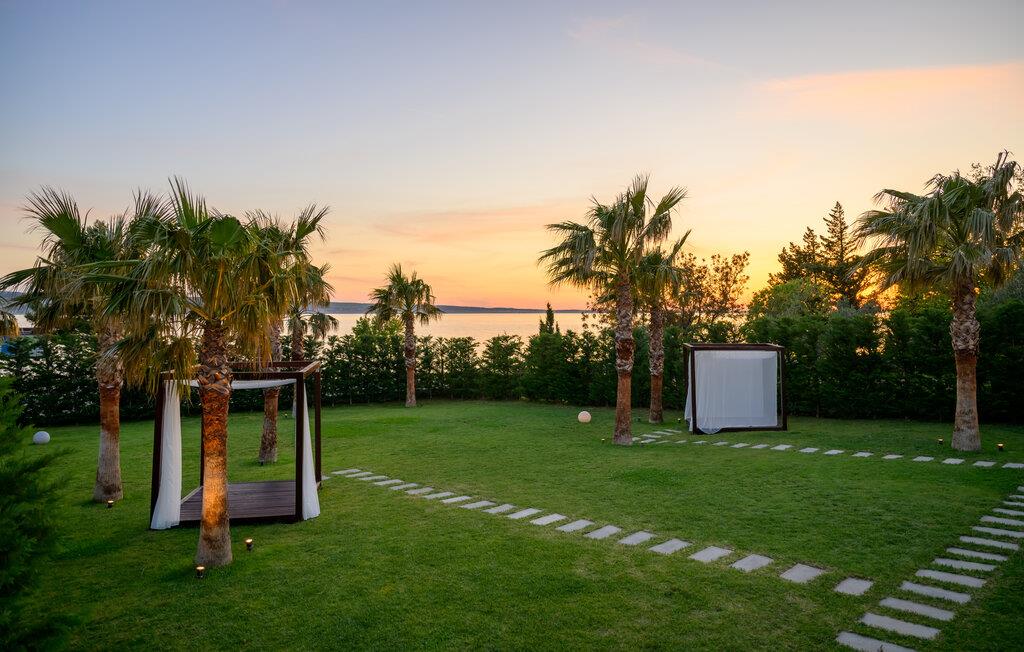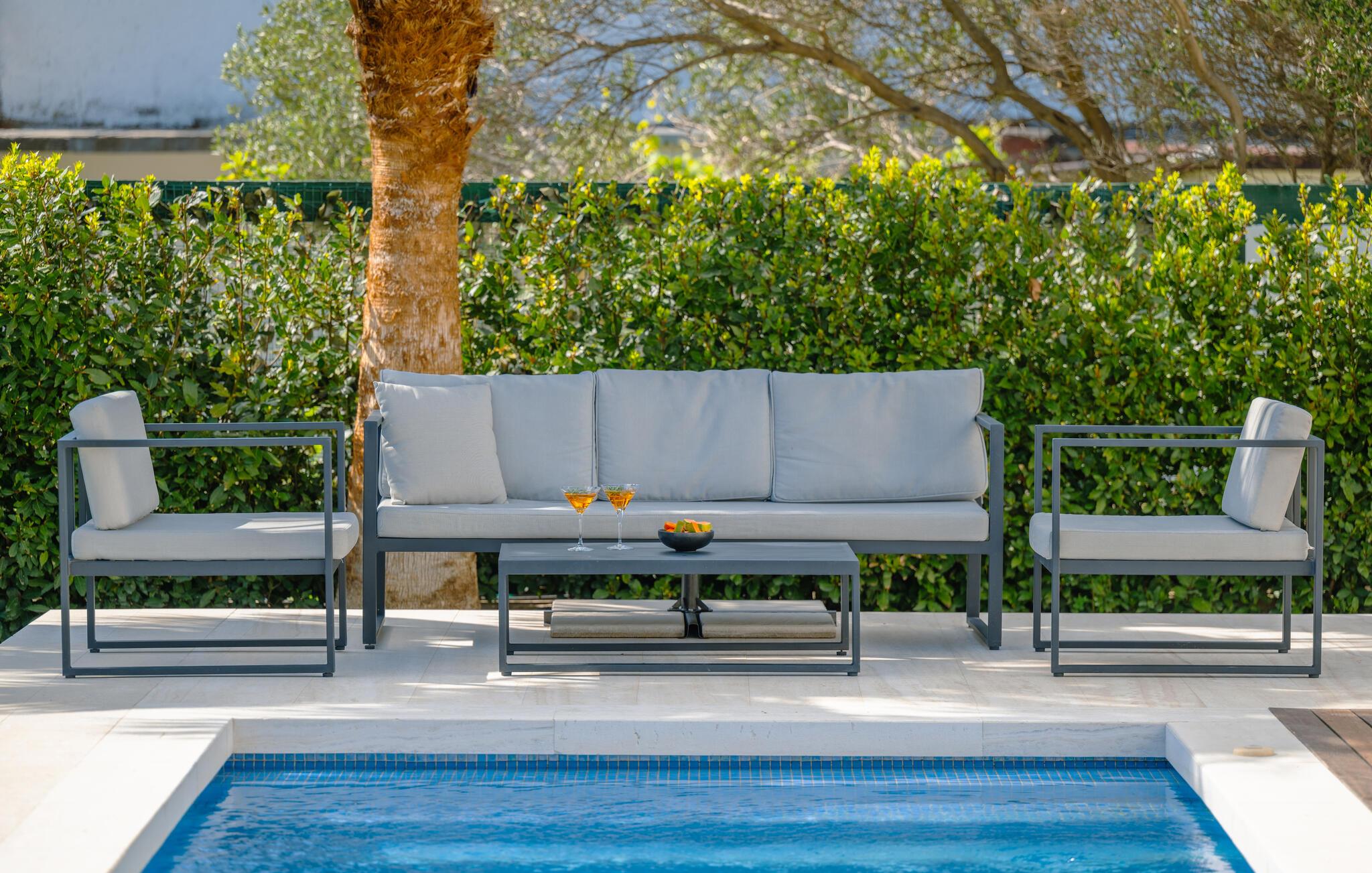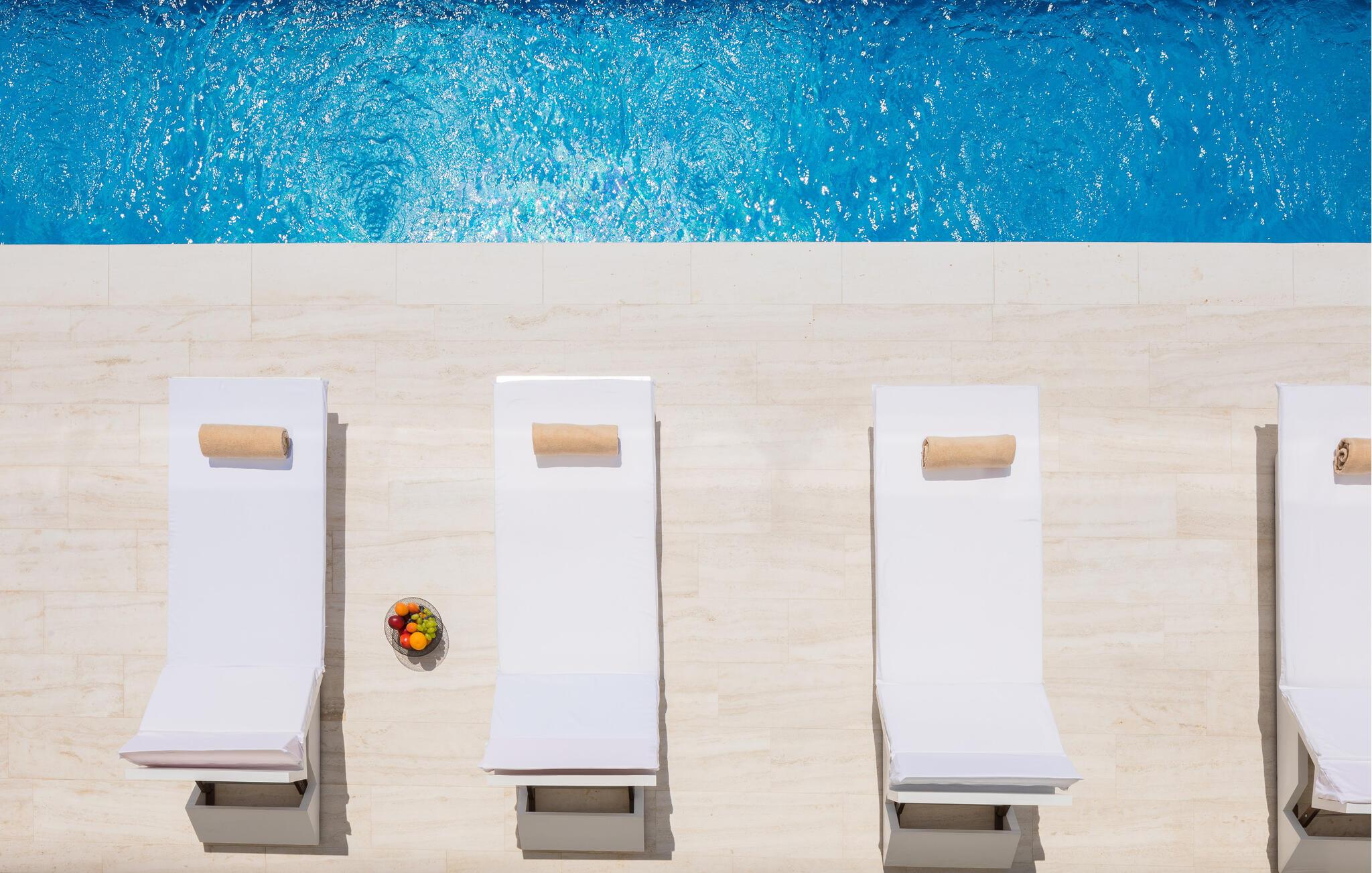 På terrassen og i haven venter en smuk privat saltvandspool på jer, omgivet af palmer og med liggestole. Wellness-området med bio-sauna og spabad på balkonen fuldender tilbuddene.