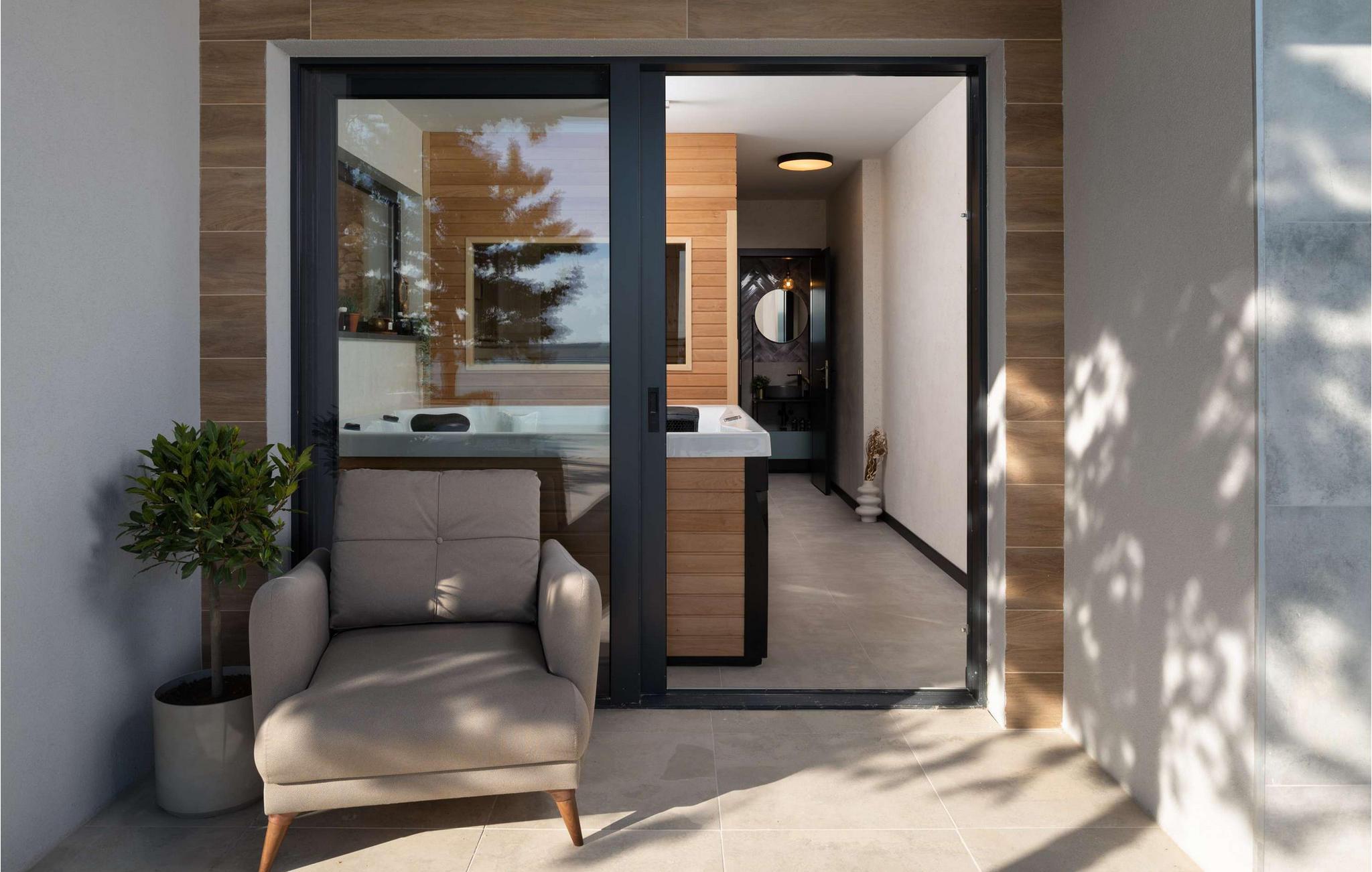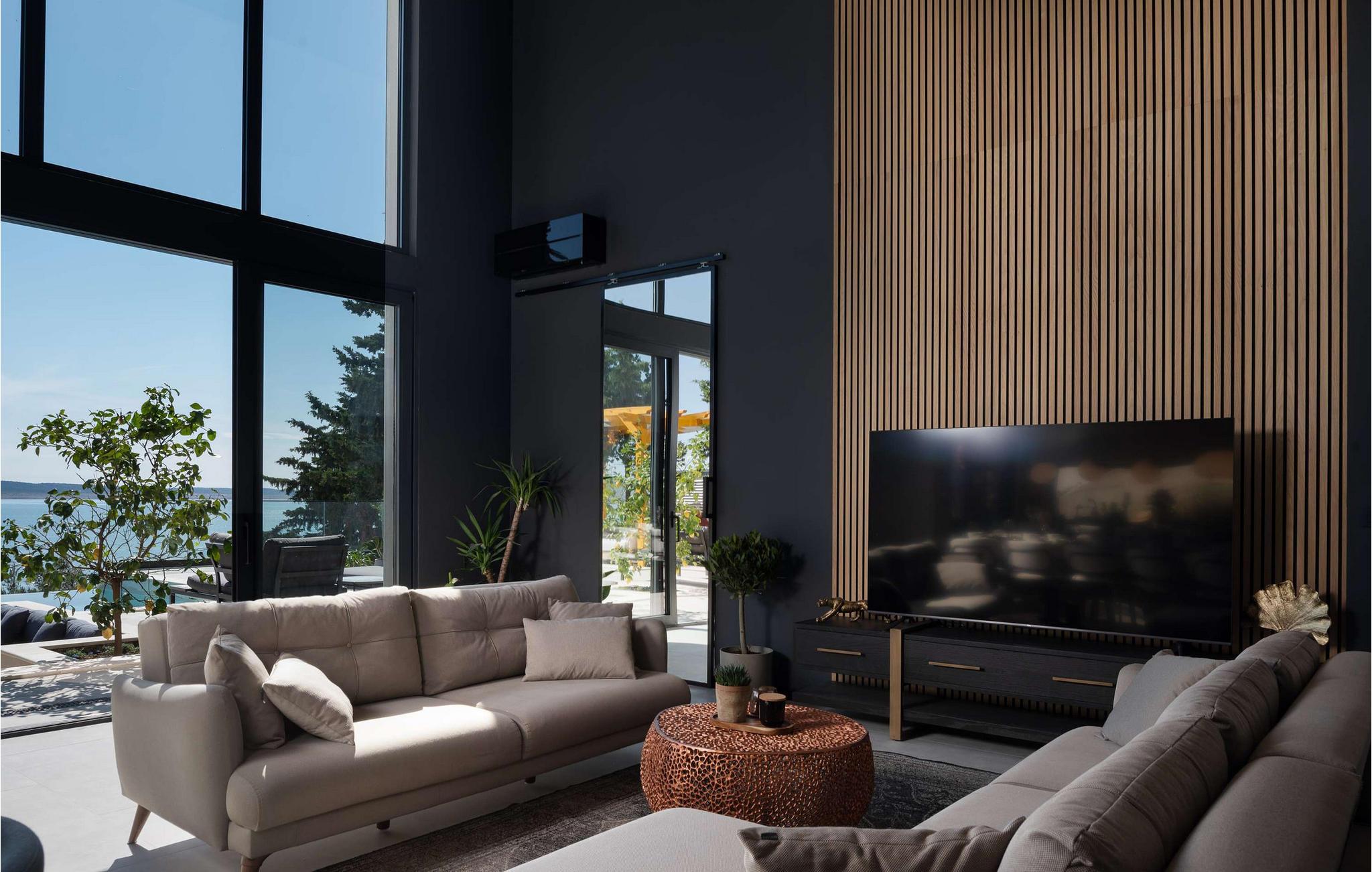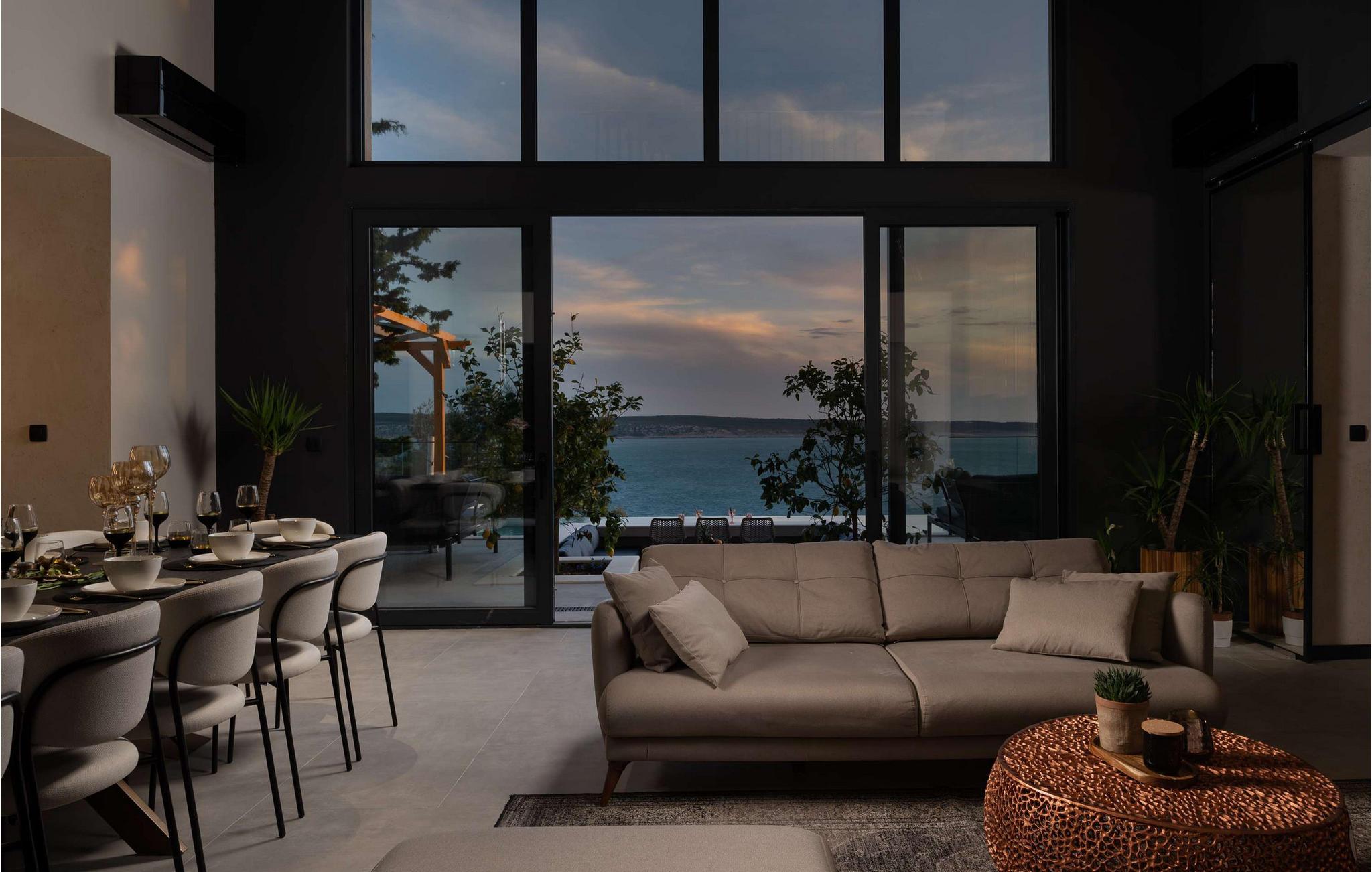Fra det øjeblik I træder ind, imponerer den rummelige opholdsstue i Villa Beatrice med sin åbne arkitektur, høje vinduer og betagende havudsigt. Elegante materialer, bløde farver og moderne design giver rummet en sofistikeret atmosfære. Uanset om I streamer en god serie, lytter til de seneste hits eller blot nyder en afslappet snak, vil I hurtigt glide ind i ferietilstand. Tilbring aftener sammen i den stilfulde spisestue, tilbered måltider og nyd en god flaske vin.