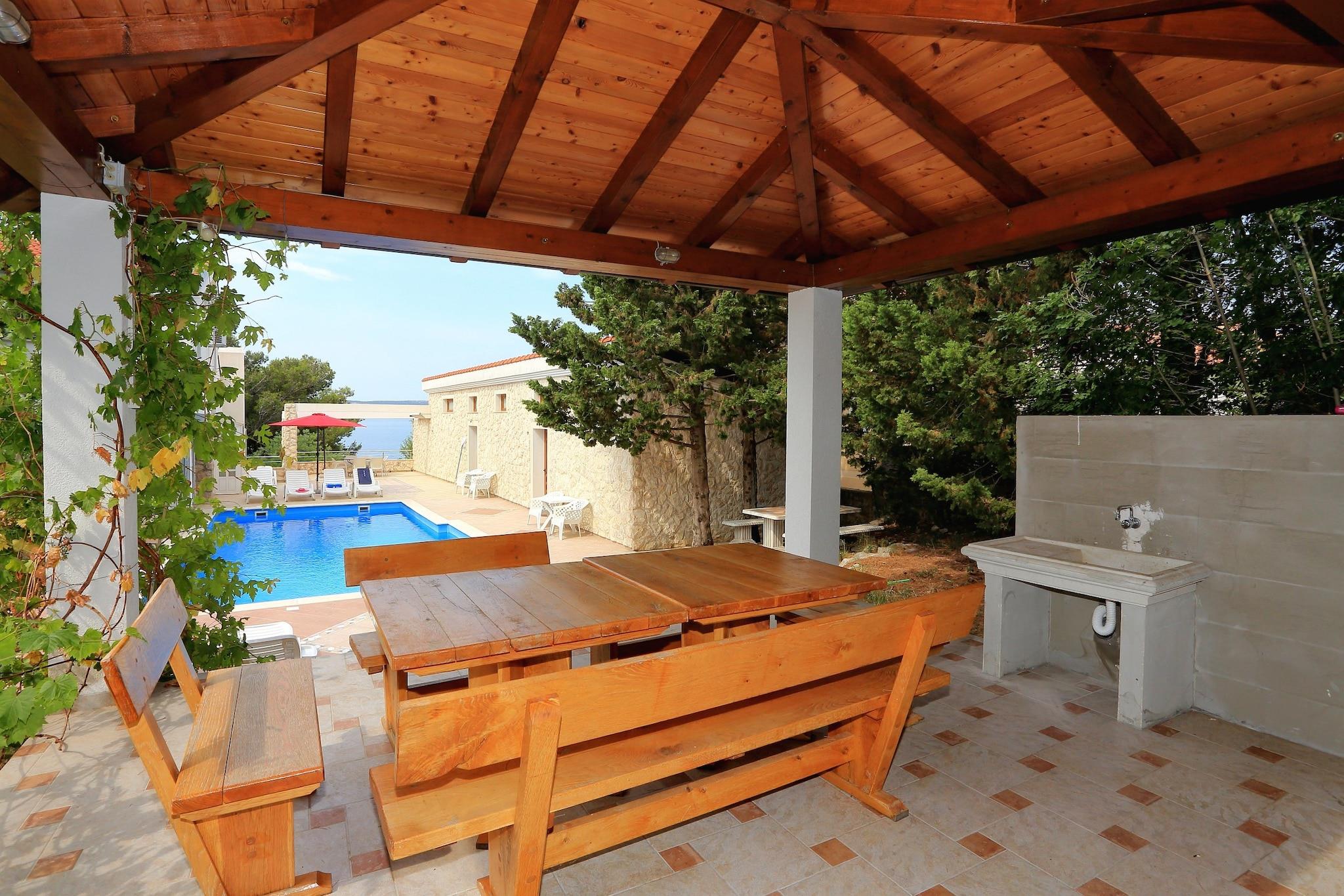 Strand ejendom Baja nyder en vidunderlig strand beliggenhed tilbyder en fantastisk komfort for op til 20 personer. Beliggende på 3400m privat ejendom tilbyder dette ekstraordinære feriehus sine gæster et rummeligt opholdsstue adskilt i 3 enheder, smuk 50m swimmingpool, velværeområde og fantastisk have. Den fælles stue / spisestue tilbyder en hyggelig atmosfære med stort spisebord egnet til en større gruppe, seatting område med billard, fuldt udstyret køkken og moderne badeværelse. Nice overdækket terrasse med pejs er der for dine afslappende øjeblikke. 2 fuldt udstyrede lejligheder tilbyder en fantastisk komfort for op til 14 personer, mens charmerende anneks ved siden af ?? swimmingpoolen kan rumme op til 6 personer. Alle værelser i feriehuset er udstyret med air condition enhed. Dit sommerhus er en perfekt indkvartering til flere familier eller større grupper. Der er et velværeområde med sauna og lille interiour pool til din rådighed. Fantastisk privat have med mange havudsigt terrasser er simpelthen det bedste sted for din stress fri ferie. Det har direkte adgang til den charmerende stenstrand! Flere private parkeringspladser findes også. Det vigtigste klatringscenter i Kroatien er nationalparken Paklenica kun 2,5 km væk, hvilket gør dette hotel til et ideelt valg for aktive ferie entusiaster.
