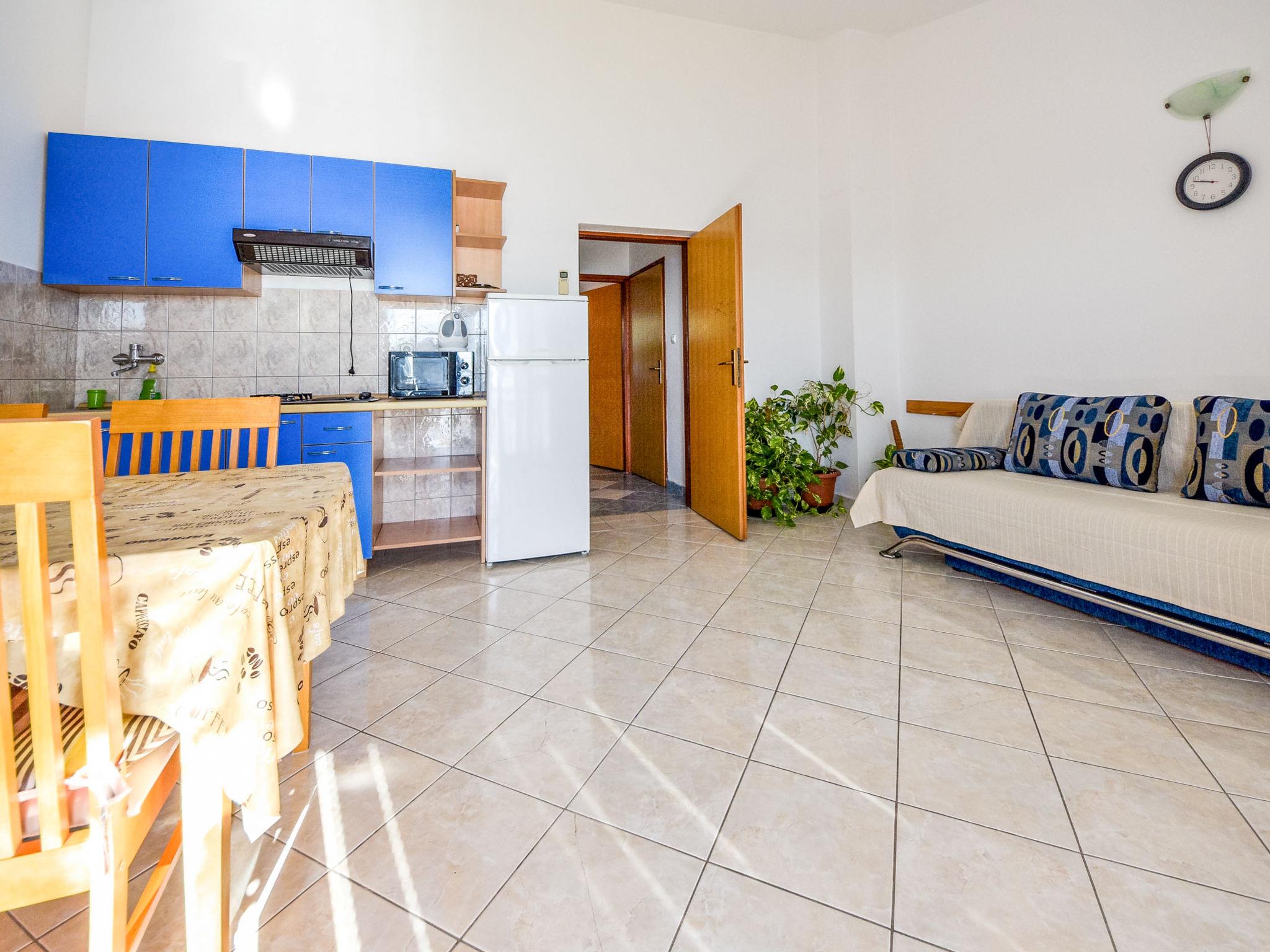 2-room apartment 38 m2 on 2nd floor, south-west facing position. Living/dining room 22 m2 with 1 double sofabed (150 cm, length 200 cm), satellite TV (flat screen), air conditioning. Exit to the terrace. 1 room with 1 double bed (2 x 90 cm, length 200 cm). Open kitchen (4 hot plates, electric coffee machine). Shower/WC. No heating option. Terrace 4 m2, roofed. Terrace furniture. View of the sea. Facilities: Internet (WiFi, free).