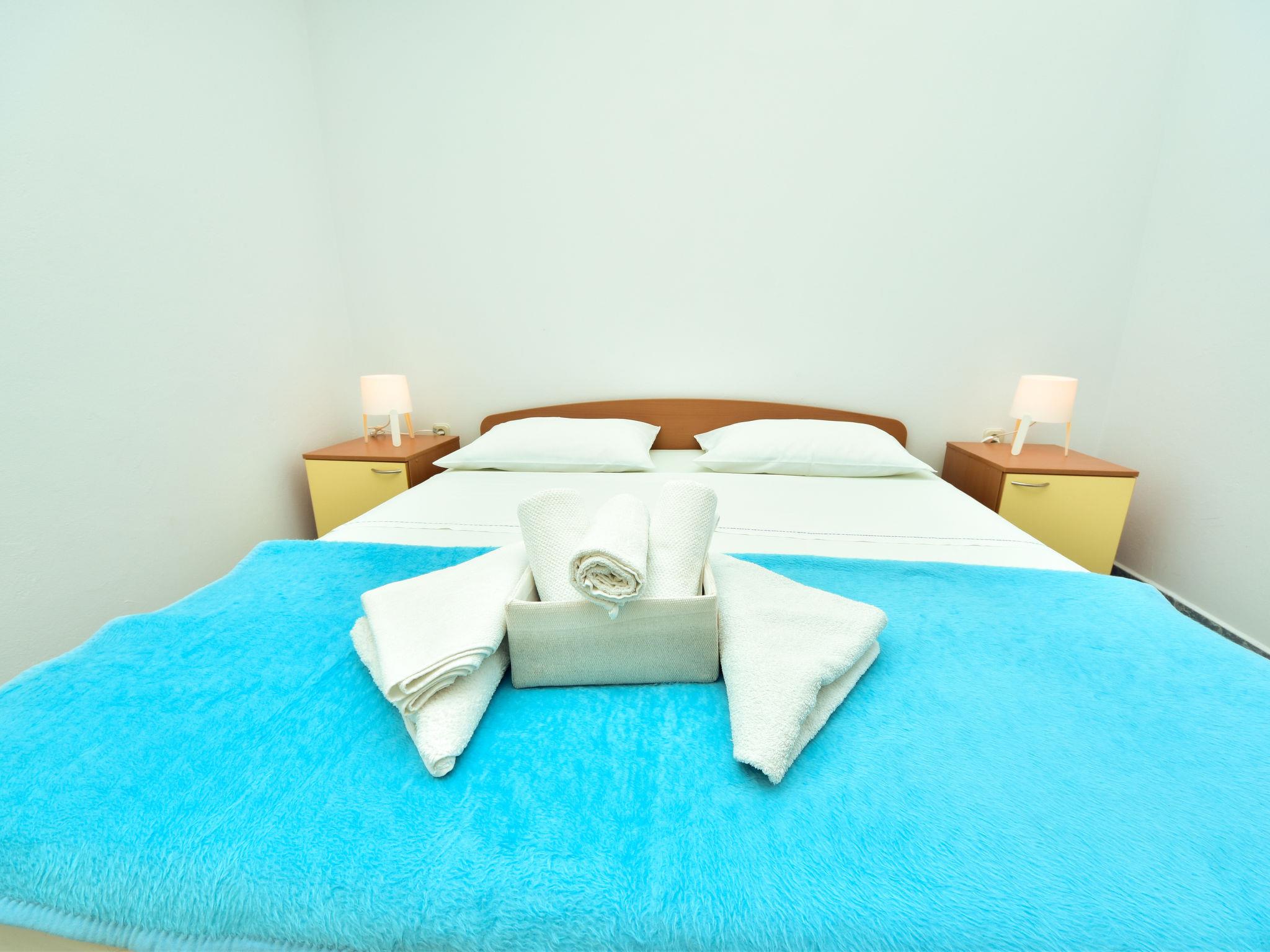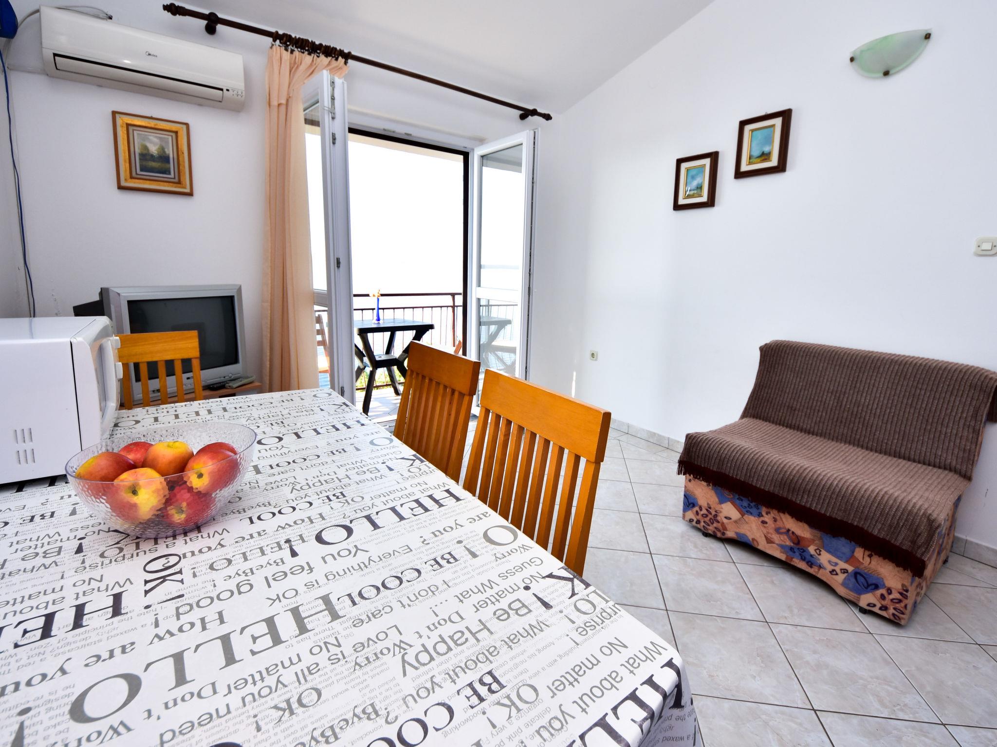 2-room apartment 35 m2 on 2nd floor, south-west facing position. Living/dining room 22 m2 with 1 sofabed (120 cm, length 190 cm), satellite TV (flat screen), air conditioning. Exit to the terrace. 1 room with 1 double bed (2 x 90 cm, length 200 cm). Open kitchen (4 hot plates, microwave, electric coffee machine). Shower/WC. No heating option. Terrace 4 m2, roofed. Terrace furniture. View of the sea. Facilities: Internet (WiFi, free).
