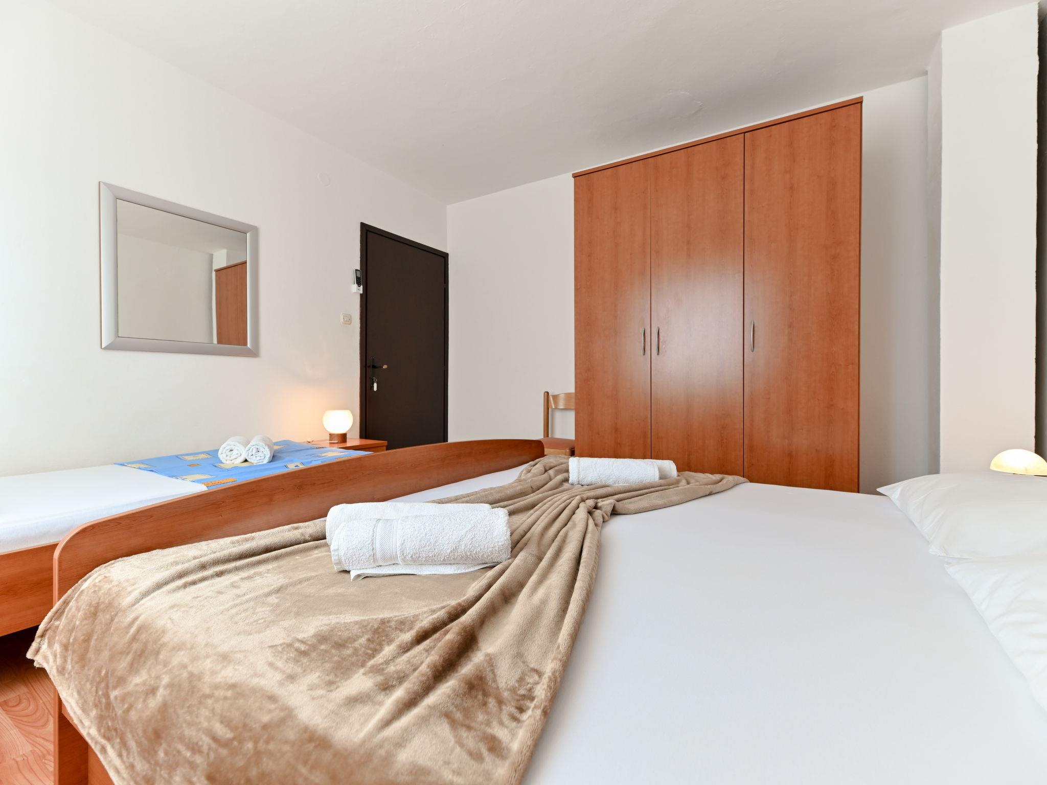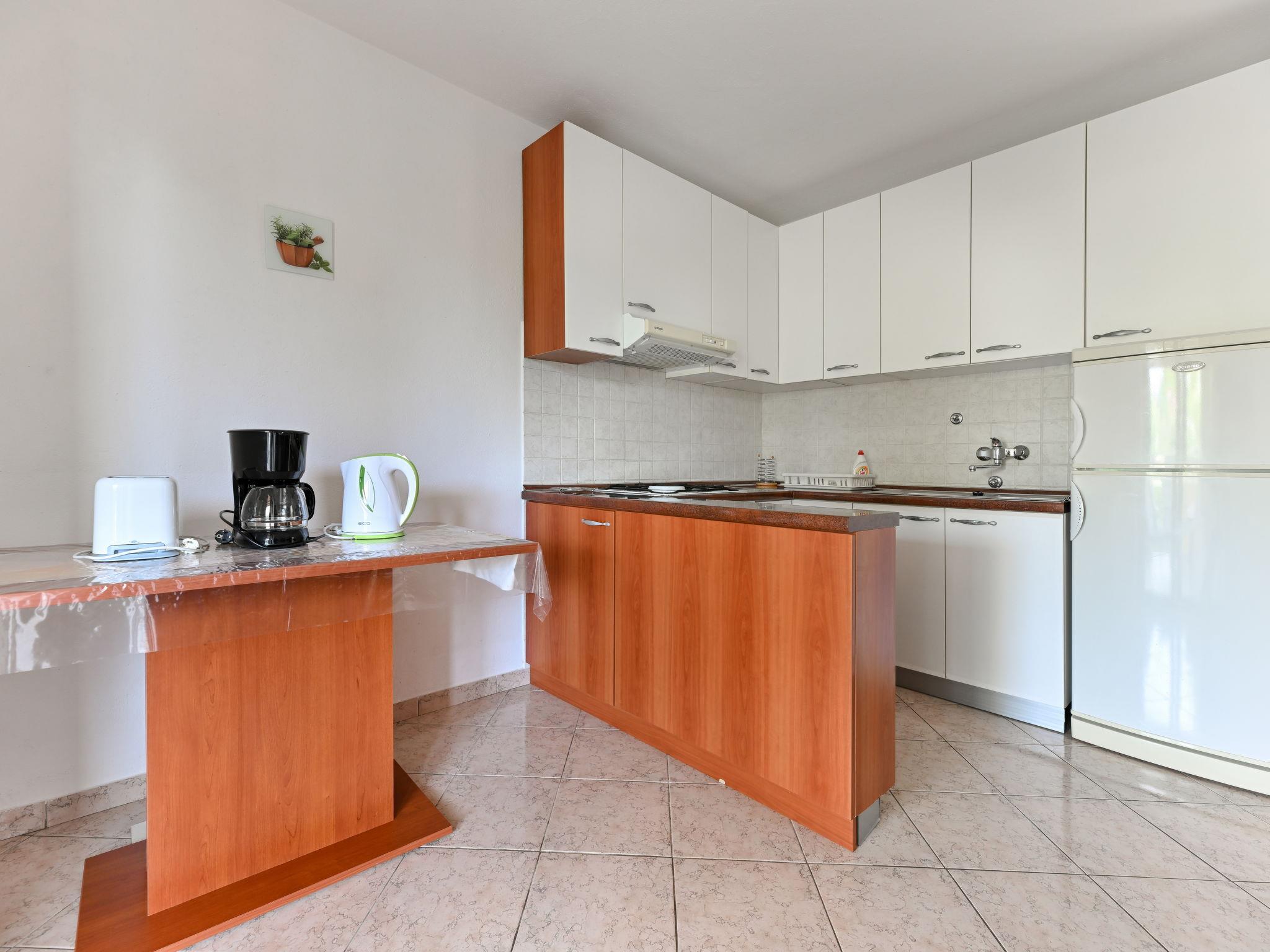 3-room apartment 70 m2 on 1st floor. Living room with 1 double sofabed (160 cm, length 200 cm), air conditioning. 1 room with 2 beds (90 cm, length 200 cm). 1 room with 1 bed (90 cm, length 200 cm), 1 french bed (180 cm, length 200 cm), air conditioning. Kitchen (1 hot plate, oven, 3 gas rings, toaster, kettle, freezer). Exit to the terrace. Bathroom, sep. WC. Air-conditioning. No heating option. Balcony 10 m2, terrace 13 m2, roofed, terrace 48 m2 partly roofed. Terrace furniture, balcony furniture, barbecue (portable), deck chairs (2). Beautiful panoramic view of the sea. Facilities: washing machine, hair dryer. Internet (WiFi, free). Maximum 1 pet/ dog allowed.