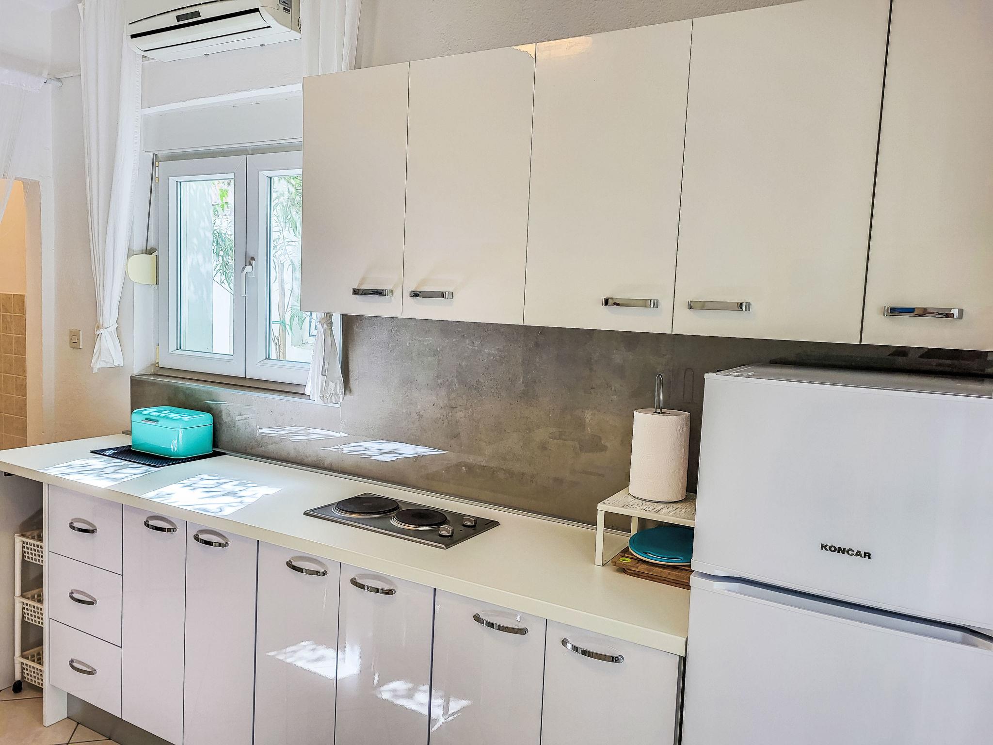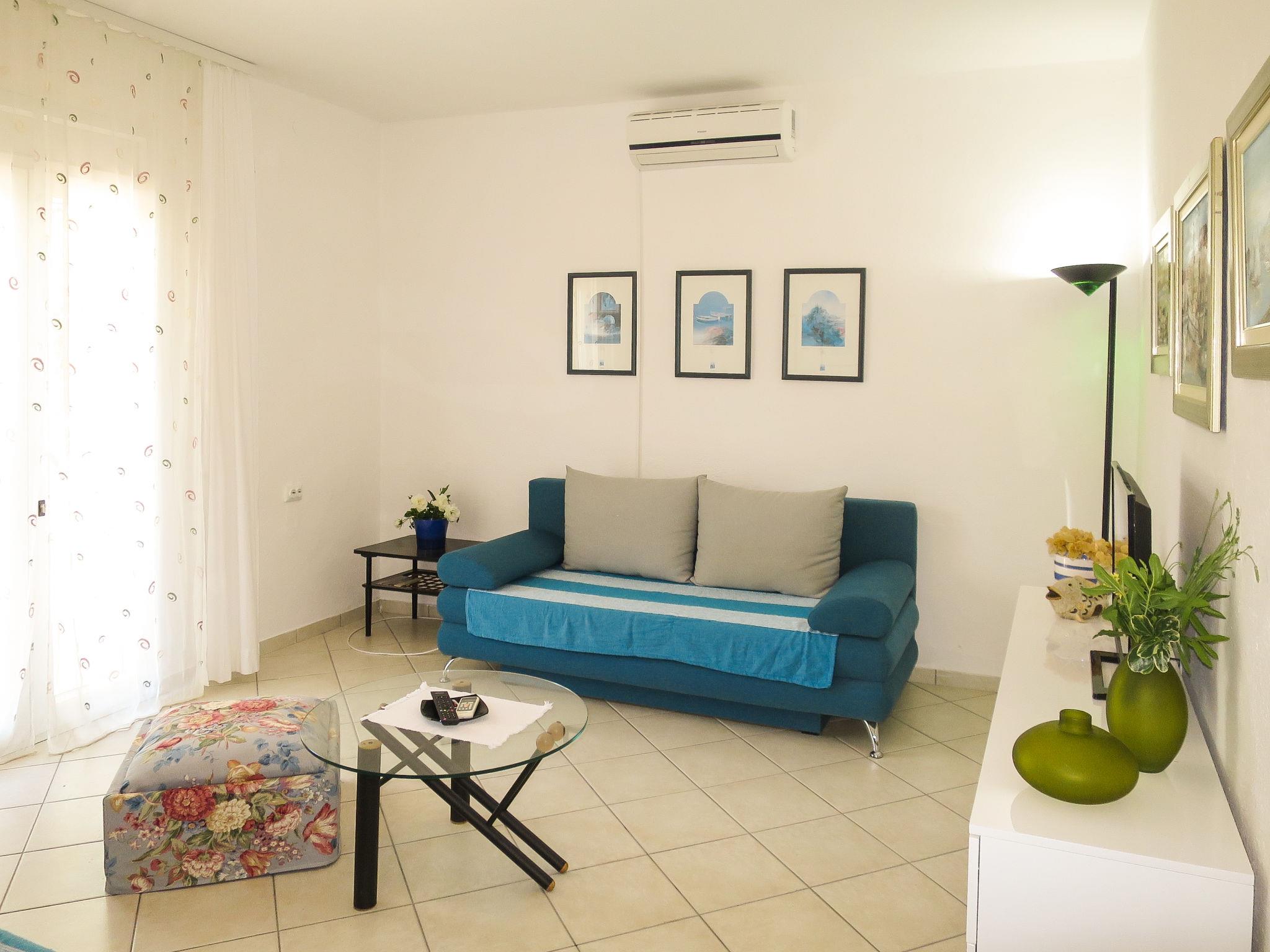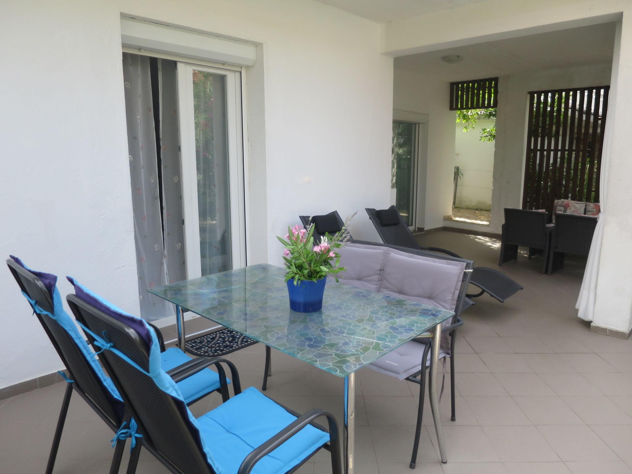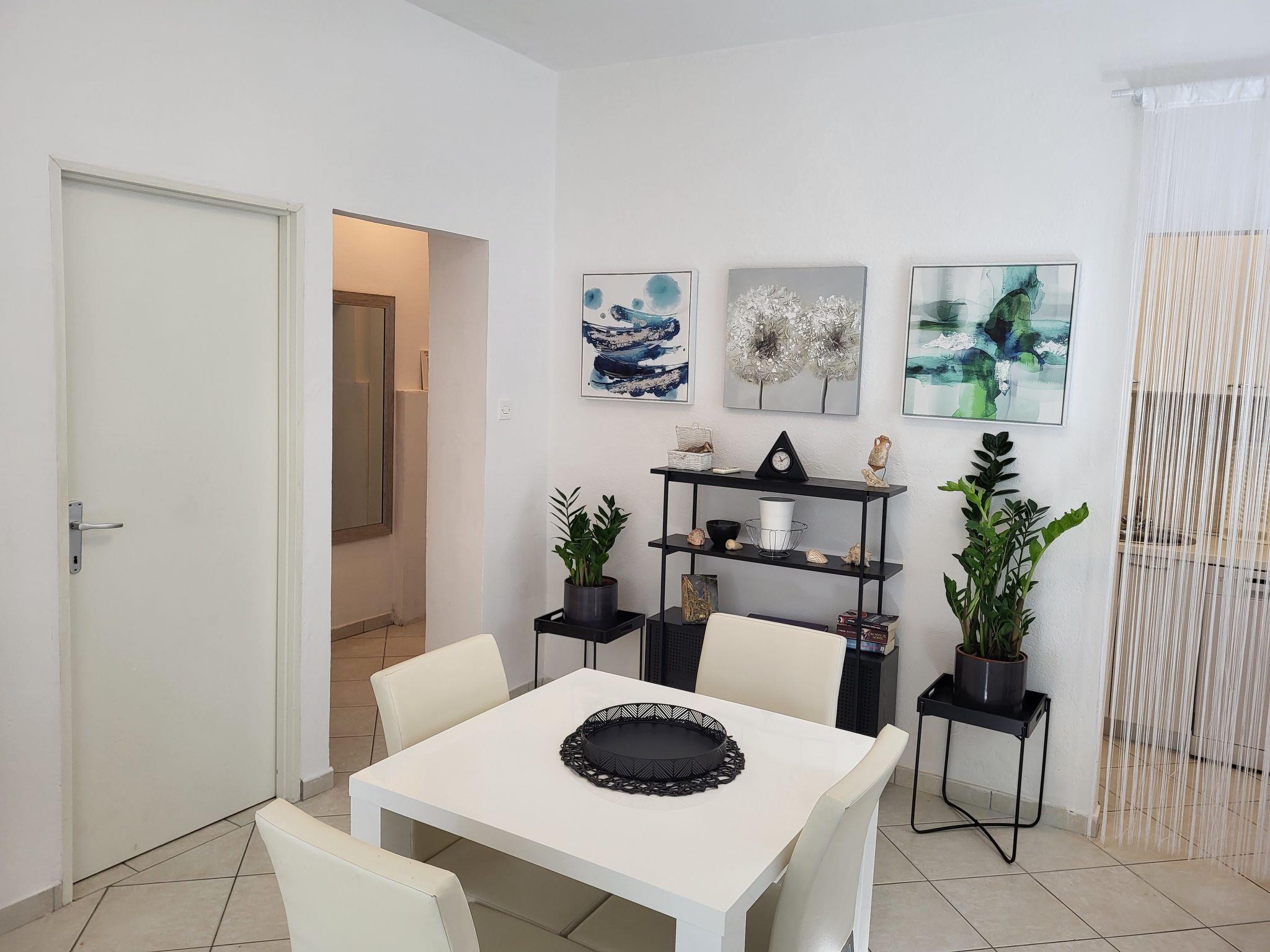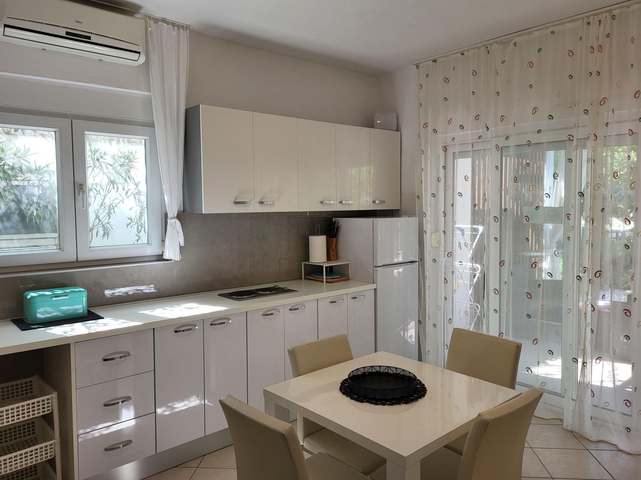 "Katarina", 3-room house 60 m2. Living room with 2 sofabeds, satellite TV and air conditioning. Exit to the terrace. 1 room with 1 french bed (160 cm). Kitchen (2 hot plates, dishwasher, toaster, kettle, microwave, freezer, electric coffee machine) with dining table and air conditioning. Shower/WC. Forced-air heating. Deck chairs (2). Facilities: iron. Internet (WiFi, free). Please note: non-smoking house.