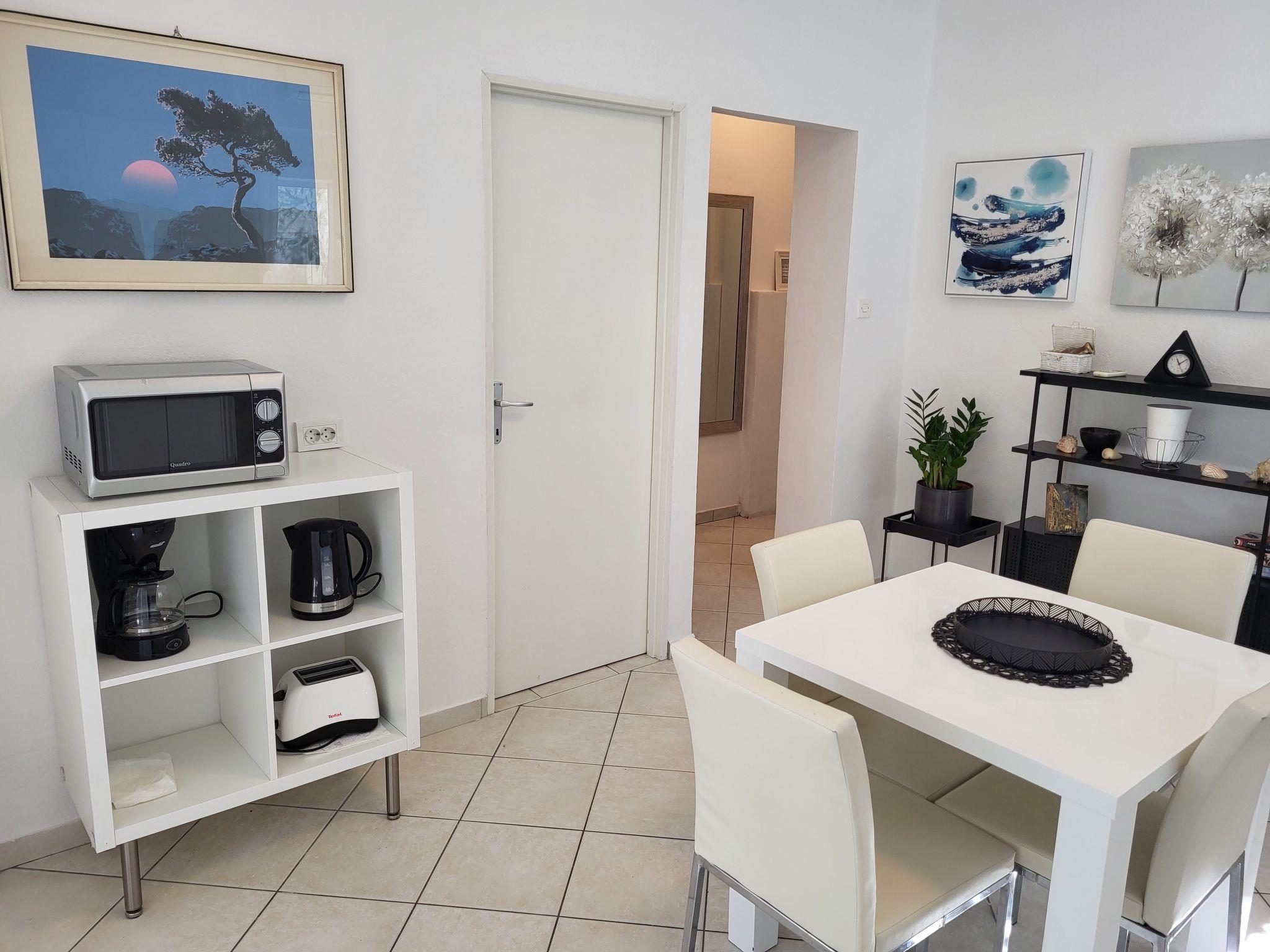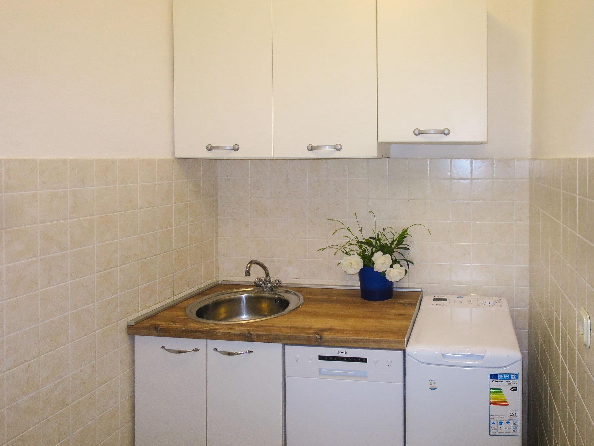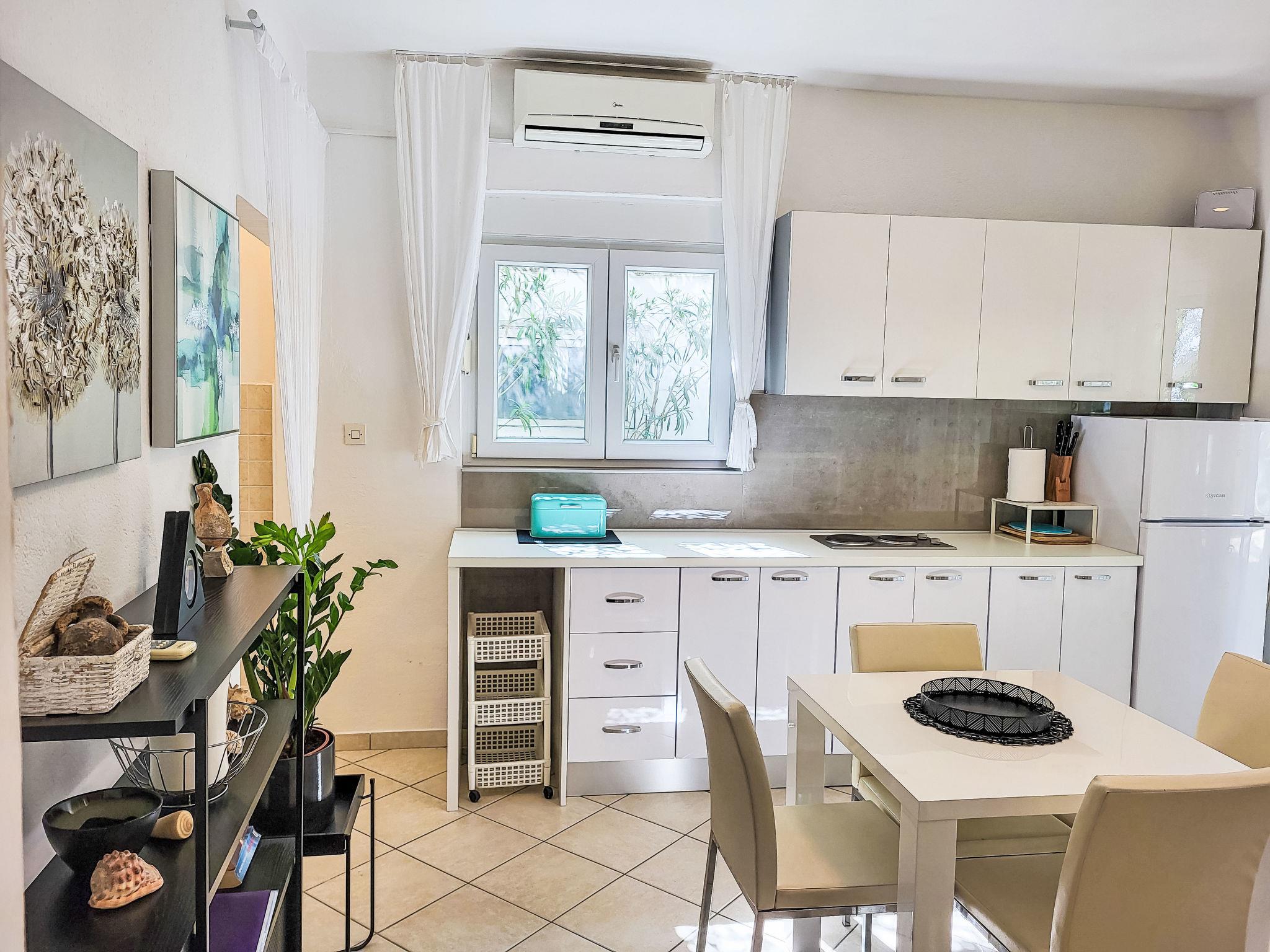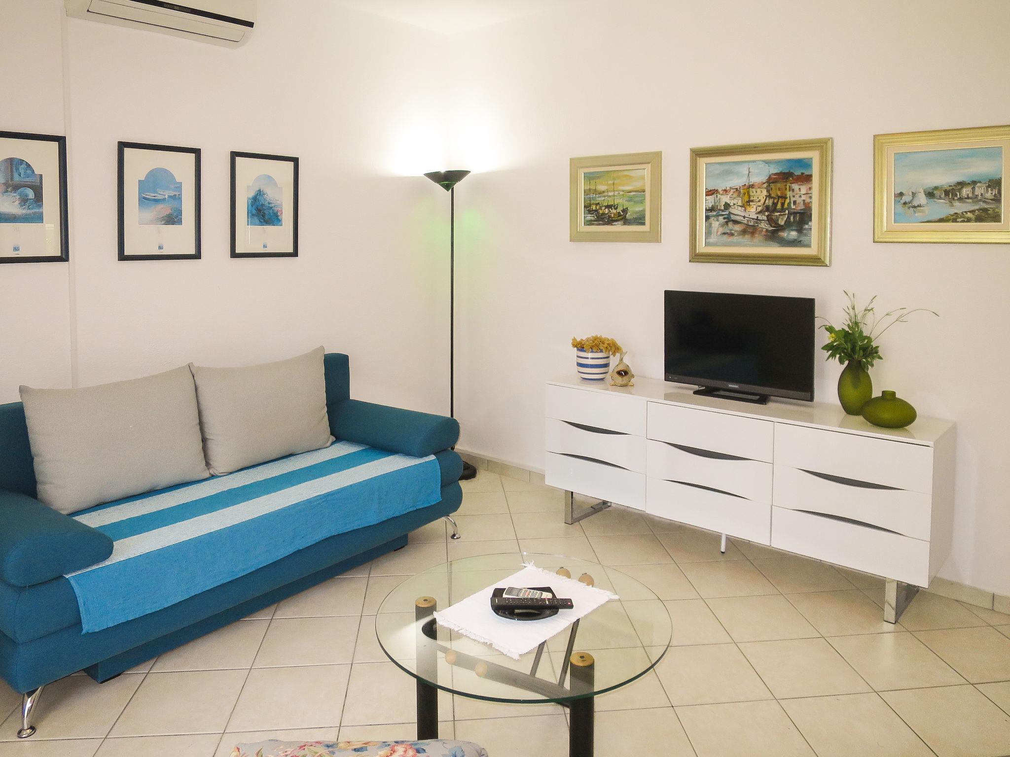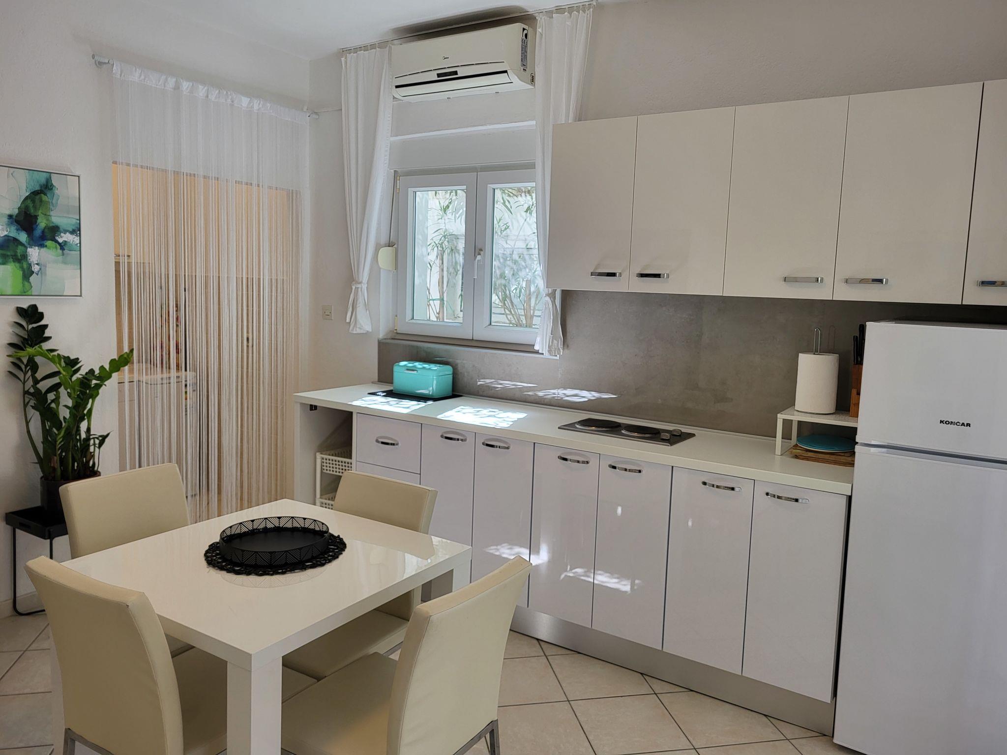 "Katarina", 3-room house 60 m2. Living room with 2 sofabeds, satellite TV and air conditioning. Exit to the terrace. 1 room with 1 french bed (160 cm). Kitchen (2 hot plates, dishwasher, toaster, kettle, microwave, freezer, electric coffee machine) with dining table and air conditioning. Shower/WC. Forced-air heating. Deck chairs (2). Facilities: iron. Internet (WiFi, free). Please note: non-smoking house.