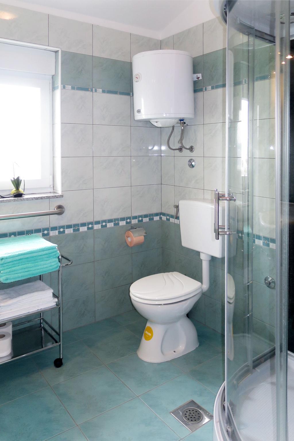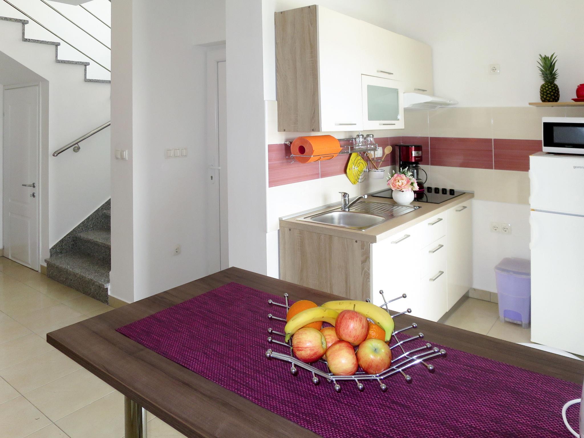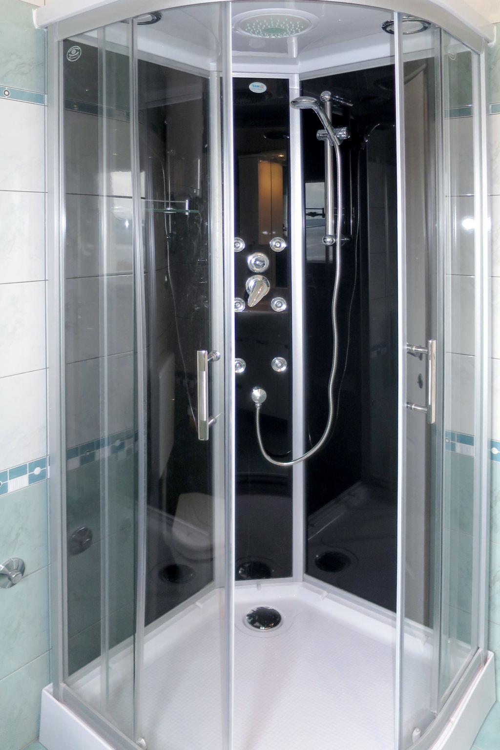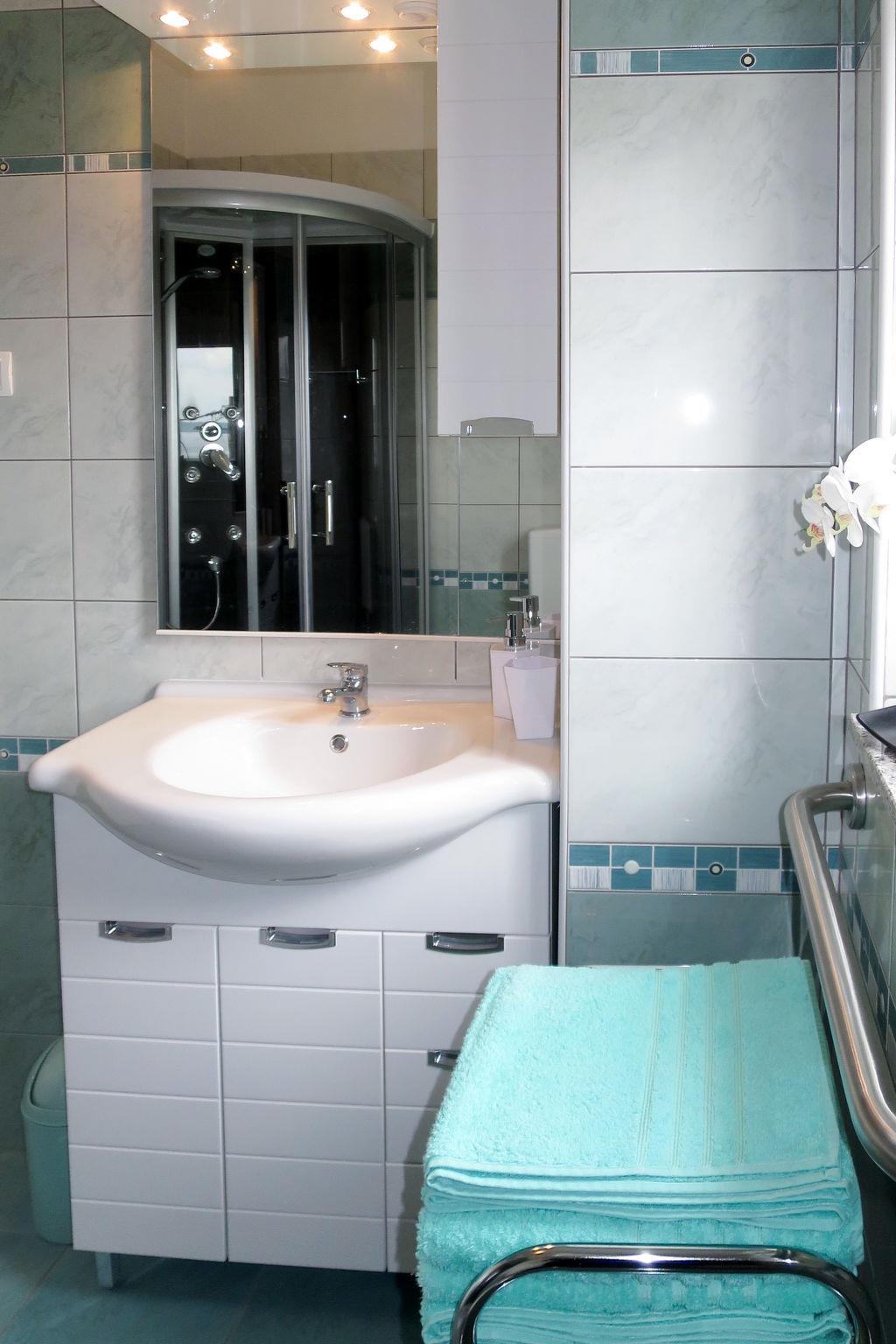 3-room semi-detached house 70 m2 on 2 levels. Living/dining room with 1 sofabed and satellite TV. Exit to the balcony. Open kitchen (4 ceramic glass hob hotplates, toaster, kettle, microwave, freezer, electric coffee machine). Shower/WC. Upper floor: entrance hall with air conditioning. 2 rooms, each room with 1 french bed (160 cm, length 200 cm). Exit to the balcony. Shower/WC. No heating option. Balcony 16 m2, terrace 8 m2. Terrace furniture, balcony furniture. View of the sea. Facilities: Internet (WiFi, free). Please note: non-smoking house.