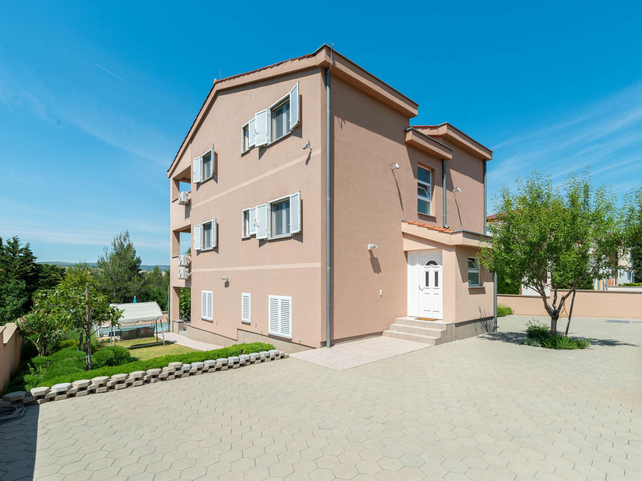 Apartment house "Matas". 12 km from the centre of Starigrad, 300 m from the centre of Rovanjska, 35 km from the centre of Zadar, 200 m from the sea, 200 m from the beach, in a cul-de-sac. For shared use: property 500 m2 (fenced) with trees, swimming pool angular heated (8 x 3 m, 30 m2, depth 150 cm, seasonal availability: 28.Mar. - 17.Oct.) with internal staircase and shutter cover. Outdoor shower, terrace, garden furniture, barbecue, pool maintenance by the owner/gardener. In the house: internet access. Parking on the premises, public parking. Shop 300 m, restaurant 500 m, bus stop 350 m, rocky beach 200 m. Swimming pool with counterflow.