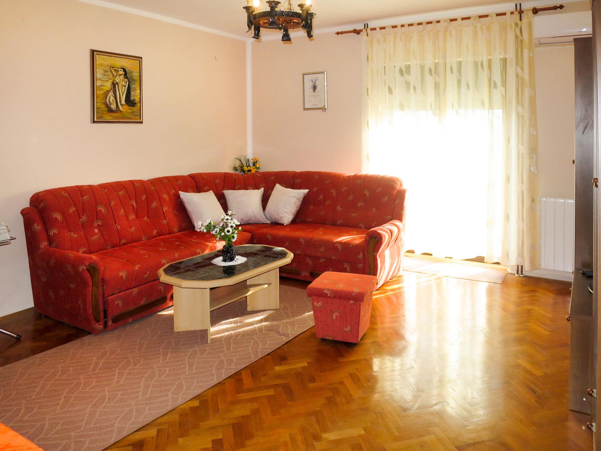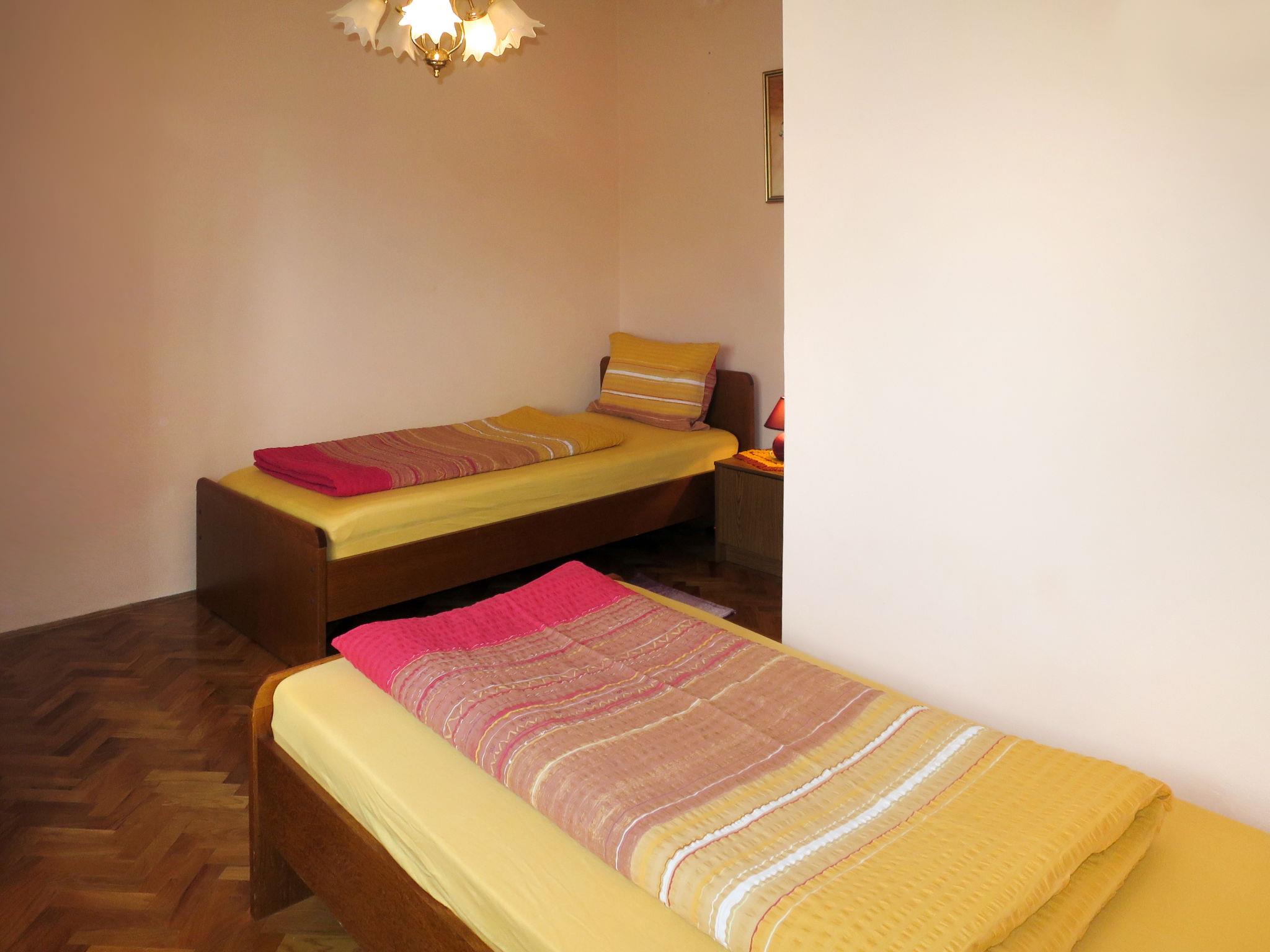 "Stjepan", 4-room apartment 90 m2 on 1st floor. Living room with 1 sofabed, satellite TV and air conditioning. Exit to the balcony. 1 room with 1 double bed (2 x 90 cm, length 200 cm), air conditioning. Exit to the balcony. 2 rooms, each room with 2 beds (90 cm, length 200 cm). Kitchen (2 hot plates, oven, dishwasher, 2 gas rings, toaster, kettle, freezer, electric coffee machine) with dining table. Bath/bidet/WC, sep. WC. No heating option. Balcony. Balcony furniture. Facilities: washing machine, iron, baby cot. Internet (WiFi, free). Please note: non-smoking house. Private entrance.