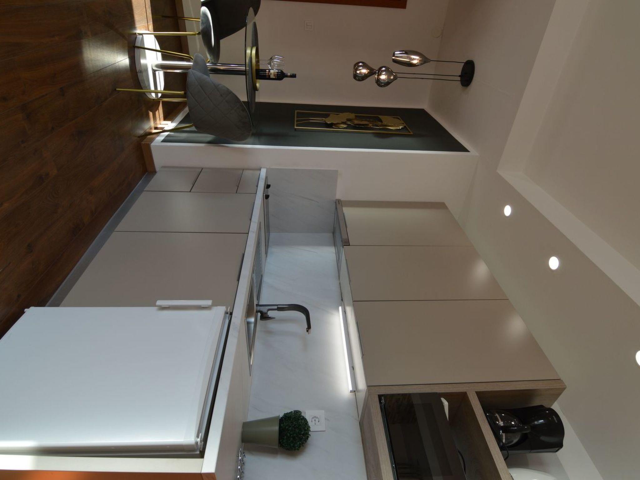 The apartment provides space for two adults. The bedroom has two single beds. Satellite TV (Astra and Hotbird) and a dining table are also provided in the living room kitchen, which is equipped with all the essentials for self-catering, including a fridge, a two-ring ceramic hob, a coffee machine, dishwasher, plates. There is also a bathroom with a shower.