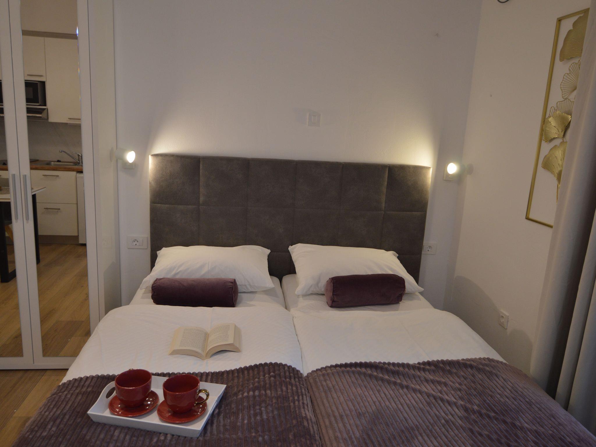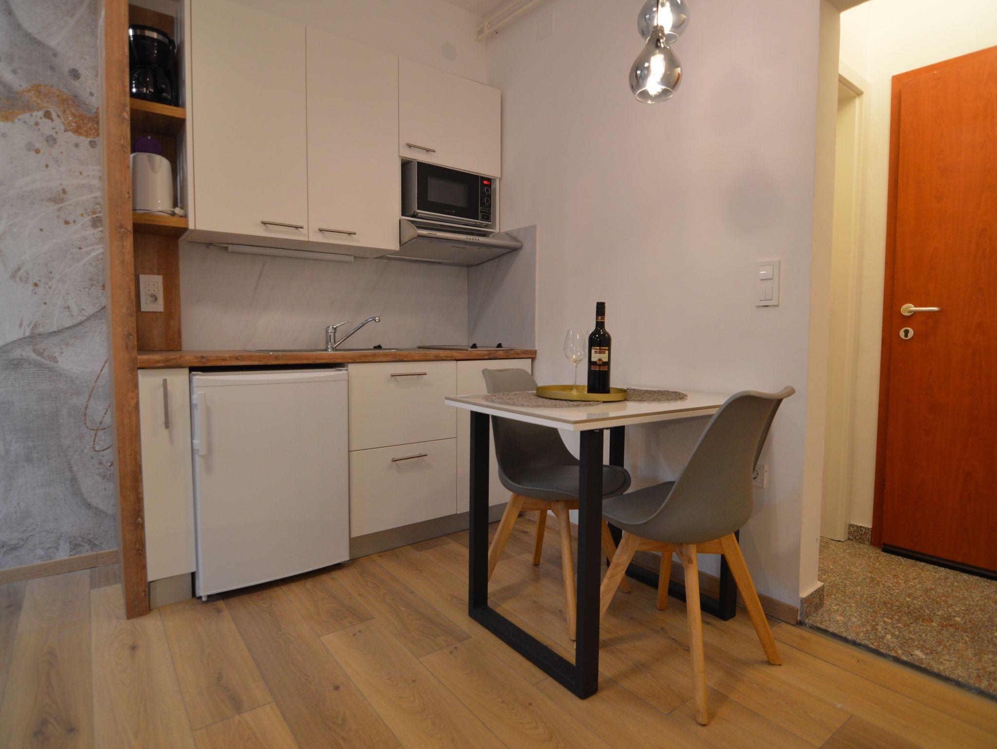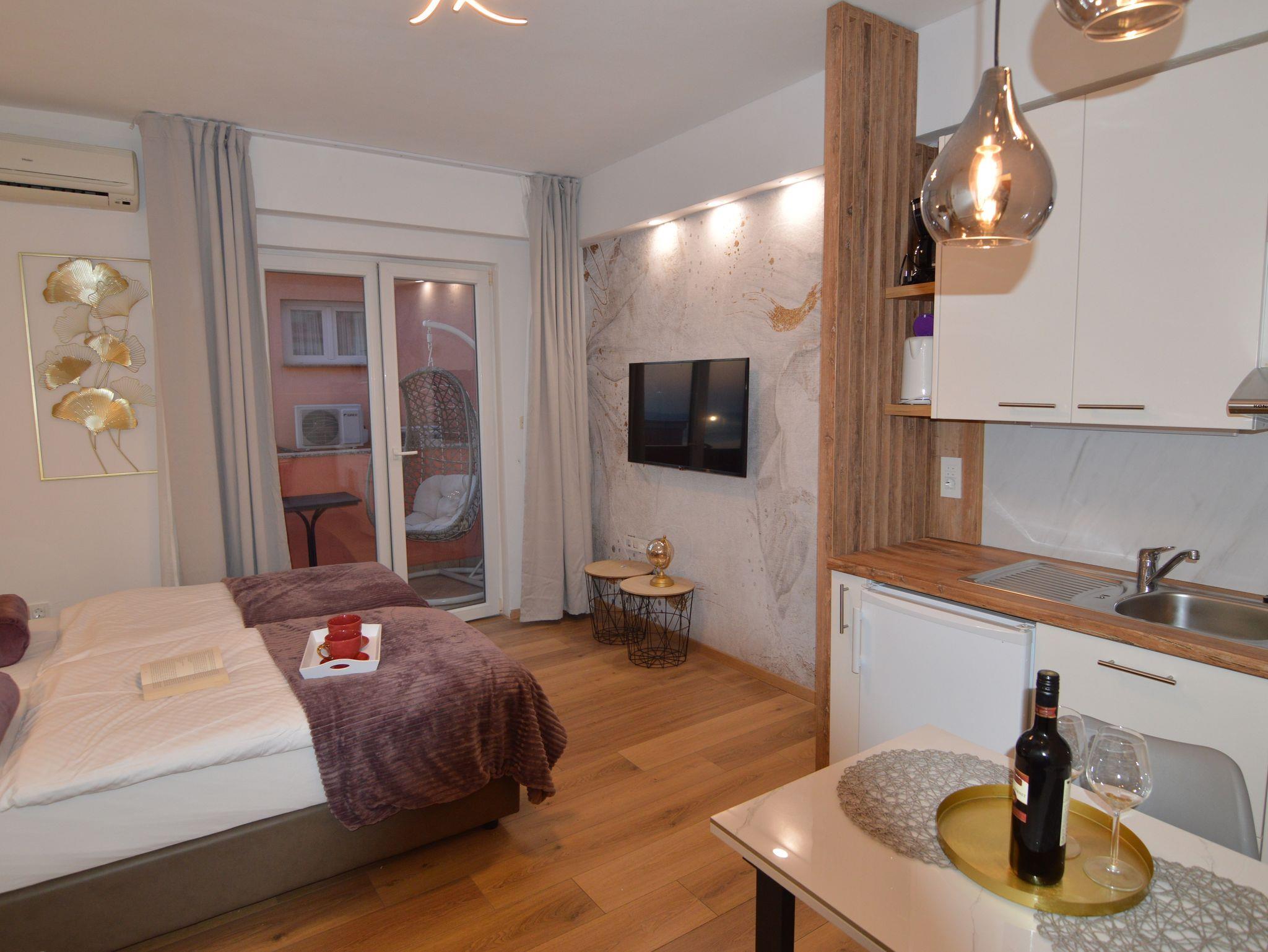 Studio bietet Platz für 2 Gäste. Die Betten sind in Schlafzimmern, die es 1 gibt, innerhalb einer Gesamtfläche von 14m2, angeordnet. Die Gäste haben einen eigenen Balkon zur Verfügung, auf der sie in warmen Sommernächten genießen können. Das Studio-Apartment bietet Meerblick. In der gebuchten Unterkunftseinheit zahlt man am Ort ein Depositum ( der Preis ist an der Internetseite angeführt ). IM PREIS INBEGRIFFEN: Kurtaxe, Endreinigung, Klimatisierung, Zentralheizung, Parkplatz, Internet, Kinderbett, Bügeleisen, Föhn. VERBINDLICHE ZUSÄTZLICHE KOSTEN: Kaution (200,00 € Einmalzahlung), Aufzahlung für Kurzaufenthalte (prozentualer Zuschlag pro Nächtigungsanzahl: 30% - 1, 20% - 2, 10% - 3). Die Verfügbarkeit zusätzlicher Dienstleistungen in Ihrem reservierten Termin und die Preise derselben (falls nicht aufgeführt) müssen im Voraus überprüft werden. Zusätzliche Dienstleistungen die in der Zahlungsaufforderung nicht aufgeführt sind werden direkt beim Vermieter bezahlt, angenommen der Gast nutzt auch diese.