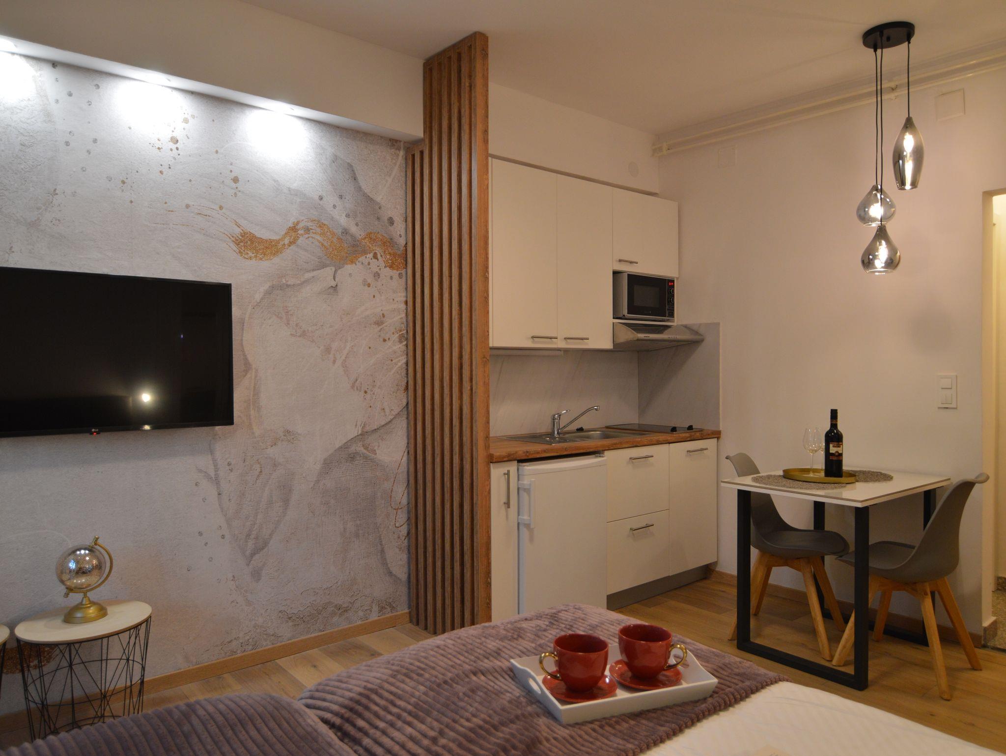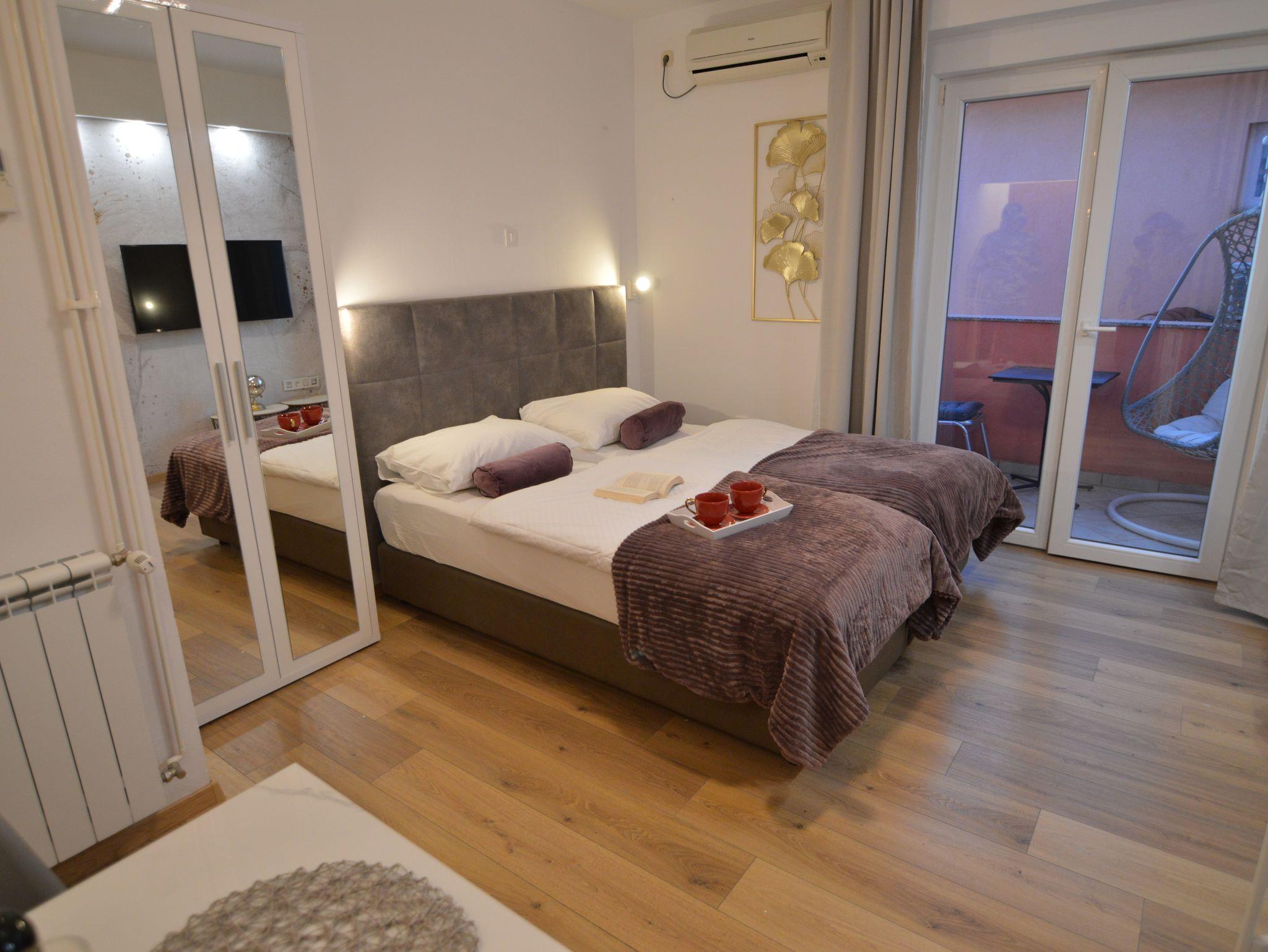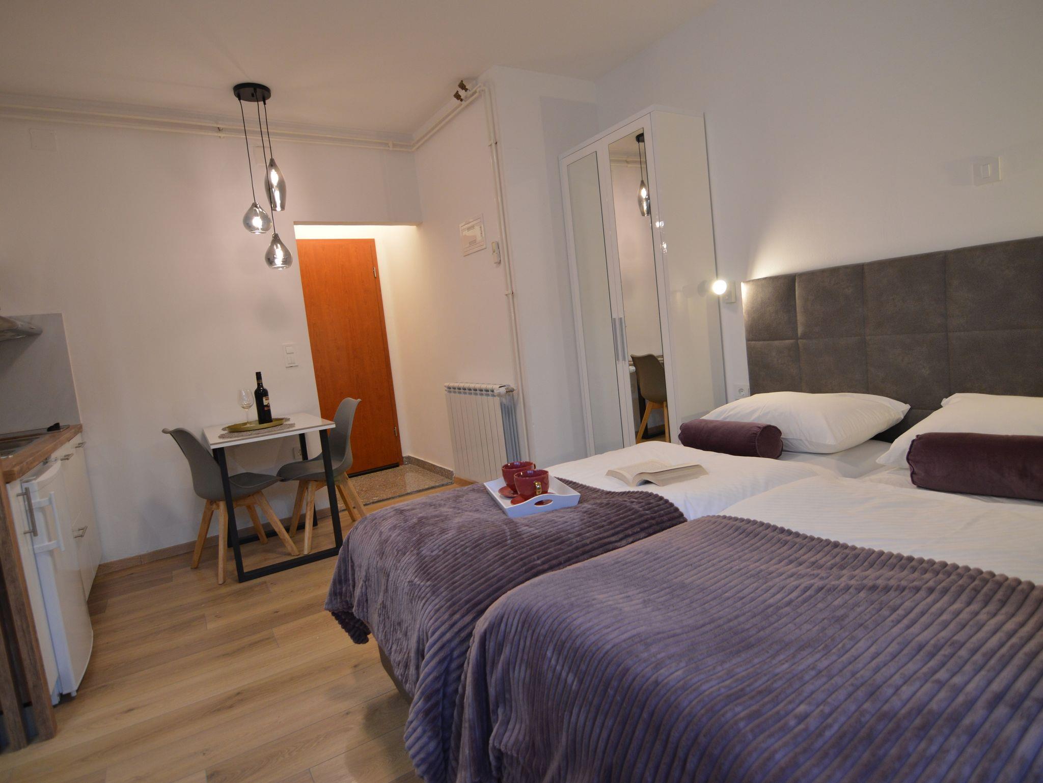Studio bietet Platz für 2 Gäste. Die Betten sind in Schlafzimmern, die es 1 gibt, innerhalb einer Gesamtfläche von 14m2, angeordnet. Die Gäste haben einen eigenen Balkon zur Verfügung, auf der sie in warmen Sommernächten genießen können. Das Studio-Apartment bietet Meerblick. In der gebuchten Unterkunftseinheit zahlt man am Ort ein Depositum ( der Preis ist an der Internetseite angeführt ). IM PREIS INBEGRIFFEN: Kurtaxe, Endreinigung, Klimatisierung, Zentralheizung, Parkplatz, Internet, Kinderbett, Bügeleisen, Föhn. VERBINDLICHE ZUSÄTZLICHE KOSTEN: Kaution (200,00 € Einmalzahlung), Aufzahlung für Kurzaufenthalte (prozentualer Zuschlag pro Nächtigungsanzahl: 30% - 1, 20% - 2, 10% - 3). Die Verfügbarkeit zusätzlicher Dienstleistungen in Ihrem reservierten Termin und die Preise derselben (falls nicht aufgeführt) müssen im Voraus überprüft werden. Zusätzliche Dienstleistungen die in der Zahlungsaufforderung nicht aufgeführt sind werden direkt beim Vermieter bezahlt, angenommen der Gast nutzt auch diese.