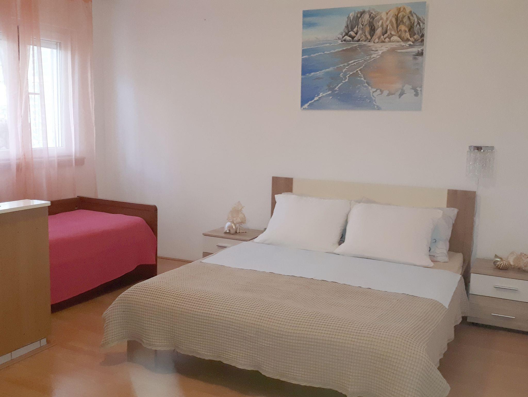 Ferienwohnung bietet Platz für 4 Gäste. Die Betten sind in Schlafzimmern, die es 2 gibt, innerhalb einer Gesamtfläche von 47m2, angeordnet. Die Gäste haben eine eigene Terrasse zur Verfügung, auf der sie in warmen Sommernächten genießen können. Es ist erlaubt, Speisen auf dem Gemeinschafts-Grill vorzubereiten. IM PREIS INBEGRIFFEN: Kurtaxe, Endreinigung, Klimatisierung, Parkplatz, Internet. VERBINDLICHE ZUSÄTZLICHE KOSTEN: Aufzahlung für Kurzaufenthalte (prozentualer Zuschlag pro Nächtigungsanzahl: 30% - 1, 20% - 2, 10% - 3). Die Verfügbarkeit zusätzlicher Dienstleistungen in Ihrem reservierten Termin und die Preise derselben (falls nicht aufgeführt) müssen im Voraus überprüft werden. Zusätzliche Dienstleistungen die in der Zahlungsaufforderung nicht aufgeführt sind werden direkt beim Vermieter bezahlt, angenommen der Gast nutzt auch diese. Ermäßigung auf den Grundpreis: Gratistag 14=13 (bei einem Aufenthalt von 14 Tagen oder mehr erhalten Sie einen Gratistag für den Aufenthalt bis 31.12.26).