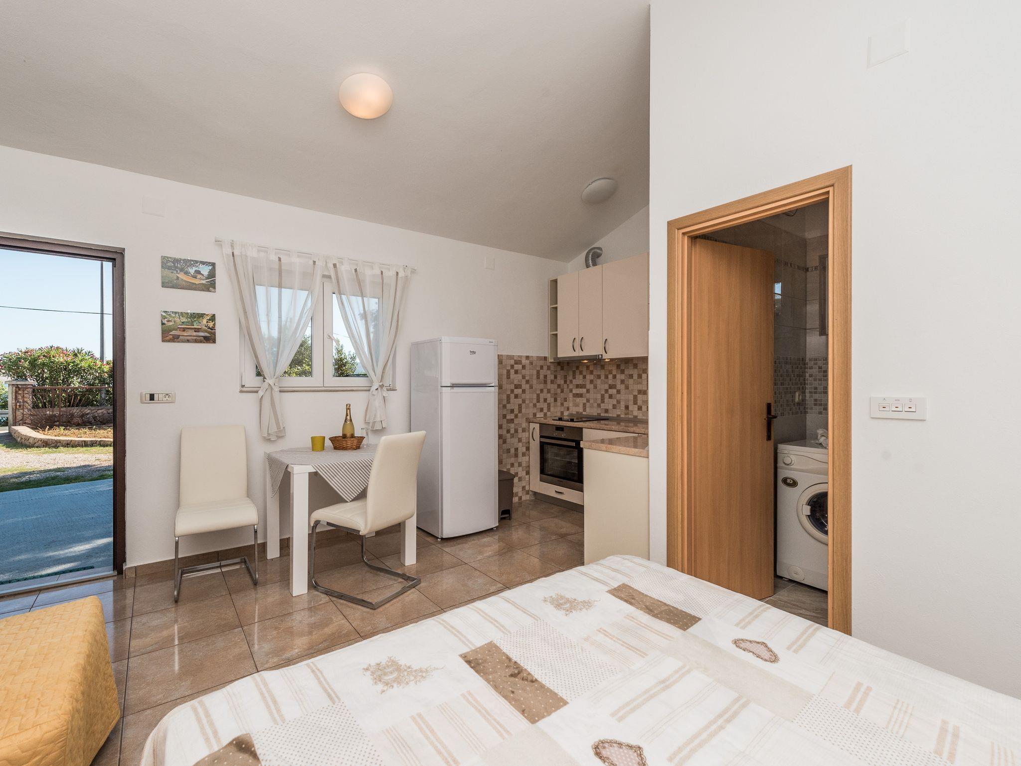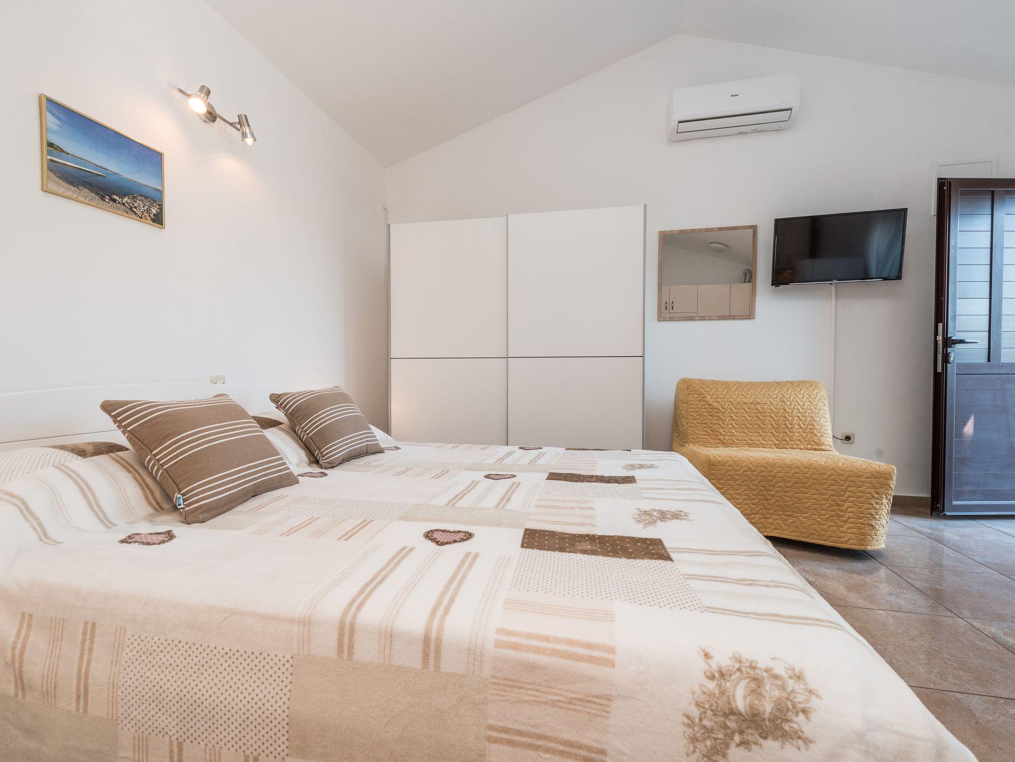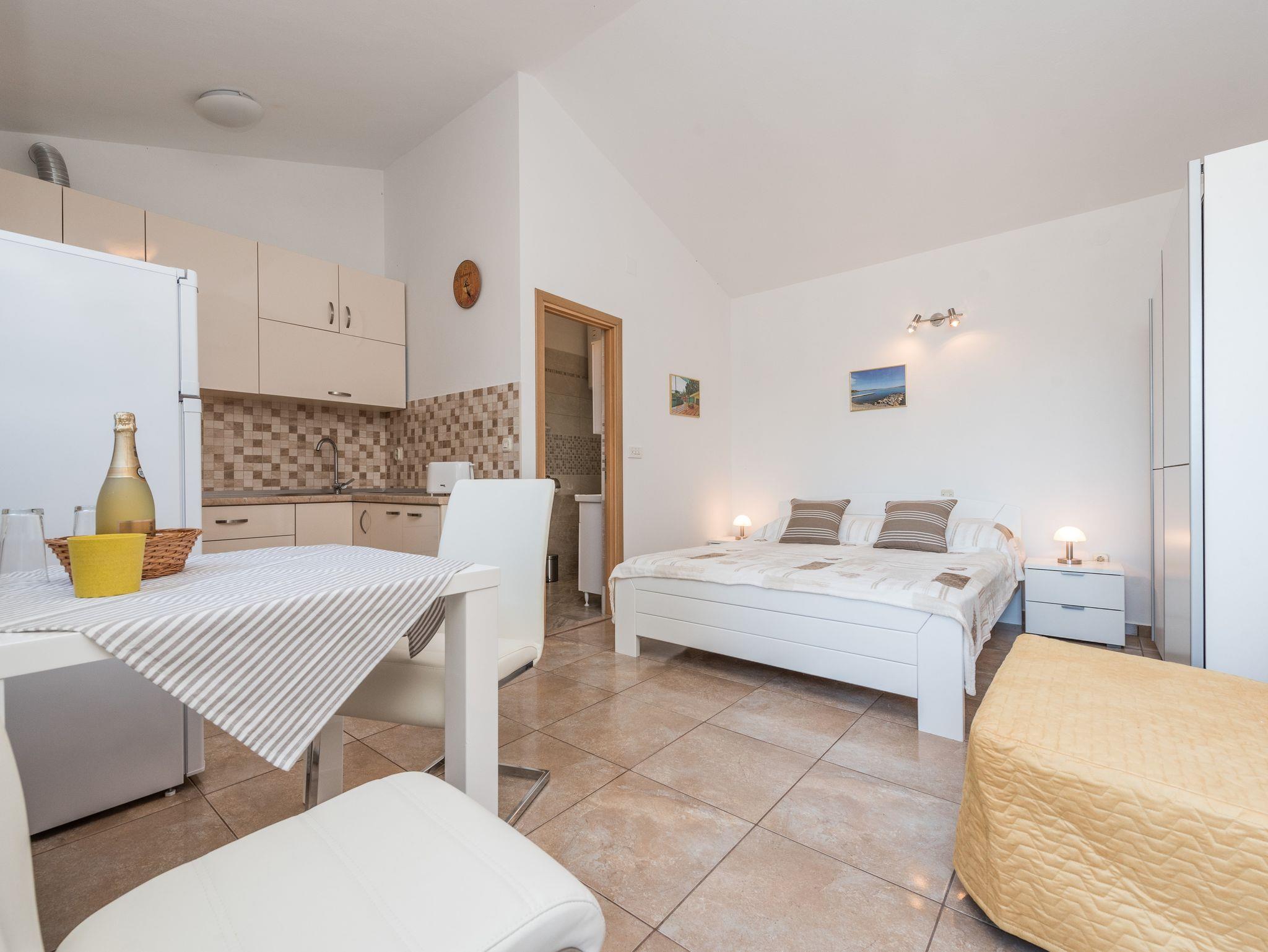 Studio bietet Platz für 2 Gäste. Die Betten sind in Schlafzimmern, die es 1 gibt, innerhalb einer Gesamtfläche von 22m2, angeordnet. Die Gäste haben eine eigene Terrasse zur Verfügung, auf der sie in warmen Sommernächten genießen können. Das Studio-Apartment bietet Meerblick. Für vollen Genuss und Entspannung gibt es einen privaten Grill für Gäste dieser Unterkunft. In der Unterkunftseinheit besteht die Möglichkeit des Mitbringens von Haustieren gegen Aufpreis. IM PREIS INBEGRIFFEN: Kurtaxe, Endreinigung, Klimatisierung, Parkplatz, Internet, Bügeleisen, Bügelbrett, Föhn, Sonnenschirm. VERBINDLICHE ZUSÄTZLICHE KOSTEN: Aufzahlung für Kurzaufenthalte (prozentualer Zuschlag pro Nächtigungsanzahl: 30% - 1, 20% - 2, 10% - 3). UNVERBINDLICHE ZUSÄTZLICHE KOSTEN: Haustiere (8,00 € pro Nacht). Die Verfügbarkeit zusätzlicher Dienstleistungen in Ihrem reservierten Termin und die Preise derselben (falls nicht aufgeführt) müssen im Voraus überprüft werden. Zusätzliche Dienstleistungen die in der Zahlungsaufforderung nicht aufgeführt sind werden direkt beim Vermieter bezahlt, angenommen der Gast nutzt auch diese.