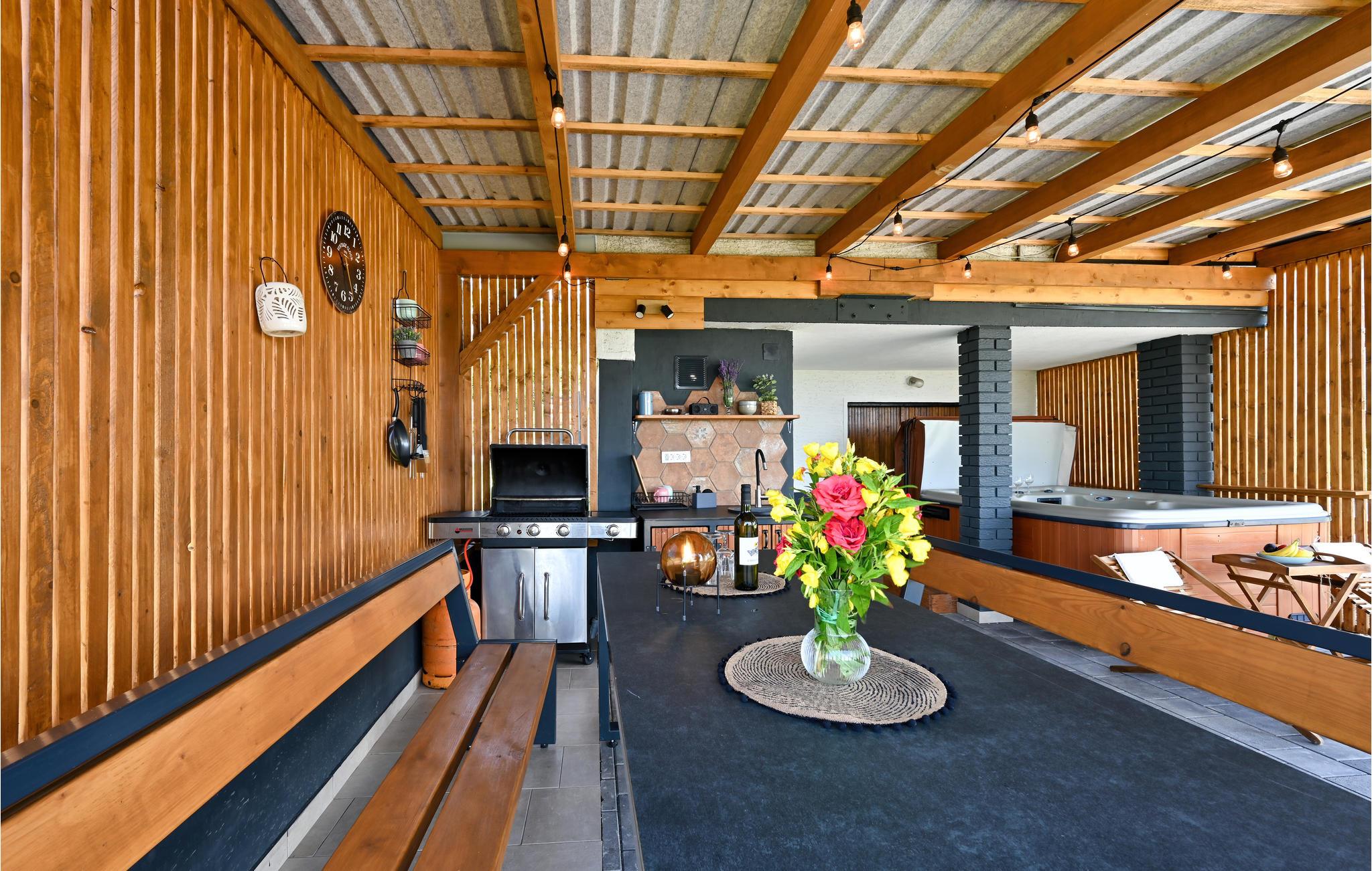 Brug meget tid udendørs med familien og gør den store overdækkede terrasse til jeres anden stue. Slap af i spabadet eller tag en grill om aftenen. børnene vil også finde masser af legeredskaber at lege med på græsplænen.