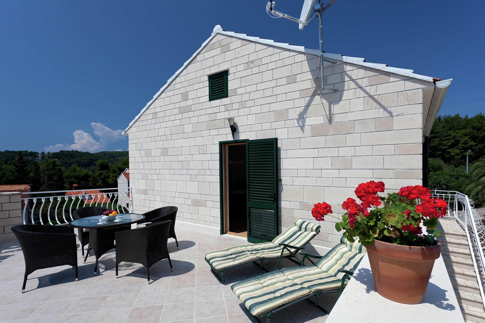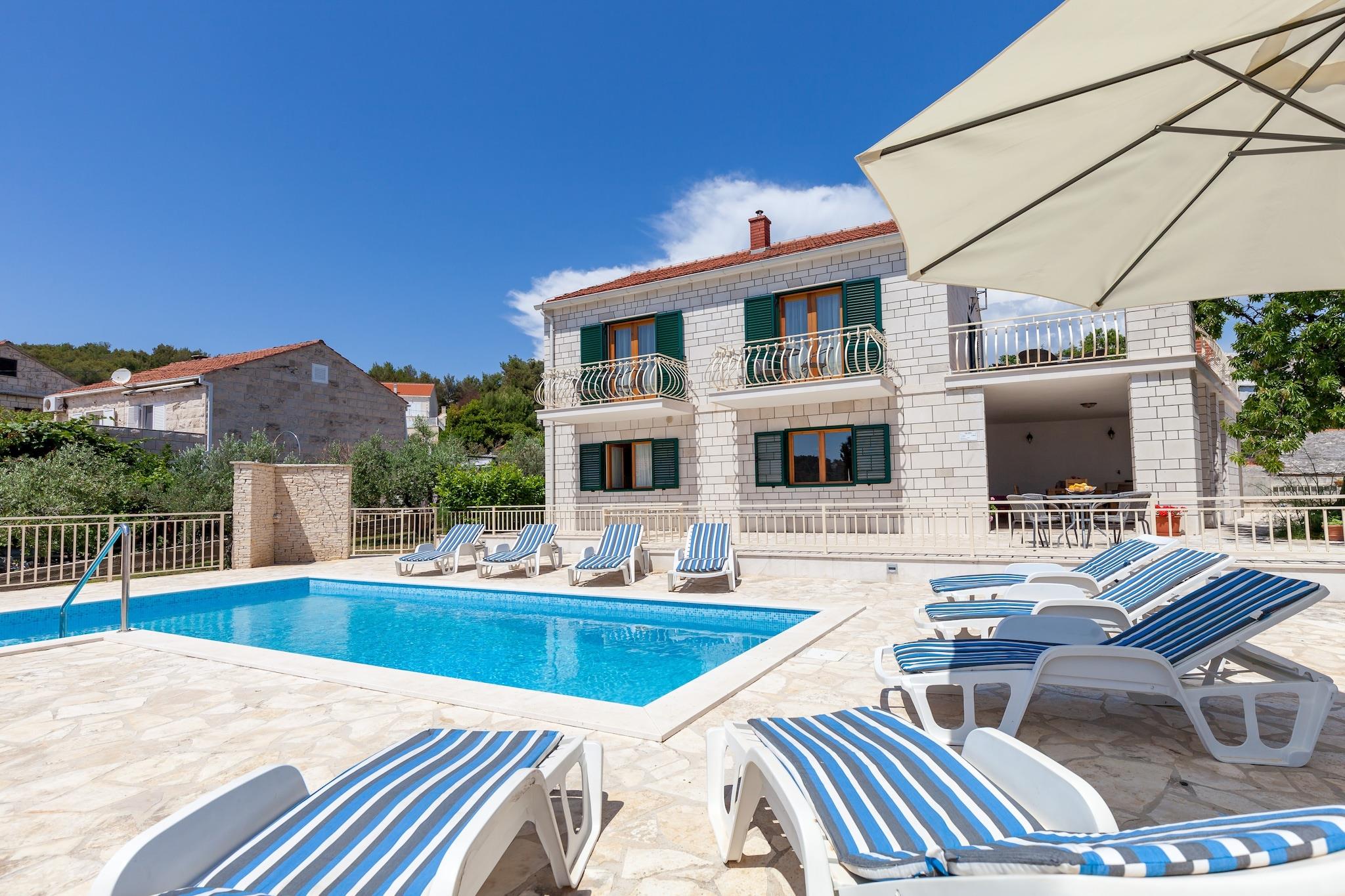 Dette smukke feriehus er et traditionelt dalmatisk stenhus, der er blevet fuldstændig renoveret og ligger i den maleriske landsby Sumartin på den kroatiske ø Brac ved Adriaterhavet. Det rummer 10 personer og er kun et stenkast væk fra det krystalklart hav. Hvis du søger at slappe af og nyde dig selv, så er du på det rigtige sted på dette store feriehus. Indenfor har huset mange antikke møbler, der skaber en dejlig karakteristisk atmosfære med resten af udsmykningen.Den elegante og rummelige værelser giver dig den fred, du fortjener. Desuden har du alle de faciliteter, såsom et veludstyret køkken, hvor du kan overraske din ferie virksomhed med din madlavning færdigheder. I stueetagen er der et køkken / spisestue / opholdsstue, separat toilet, et soveværelse med eget badeværelse og en smuk have med middelhavs vegetation og en haveterrasse med swimmingpool. øverste etage har 3 soveværelser, 2 badeværelser, 2 balkoner og en møbleret stor terrasse med fantastisk havudsigt. Stueetagen og første sal er forbundet med en udendørs trappe. Til din rådighed er også en udendørs børns legeplads ound og bordtennis. Du er i et fantastisk sted, og du kan gøre alt hvad du vil. Du er på den vidunderlige ø Brac, der er kendt som et paradis for svømning, surfing og dykning. Så uanset hvad du vil, er der noget for enhver smag.