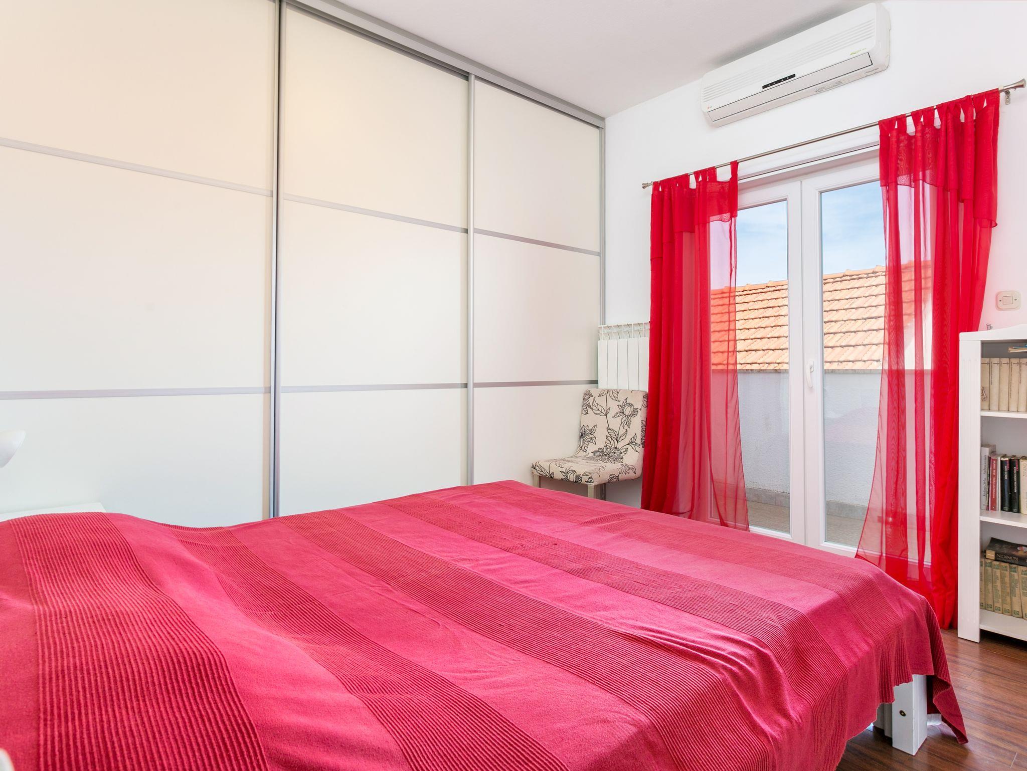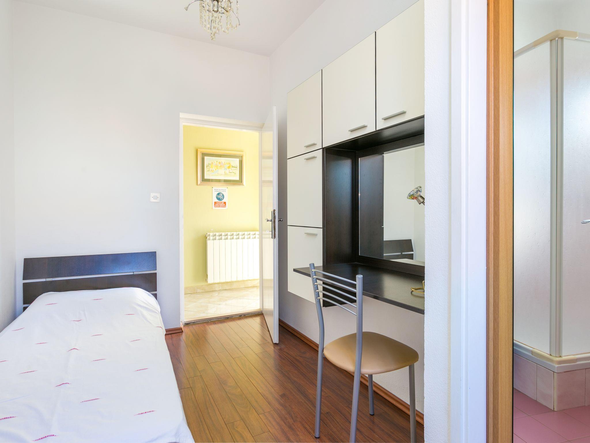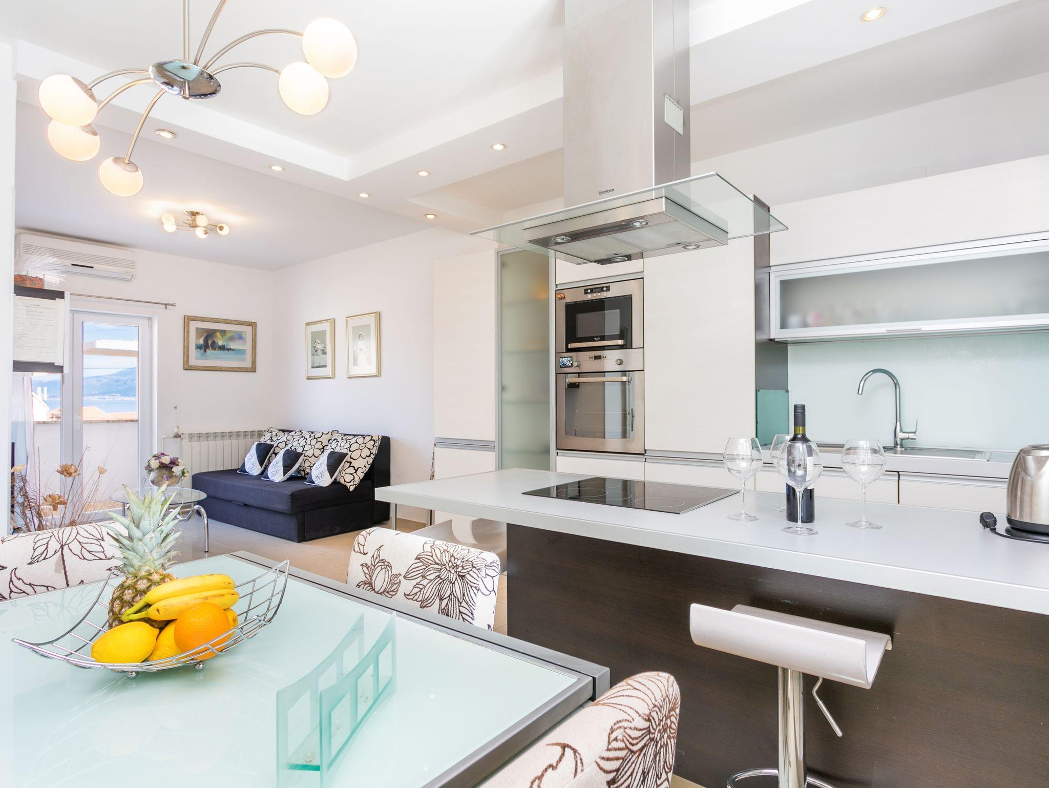 Ferienwohnung bietet Platz für 6 Gäste. Die Betten sind in Schlafzimmern, die es 3 gibt, und in Wohnzimmer, innerhalb einer Gesamtfläche von 74m2, angeordnet. Die Gäste haben eine eigene Terrasse zur Verfügung, auf der sie in warmen Sommernächten genießen können. Das Apartment bietet Meerblick. Es ist erlaubt, Speisen auf dem Gemeinschafts-Grill vorzubereiten. IM PREIS INBEGRIFFEN: Kurtaxe, Endreinigung, Klimatisierung, Parkplatz, Internet, Kinderbett, Bügeleisen, Bügelbrett, Föhn, tragbarer Grill. VERBINDLICHE ZUSÄTZLICHE KOSTEN: Aufzahlung für Kurzaufenthalte (prozentualer Zuschlag pro Nächtigungsanzahl: 30% - 1, 20% - 2, 10% - 3). Die Verfügbarkeit zusätzlicher Dienstleistungen in Ihrem reservierten Termin und die Preise derselben (falls nicht aufgeführt) müssen im Voraus überprüft werden. Zusätzliche Dienstleistungen die in der Zahlungsaufforderung nicht aufgeführt sind werden direkt beim Vermieter bezahlt, angenommen der Gast nutzt auch diese.