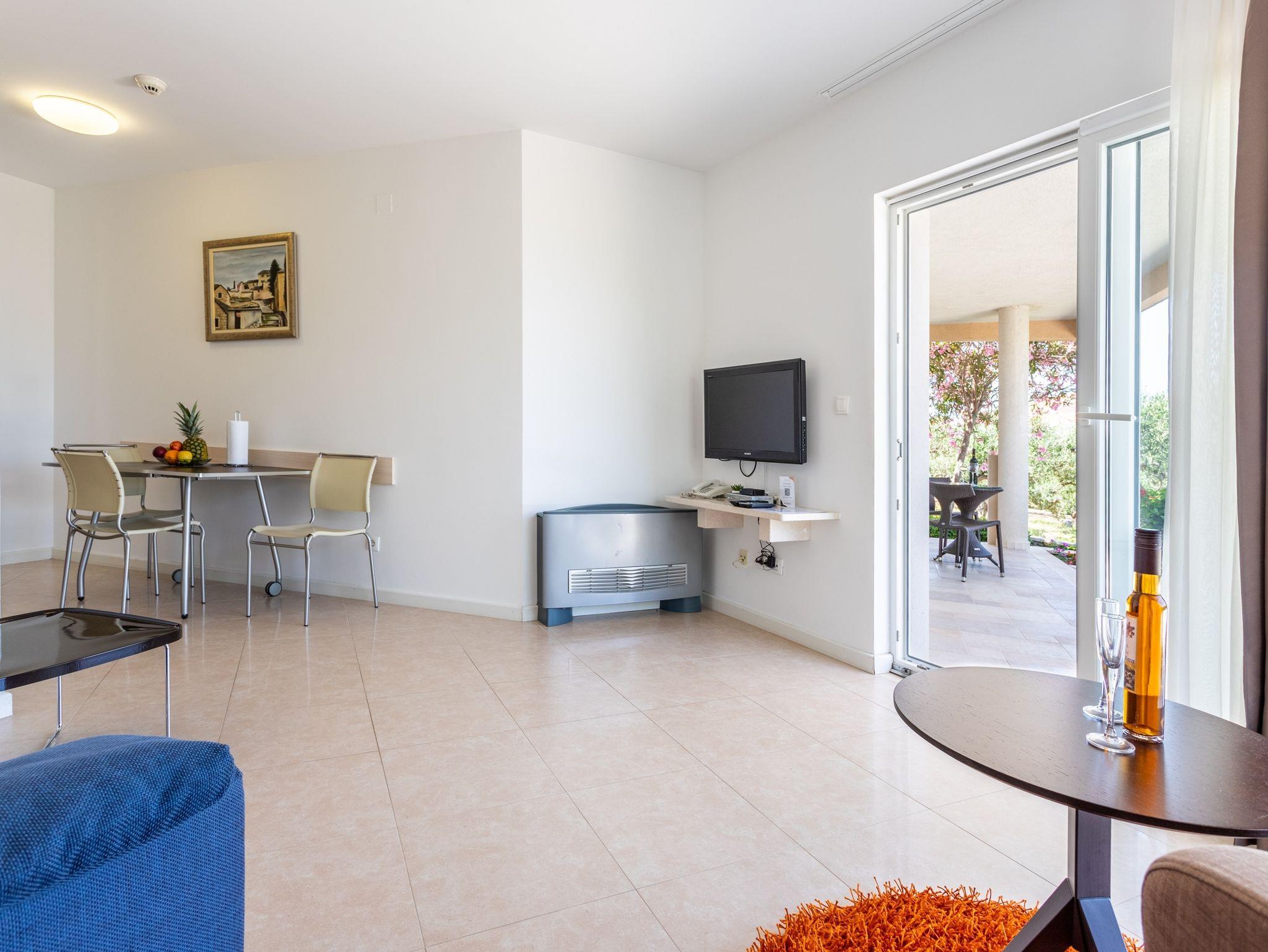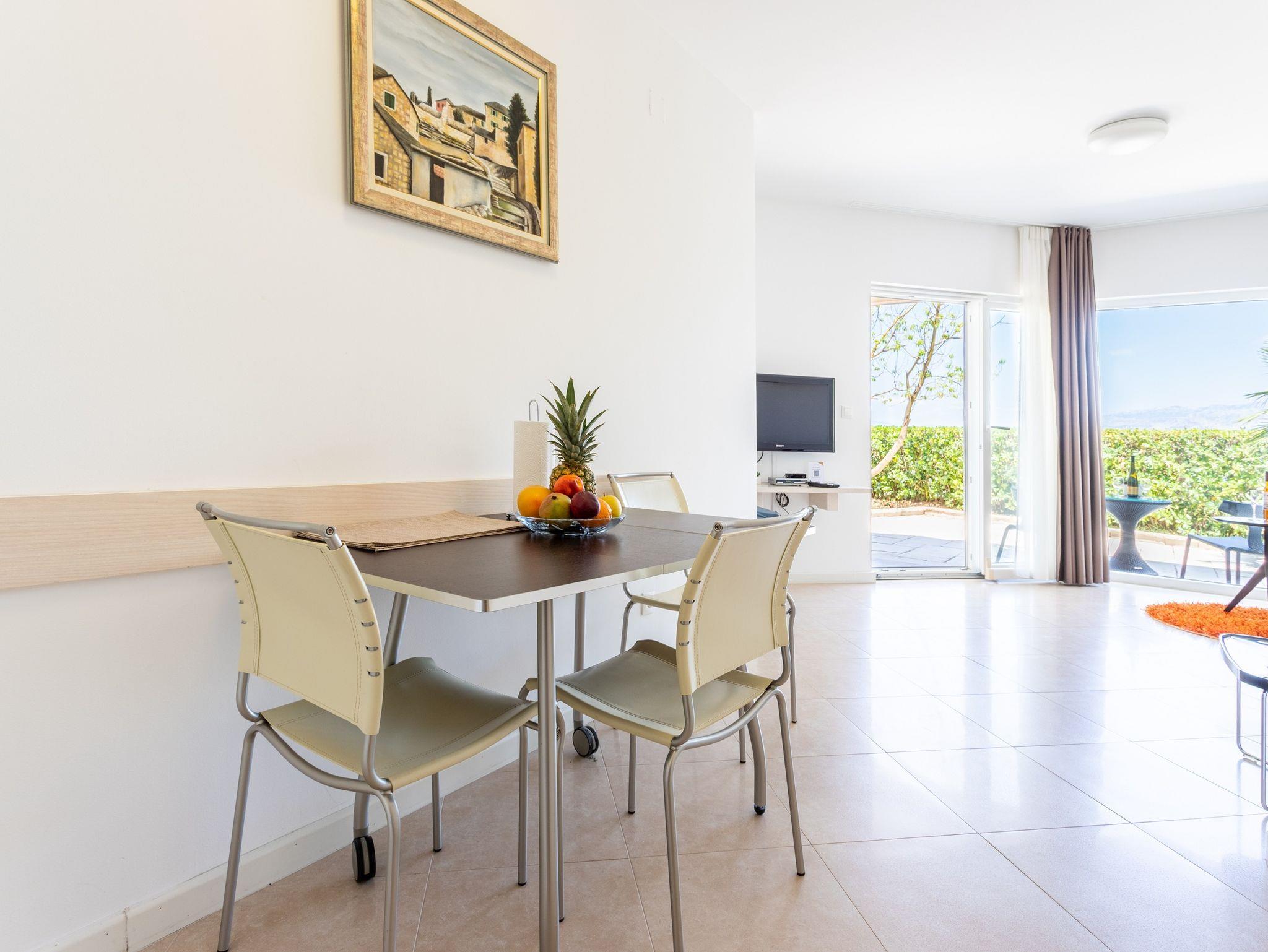 Ferienwohnung bietet Platz für 2 Gäste. Die Betten sind in Schlafzimmern, die es 2 gibt, innerhalb einer Gesamtfläche von 51m2, angeordnet. Die Gäste haben eine eigene Terrasse zur Verfügung, auf der sie in warmen Sommernächten genießen können. Das Apartment bietet Meerblick. Es ist erlaubt, Speisen auf dem Gemeinschafts-Grill vorzubereiten. Während ihres Aufenthalts können Gäste das gemeinsam zur Nutzung stehende Schwimmbad benutzen. IM PREIS INBEGRIFFEN: Kurtaxe, Endreinigung, Klimatisierung, Zentralheizung, Pool, Parkplatz, Internet, Kinderbett, Bügeleisen, Bügelbrett, Föhn, 2 Kinderbettchen (im Preis enthalten). VERBINDLICHE ZUSÄTZLICHE KOSTEN: Aufzahlung für Kurzaufenthalte (prozentualer Zuschlag pro Nächtigungsanzahl: 30% - 1, 20% - 2, 10% - 3). Die Verfügbarkeit zusätzlicher Dienstleistungen in Ihrem reservierten Termin und die Preise derselben (falls nicht aufgeführt) müssen im Voraus überprüft werden. Zusätzliche Dienstleistungen die in der Zahlungsaufforderung nicht aufgeführt sind werden direkt beim Vermieter bezahlt, angenommen der Gast nutzt auch diese.