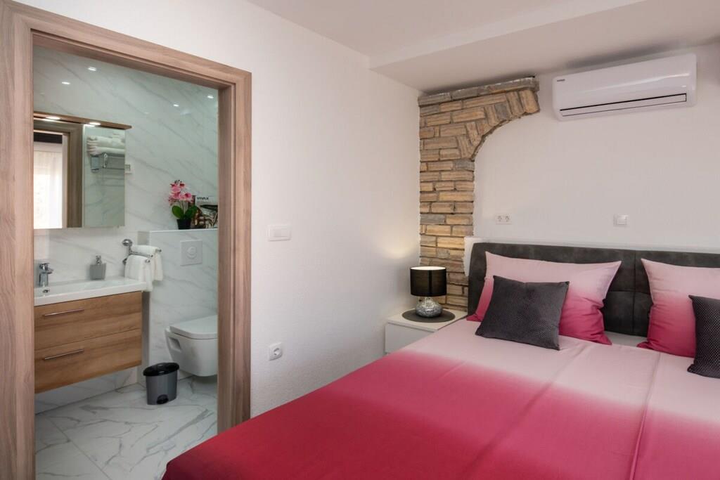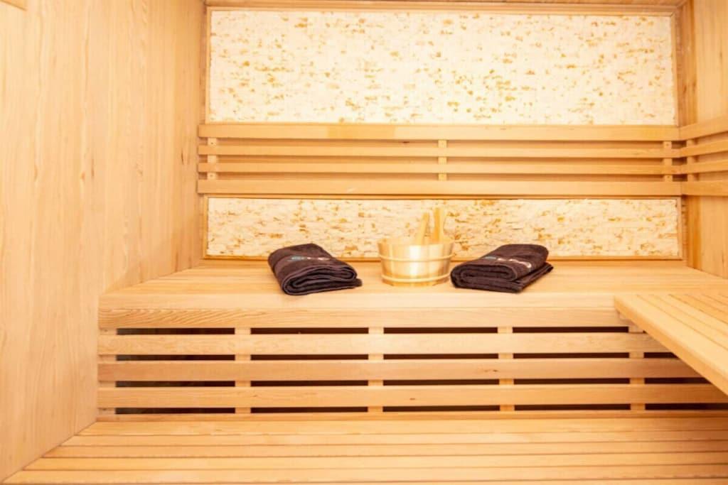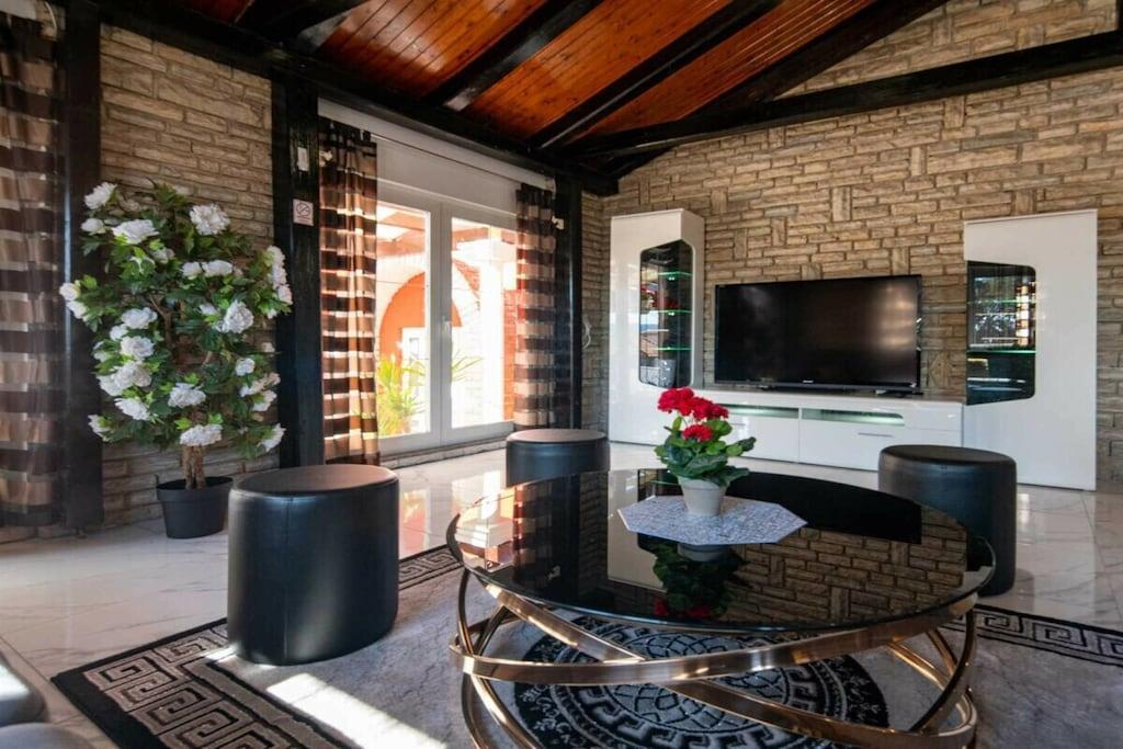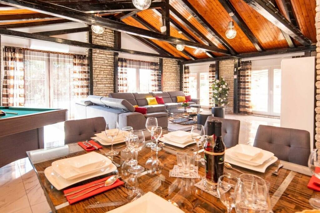 Die schön gestaltete Einrichtung bietet 8 klimatisierte Schlafzimmer mit 8 Badezimmern. Es gibt auch eine Gemeinschaftsküche und ein gemütliches Wohnzimmer mit vielen Möglichkeiten für Unterhaltung und Entspannung. Für zusätzlichen Komfort gibt es eine finnische Sauna, einen beheizten Pool und Jacuzzi und eine schöne Sonnenterrasse. Für die kleinsten Gäste gibt es ein 9 m² großes Kinderbecken, aber auch andere Einrichtungen für Kinder sind vorhanden. Außerdem stehen 8 Fahrräder zur Verfügung und der Ort selbst verfügt über gut ausgebaute Radwege. Nur 200 Meter vom Haus entfernt befindet sich ein Kieselstrand.