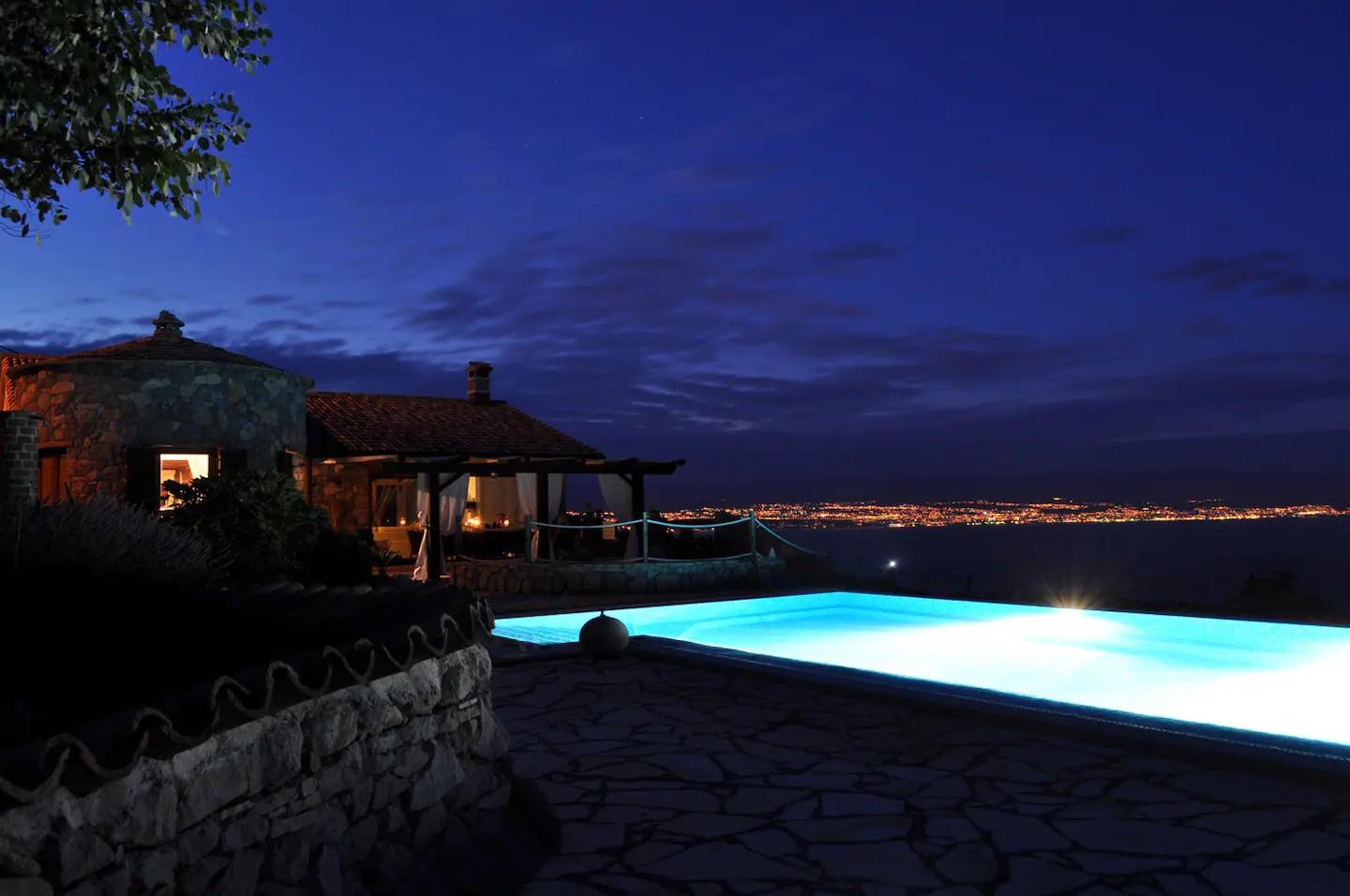 In Richtung Meer ist es vom Boden bis zum Dachspitz verglast und bietet einen atemberaubenden Blick auf die gesamte Kvarner Bucht von Rijeka bis zu den Inseln Krk und Cres. Der lichtdurchflutete, offene Raum erzeugt ein Gefühl als würde die Villa mit der Natur verschmelzen. Nachts kann man die Lichter des Hafens von Rijeka über dem Meer glitzern sehen. Das Wohnzimmer ist u.a. mit ausgewählten Designerstücken eingerichtet und bietet jeden Komfort (z.B. großer Smart TV, Sonos Soundanlage, gemütliches Tagesbett etc.). Vom Wohnzimmer kann man direkt auf eine große, überdachte Terrasse gelangen. Eine Klimaanlage mit Heizfunktion sorgt sowohl im Sommer, als auch im Herbst und Winter für eine angenehme, ausgeglichene Raumtemperatur.