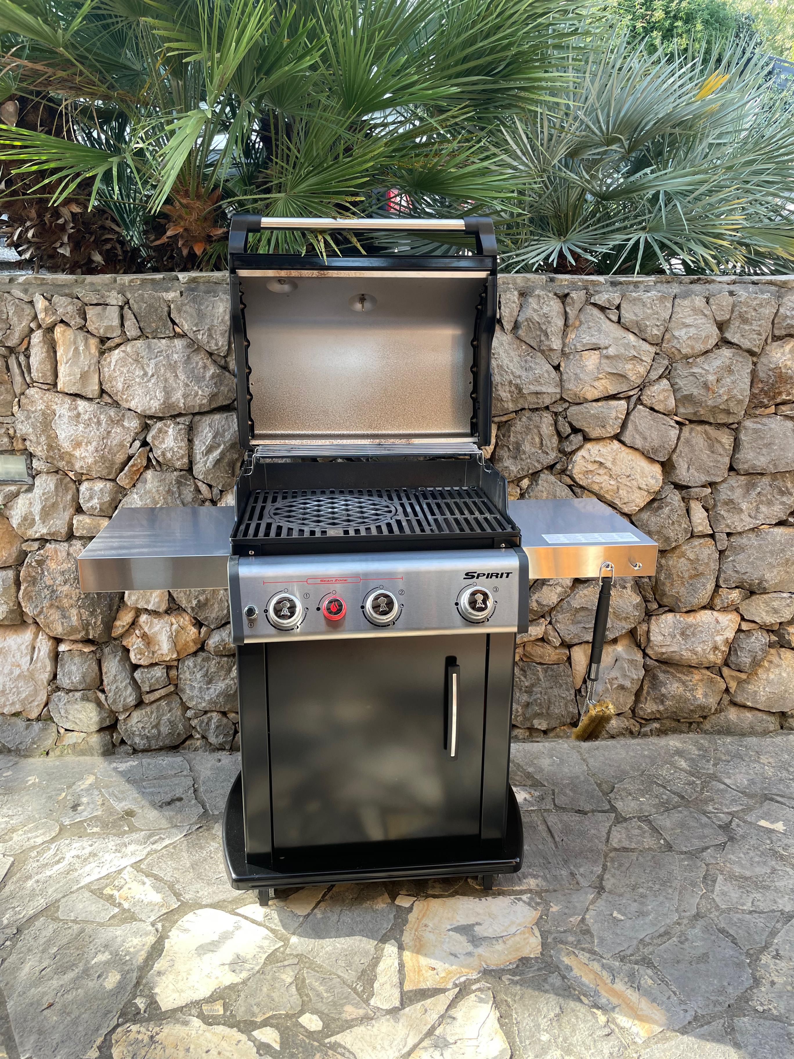 Ein großer Tisch für 10 Personen und ein Weber Gasgrill sind dort vorhanden.