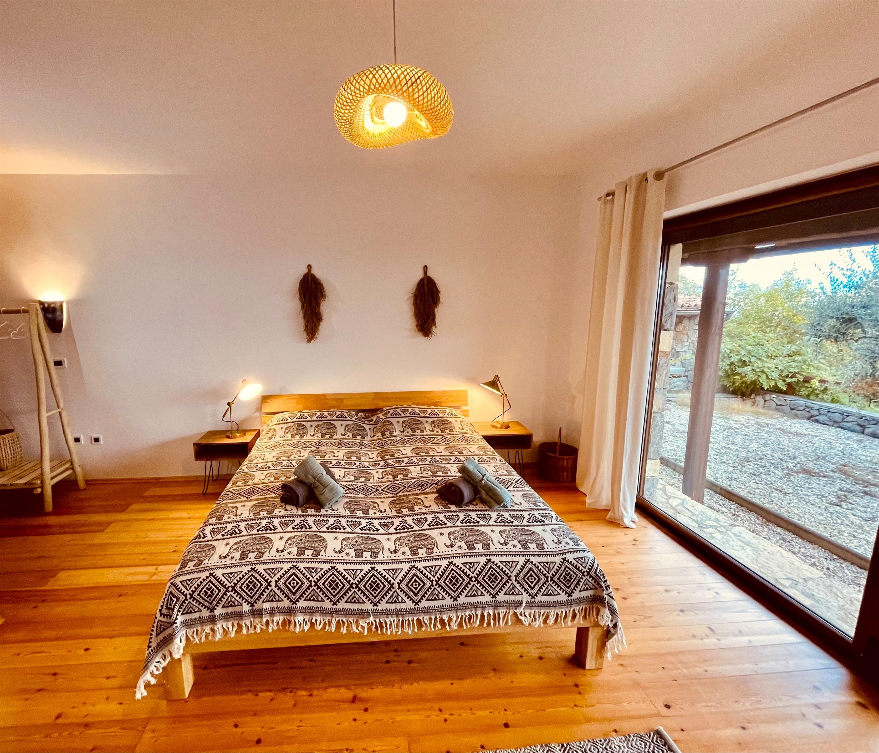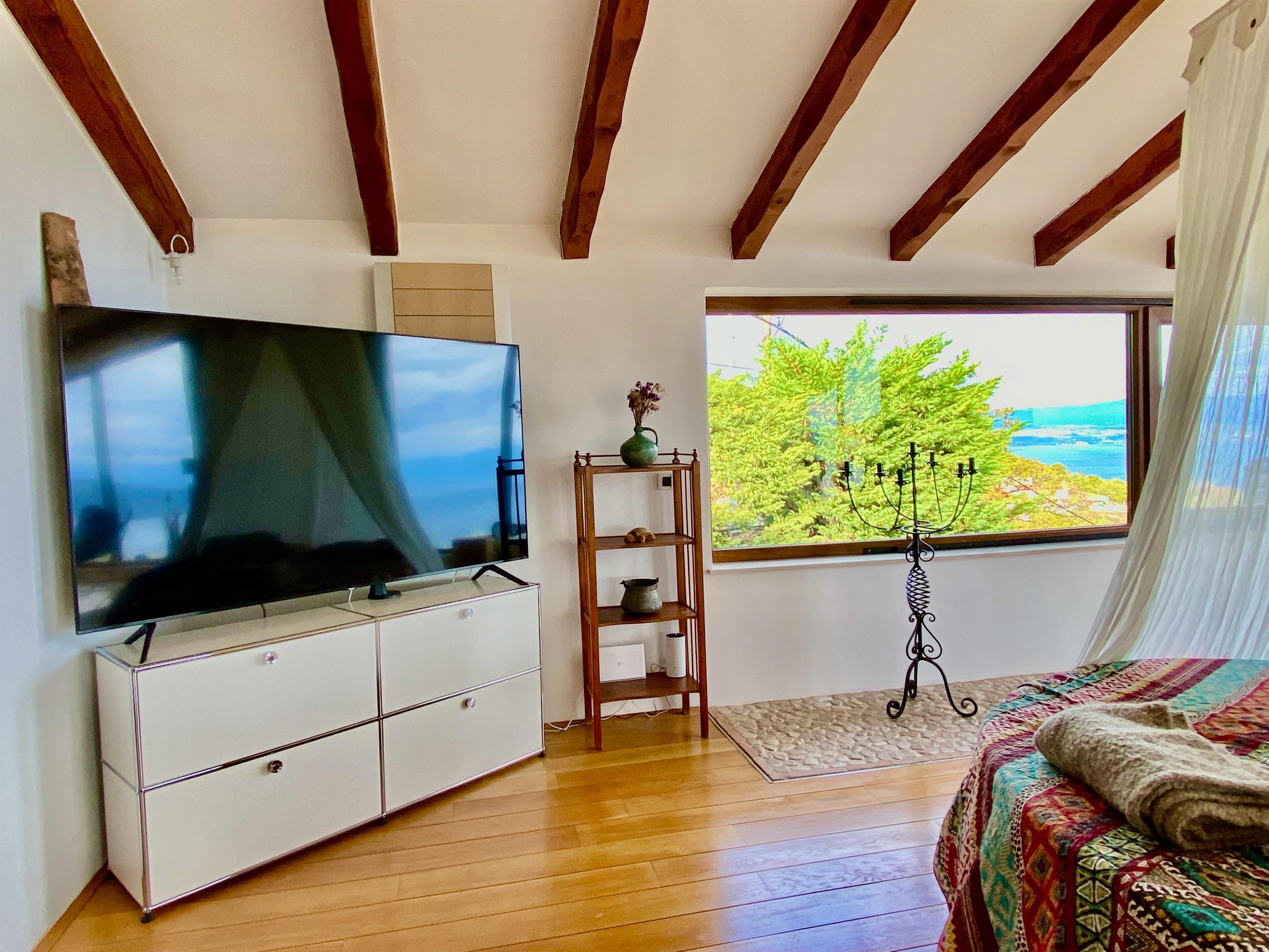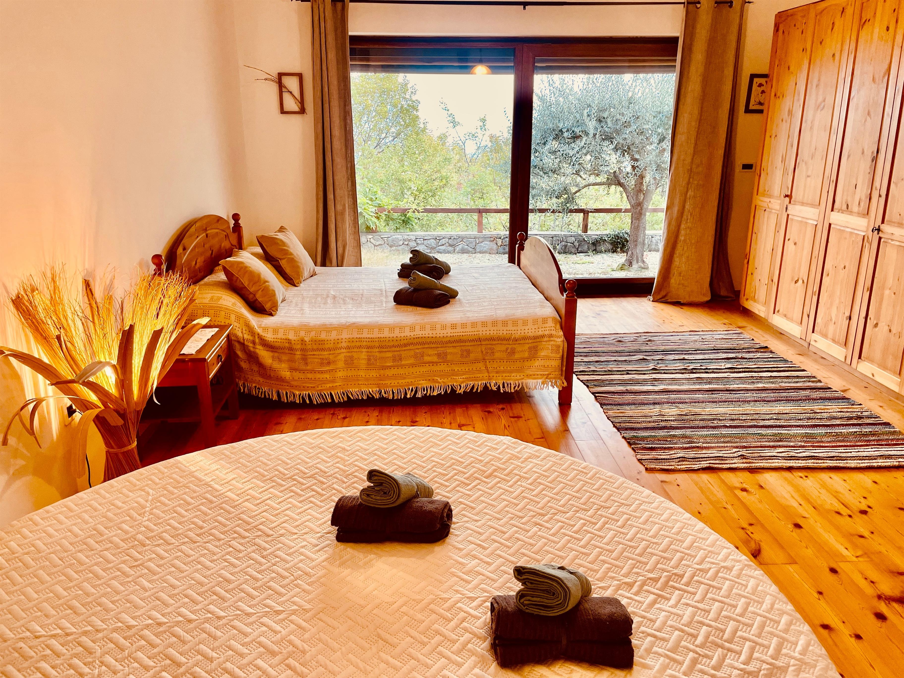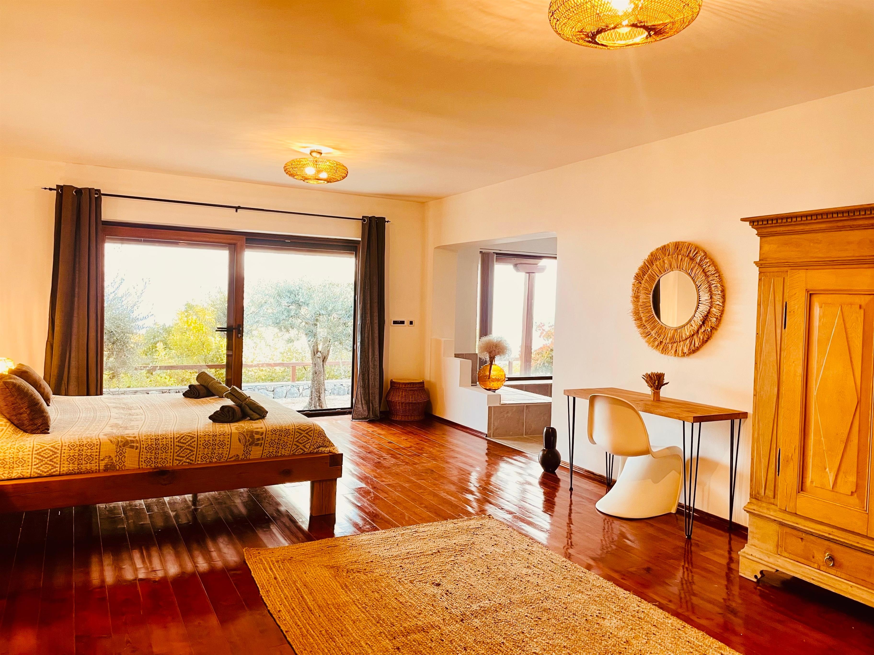 Hier befinden sich drei gemütliche und exklusiv eingerichtete Schlafzimmer, jedes mit eigenem Bad, Klimaanlage und wunderschönem Ausblick aufs Meer. Alle Zimmer haben direkten Zugang zu einer Terrasse mit alten Olivenbäumen und einer überdachten Pergola mit Kamin.