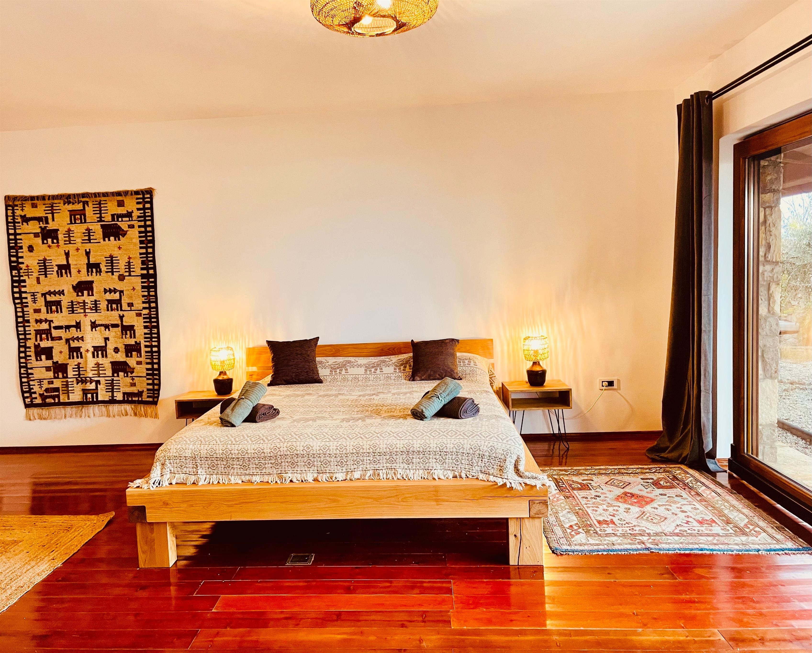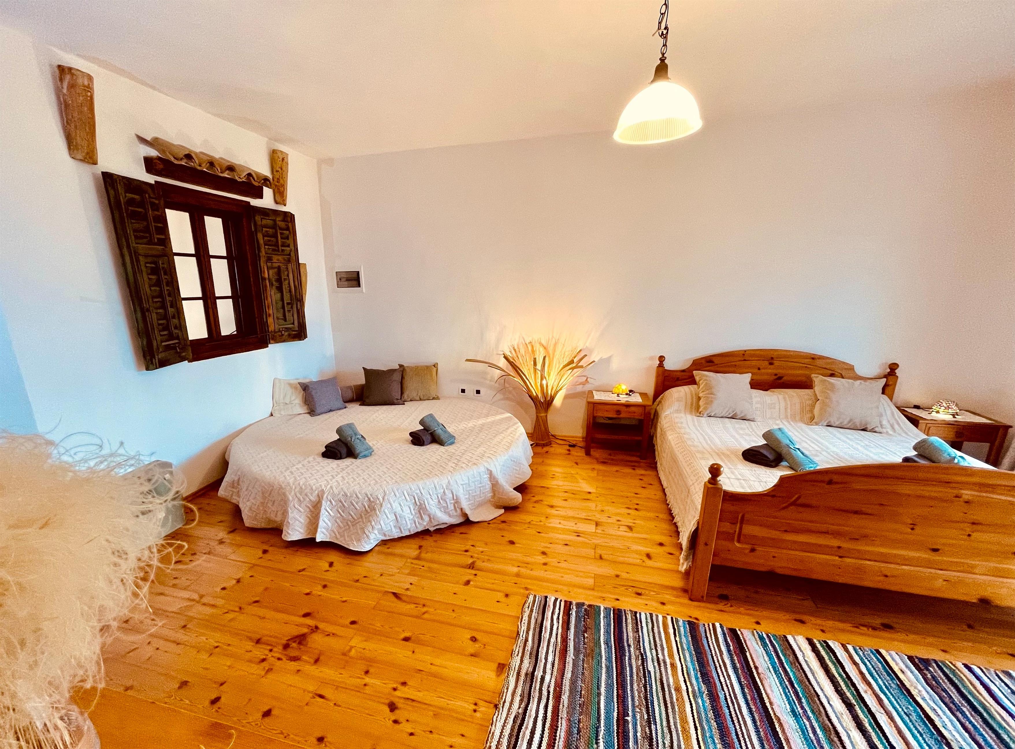 Es verfügt über ein Doppelbett (1,60m) und ein großes, rundes Bett (Durchmesser 2,10m). Das angeschlossene Bad ist mit einer Dusche ausgestattet. Ein besonderes Stilelement ist das traditionelle "istrische" Fenster, welches vom Bad zum Schlafzimmer hin geöffnet werden kann und einen herrlichen Blick aufs Meer ermöglicht.