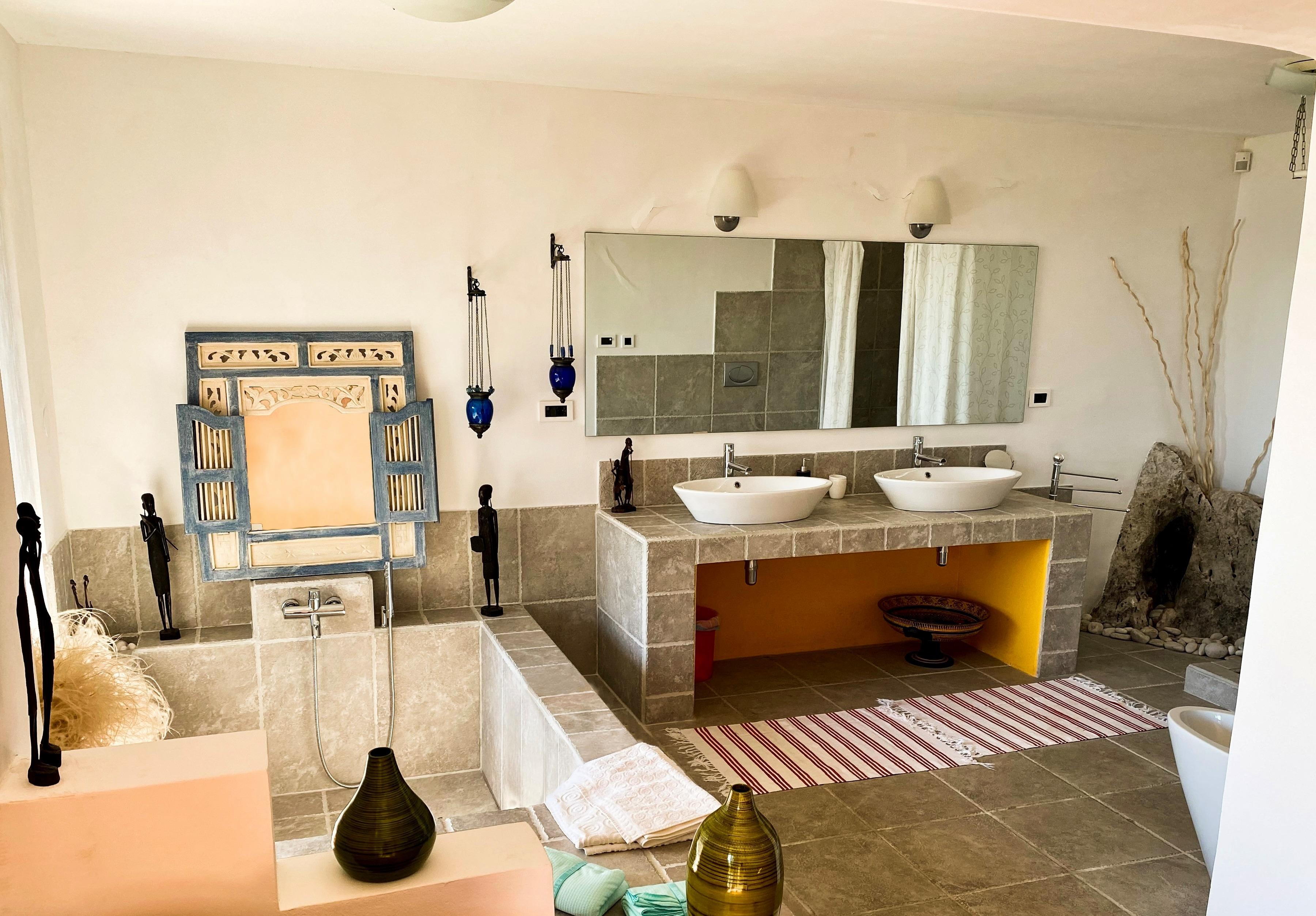 Es verfügt über ein großes Doppelbett (1,80m) und eine Schlafcouch. Das angeschlossene Badezimmer ist mit einer luxuriösen Jacuzzi Badewanne und einer Doppeldusche ausgestattet. Durch große Fenster können Sie auch vom Bad aus den Blick aufs Meer genießen.