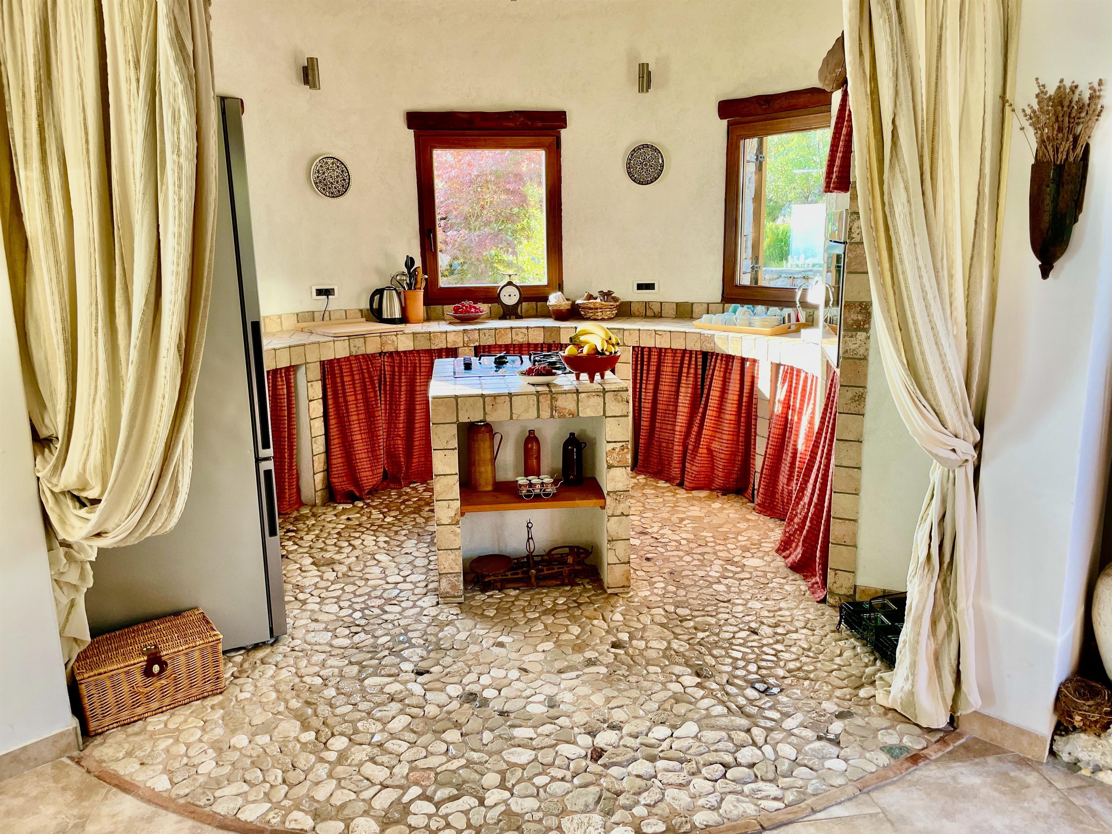 Das Zentrum bildet ein massiver Holztisch, an dem 10 Personen gemütlich sitzen können. Auch vom Esszimmer gibt es einen direkten Zugang zur Terrasse. Die Küche ist in einer alten, istrischen Bauart als "Ka¸un" errichtet worden. Es handelt sich hierbei um eine traditionelle, runde Steinküche deren Besonderheit das am Boden befindliche Mosaik aus Kieselsteinen ist.