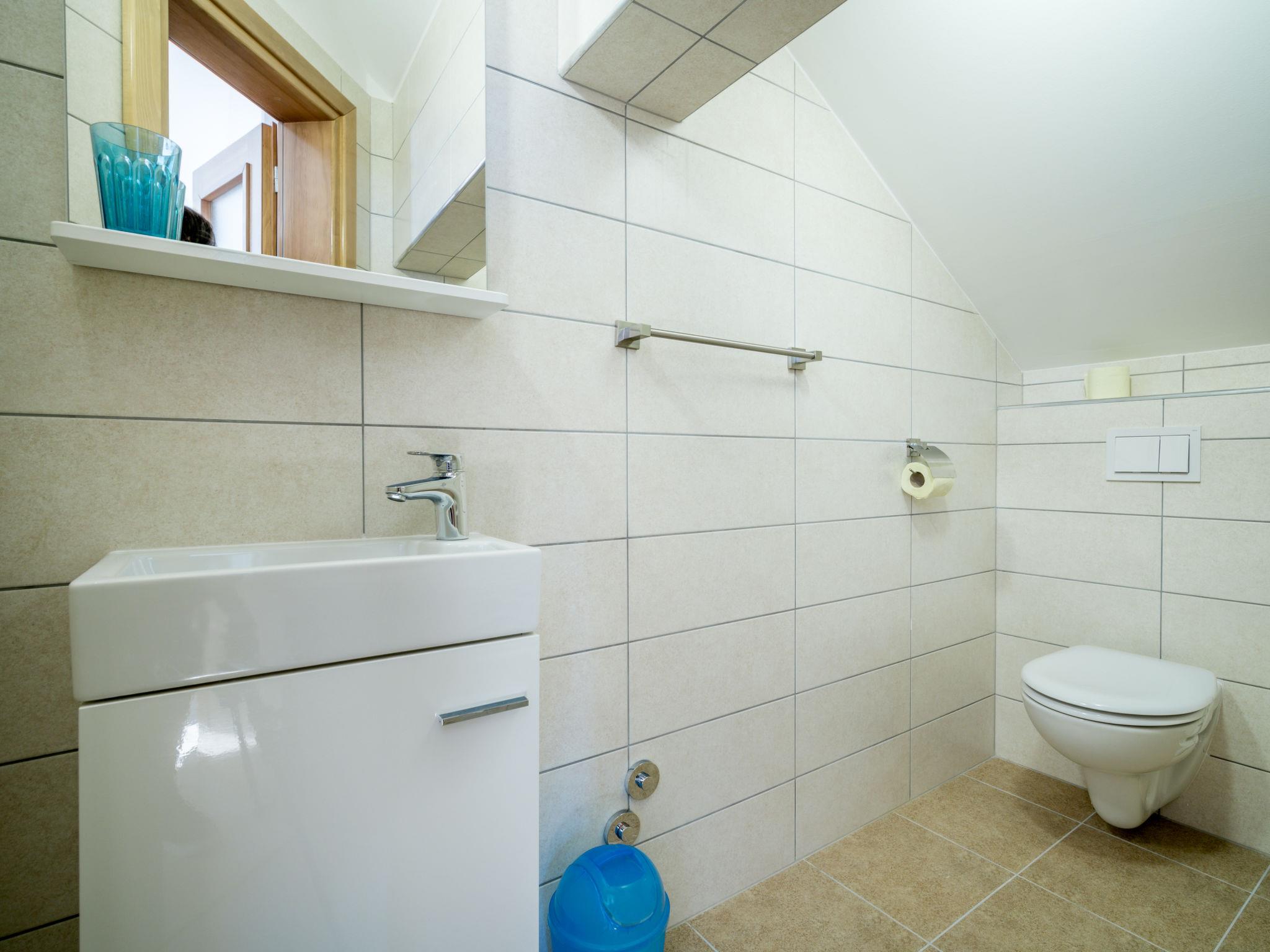 10-room house 365 m2 on 3 levels. Living/dining room 66 m2 with open-hearth fireplace (only for decoration), satellite TV (flat screen). Kitchen (oven, dishwasher, 4 ceramic glass hob hotplates, freezer, electric coffee machine). 2 sep. WC's. Upper floor: living/dining room with 1 sofabed (150 cm, length 200 cm), kitchen corner and satellite TV (flat screen). Exit to the terrace. 1 room with 1 french bed (160 cm, length 200 cm). Living/dining room with sloping ceilings, ceiling height 113 - 270 cm with 1 sofabed (150 cm, length 200 cm), kitchen corner and satellite TV (flat screen). 1 room with sloping ceilings, ceiling height 113 - 270 cm with 1 french bed (160 cm, length 200 cm). Living/dining room with 1 sofabed (150 cm, length 200 cm), satellite TV (flat screen). 1 room with sloping ceilings, ceiling height 113 - 270 cm with 1 french bed (160 cm, length 200 cm). Open kitchen (oven, 2 ceramic glass hob hotplates, freezer). 3 showers/WC. Top floor: living/dining room with sloping ceilings, ceiling height 120 - 250 cm with separate WC and satellite TV (flat screen). 1 room with sloping ceilings, ceiling height 120 - 250 cm with 1 french bed (160 cm, length 200 cm), shower/WC. 1 room with sloping ceilings, ceiling height 120 - 250 cm with 1 bed (90 cm, length 200 cm), hip bath/WC. With sloping ceilings, open kitchen (2 ceramic glass hob hotplates, microwave, freezer), ceiling height 120 - 250 cm. Heating (extra). Terrace 9 m2, roofed. Terrace furniture, deck chairs. Facilities: baby cot. Internet (WiFi, free). Maximum 1 pet/ dog allowed. Three apartments on the first floor, each apartment with living/dining area, open kitchen and bedroom. One apartment on the top floor with living/dining area, open kitchen, one bedroom with 1 french bed and small windows, one bedroom with 1 bed. Terrace 9 m2, roofed, with sloping ceilings, ceiling height 152 - 250 cm.