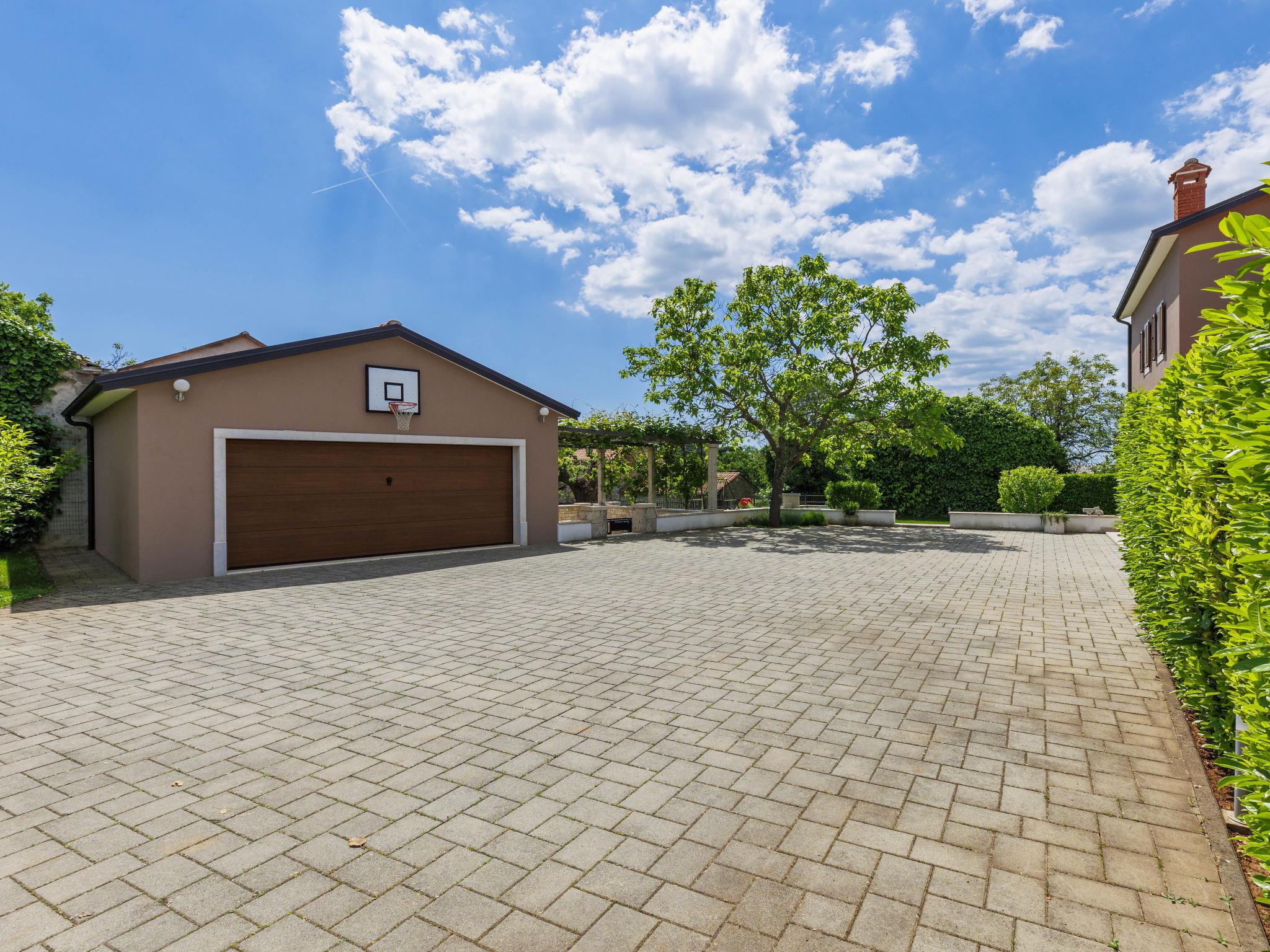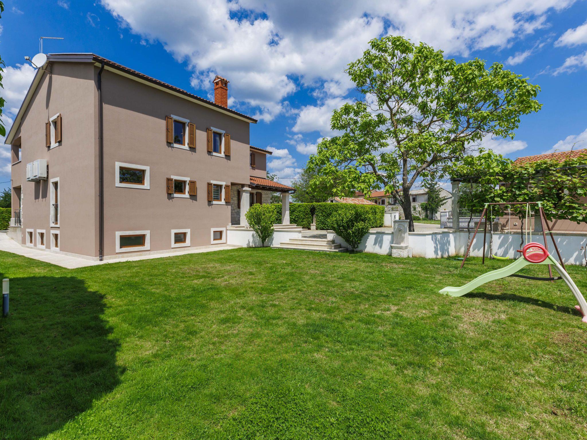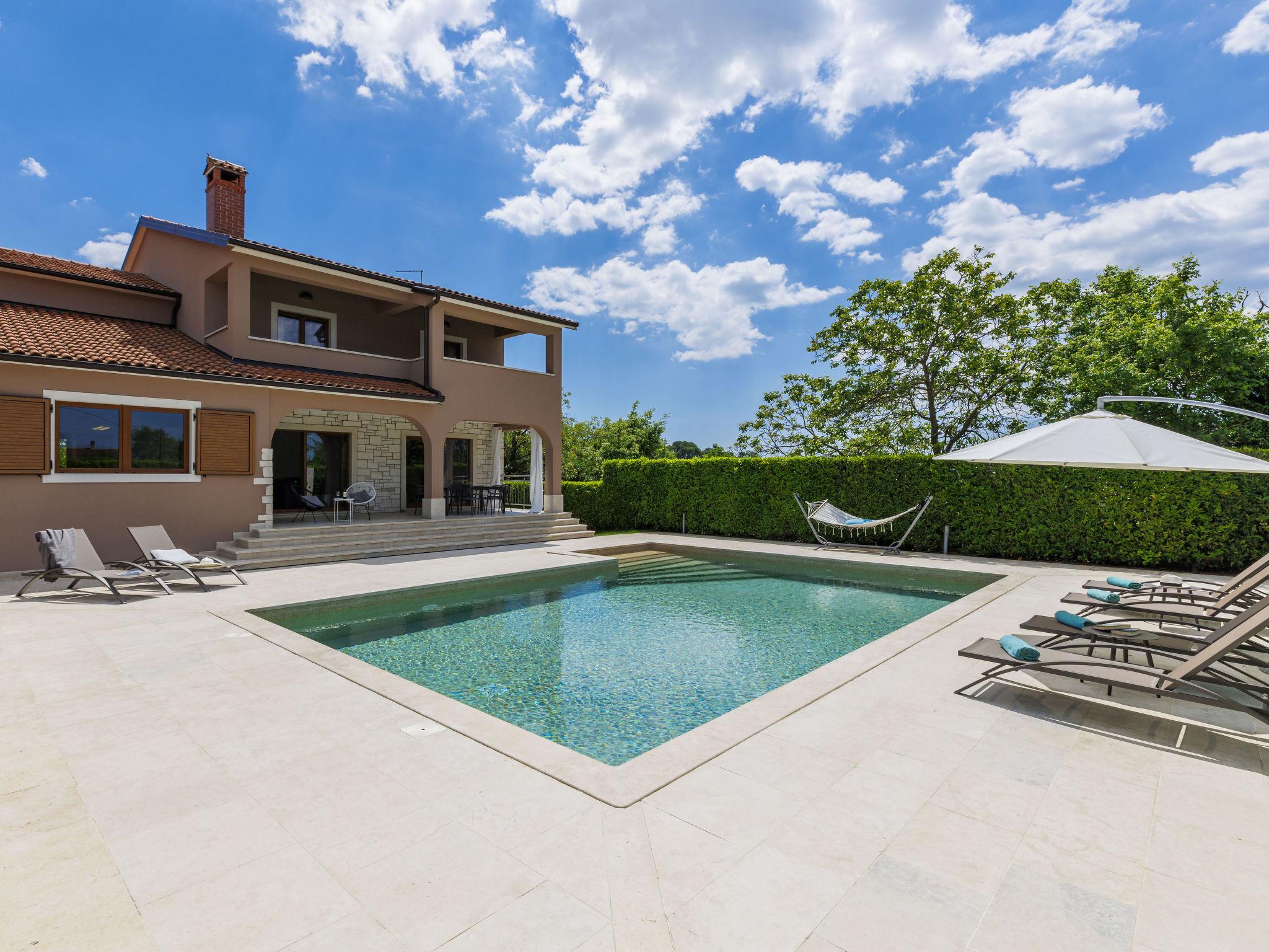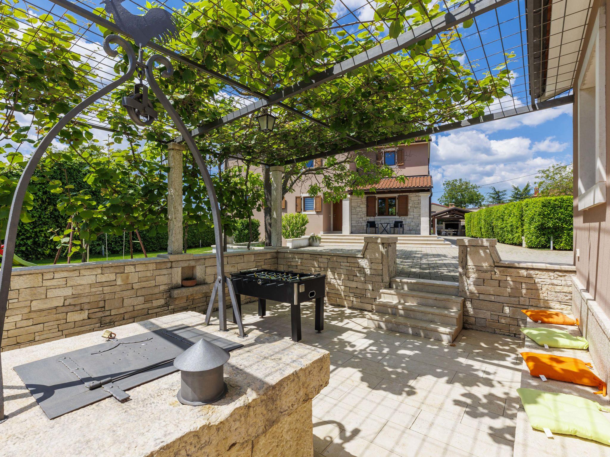 Child friendly, beautiful, comfortable villa "Anastasia", 2 storeys. 6 km from the centre of Žminj, 13 km from the centre of Pazin, in a sunny position, 27 km from the sea, 27 km from the beach, in the countryside. Private: property 1'800 m2 (fenced), beautiful garden with lawn 200 m2, swimming pool (10 x 6 m, depth 140 cm, seasonal availability: 27.Apr. - 26.Oct.) with internal staircase. Outdoor shower, basketball, terrace, garden furniture, barbecue, children's playground. In the house: internet access, table football, washing machine, tumble dryer. Parking at the house on the premises. Shop 500 m, supermarket 6 km, restaurant 1 km, café 400 m, bus stop 6.9 km, railway station 1 km, pebble beach 27 km. Riding stable 7 km, walking paths from the house 1 km, cycle lane 1 km. Available: darts.