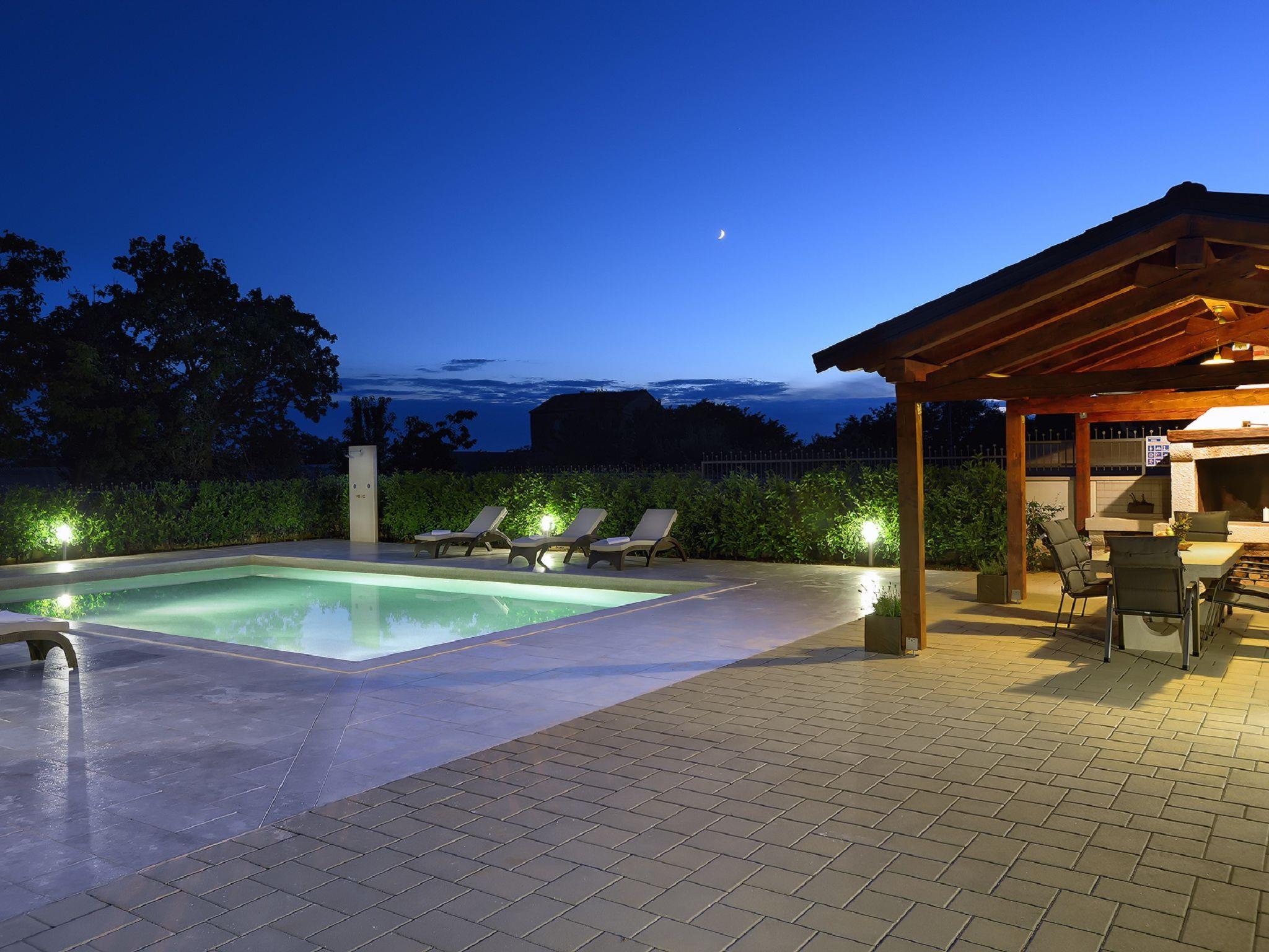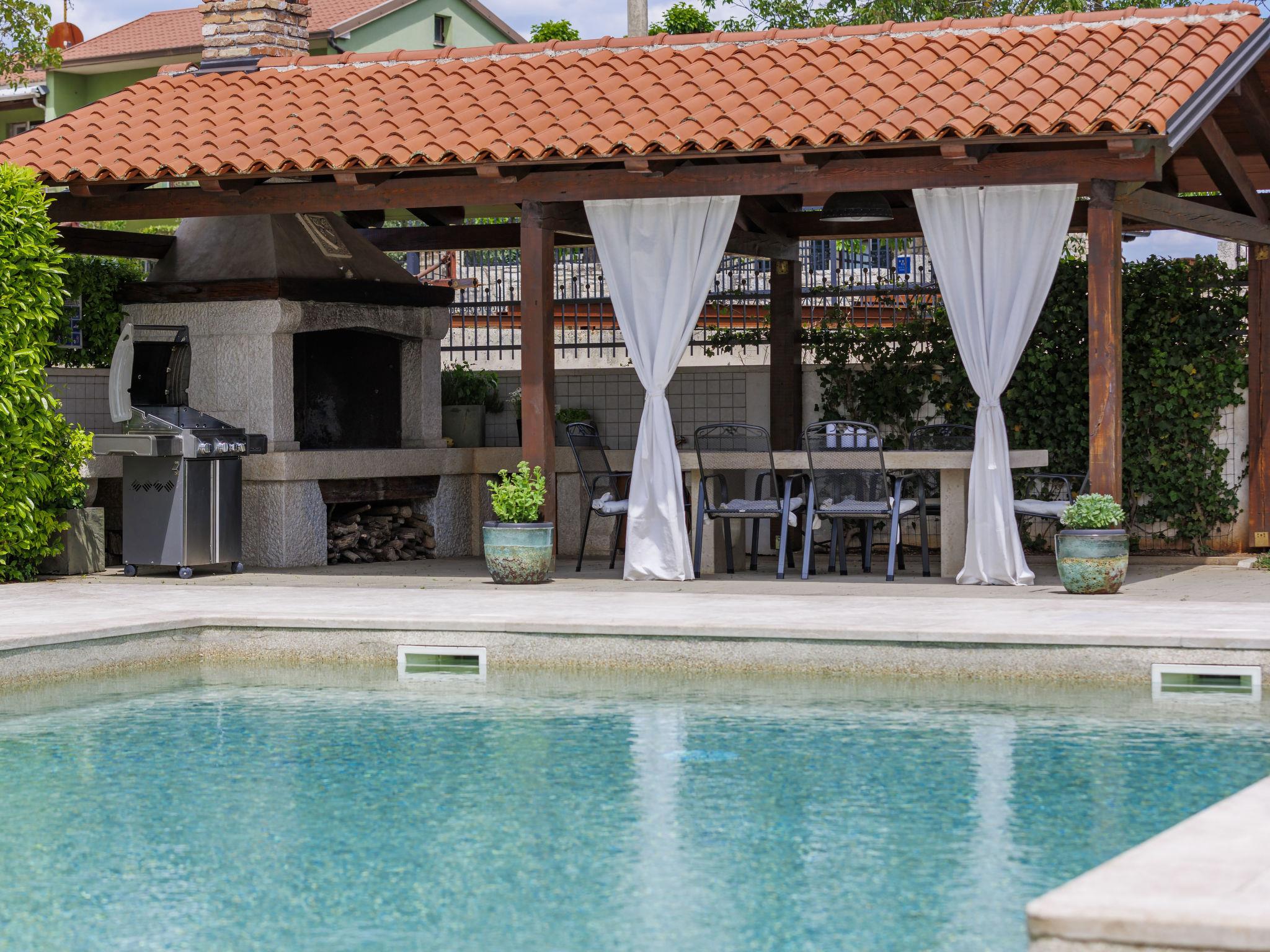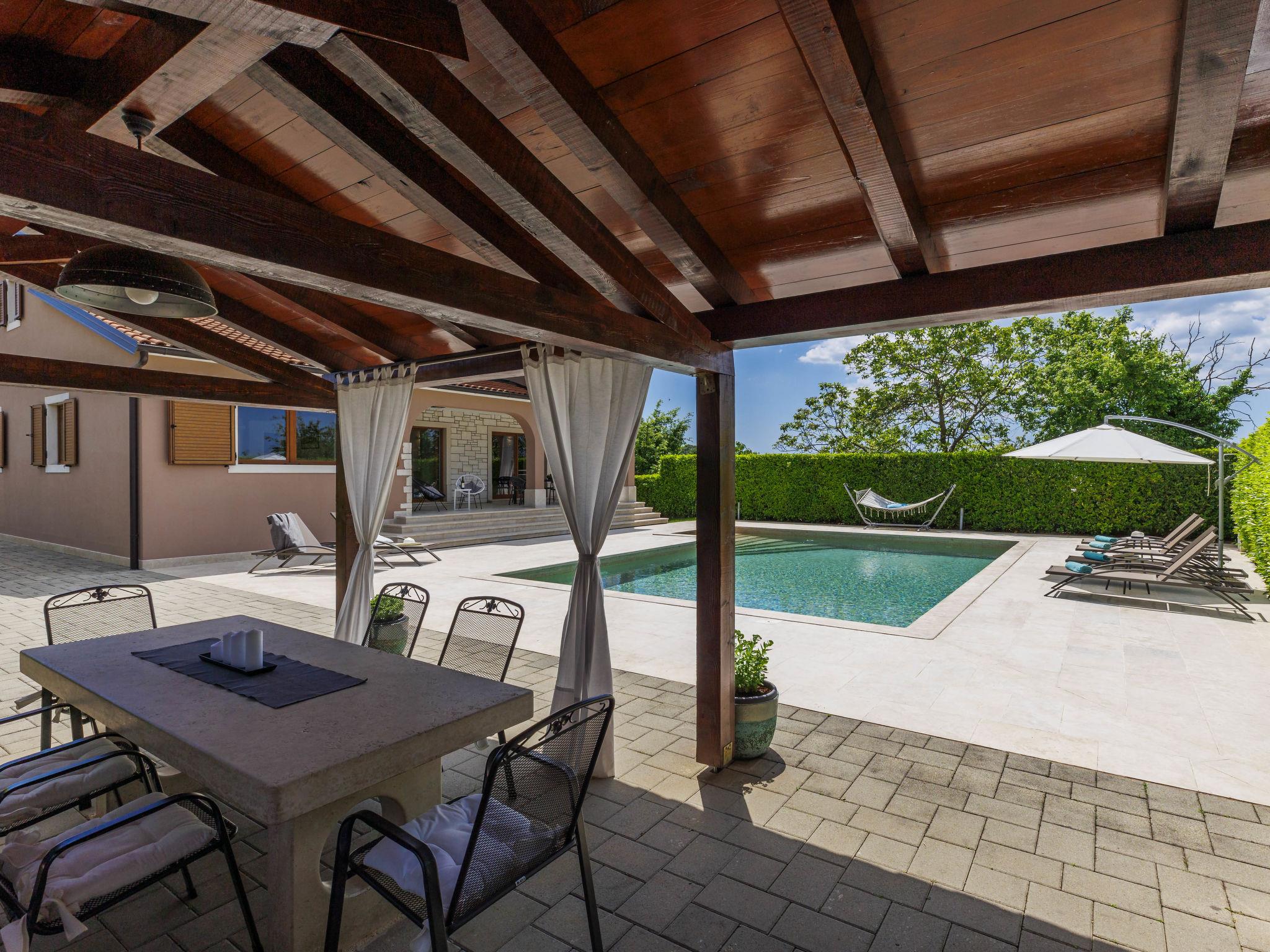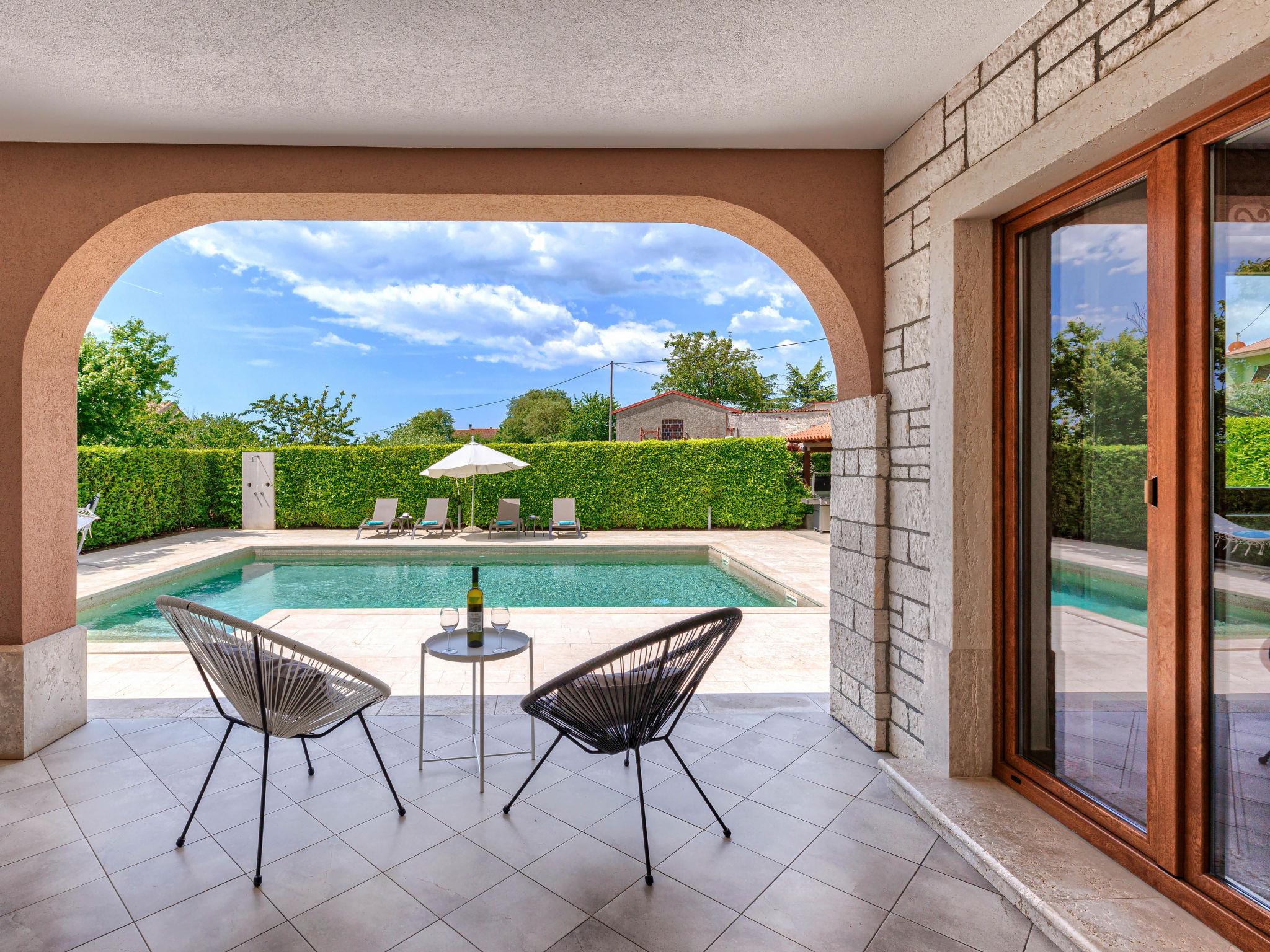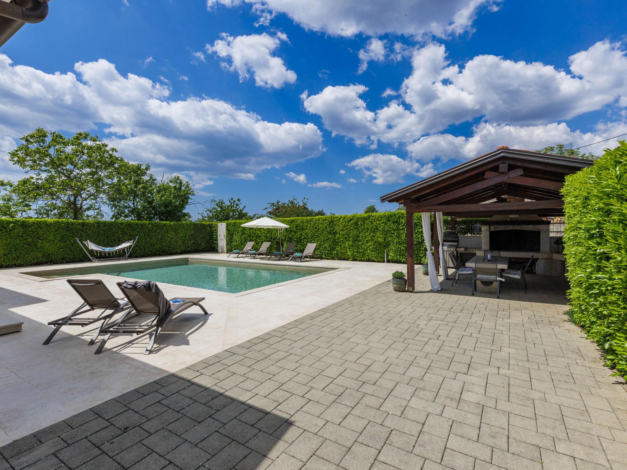 Child friendly, beautiful, comfortable villa "Anastasia", 2 storeys. 6 km from the centre of Žminj, 13 km from the centre of Pazin, in a sunny position, 27 km from the sea, 27 km from the beach, in the countryside. Private: property 1'800 m2 (fenced), beautiful garden with lawn 200 m2, swimming pool (10 x 6 m, depth 140 cm, seasonal availability: 27.Apr. - 26.Oct.) with internal staircase. Outdoor shower, basketball, terrace, garden furniture, barbecue, children's playground. In the house: internet access, table football, washing machine, tumble dryer. Parking at the house on the premises. Shop 500 m, supermarket 6 km, restaurant 1 km, café 400 m, bus stop 6.9 km, railway station 1 km, pebble beach 27 km. Riding stable 7 km, walking paths from the house 1 km, cycle lane 1 km. Available: darts.