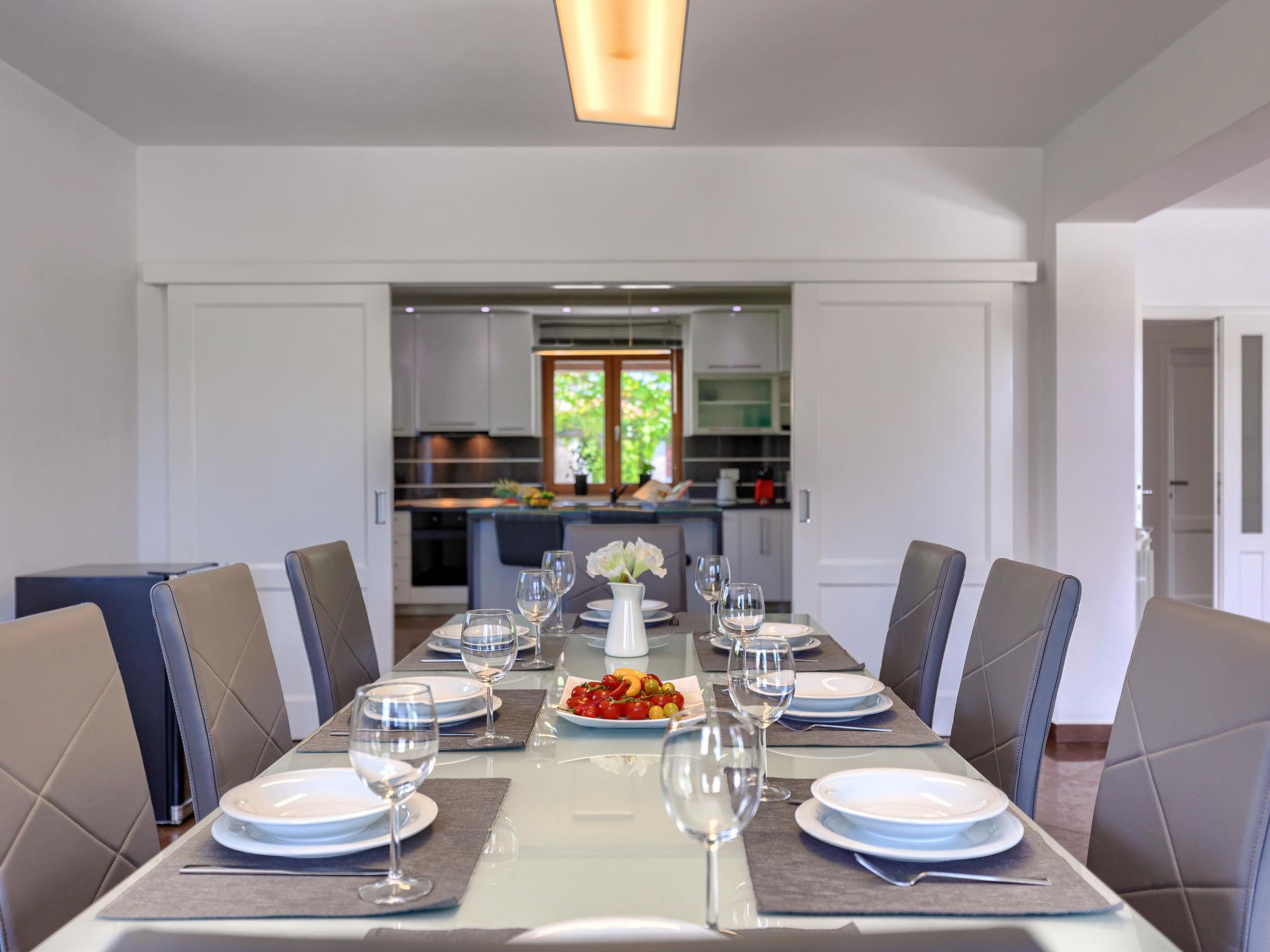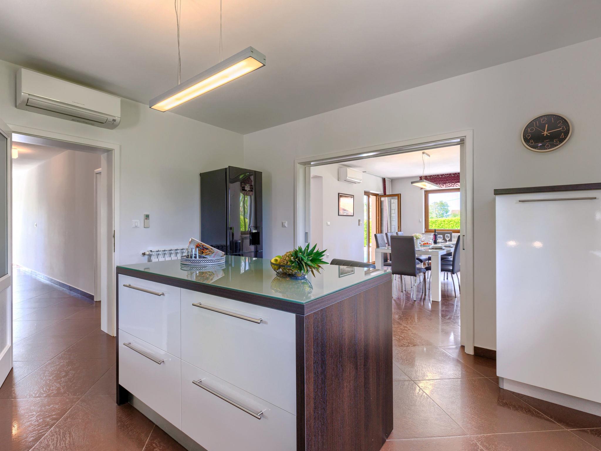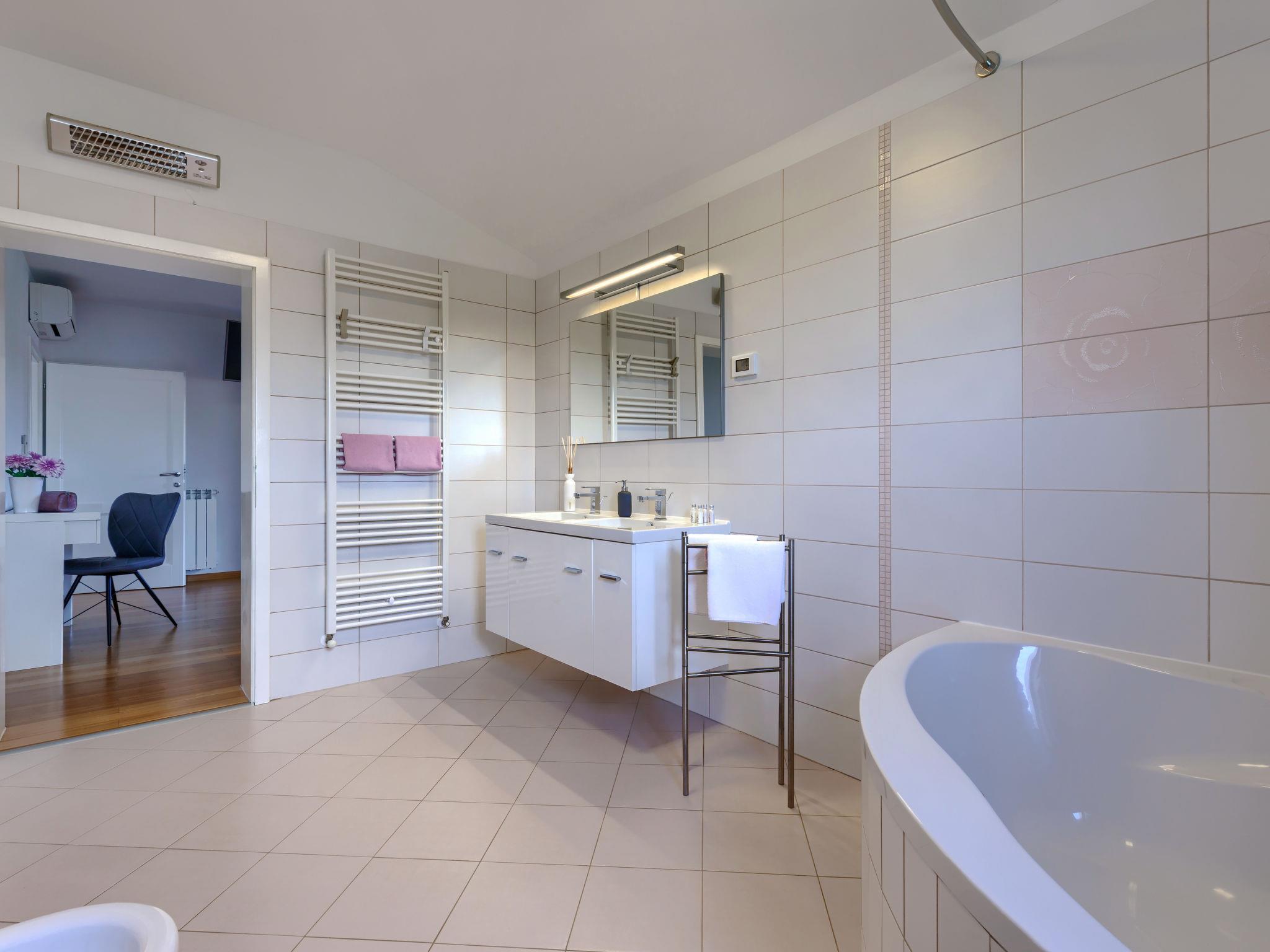 4-room villa 230 m2 on 2 levels. Large living/dining room 90 m2 with satellite TV, flat screen, DVD and air conditioning. Exit to the terrace, to the swimming pool. Kitchen (oven, dishwasher, 4 ceramic glass hob hotplates, microwave, freezer, electric coffee machine) with air conditioning. Sep. WC. Upper floor: 1 room with 2 beds (90 cm, length 200 cm), satellite TV and air conditioning. Exit to the terrace. 1 room with 1 french bed (180 cm, length 200 cm), bath/WC, satellite TV and air conditioning. Exit to the terrace. 1 room with 1 french bed (180 cm, length 200 cm), bath/WC, satellite TV and air conditioning. Shower/WC. Terrace 30 m2, roofed terrace 15 m2, roofed. Terrace furniture, deck chairs. View of the swimming pool. Facilities: safe, baby cot. Internet (WiFi, free). Garage (2 cars). UP/I-335-03/12-01/43