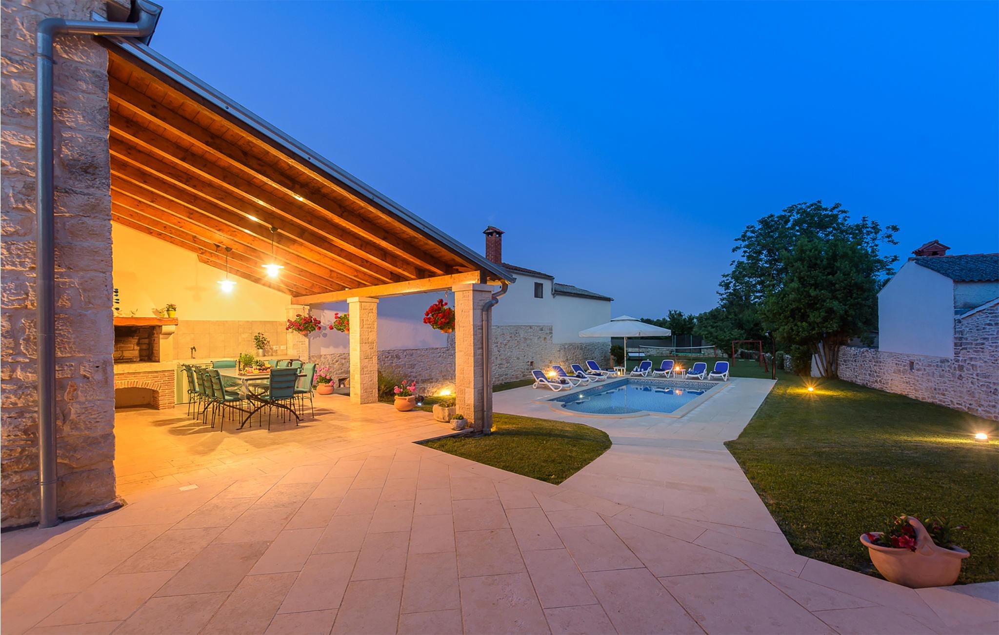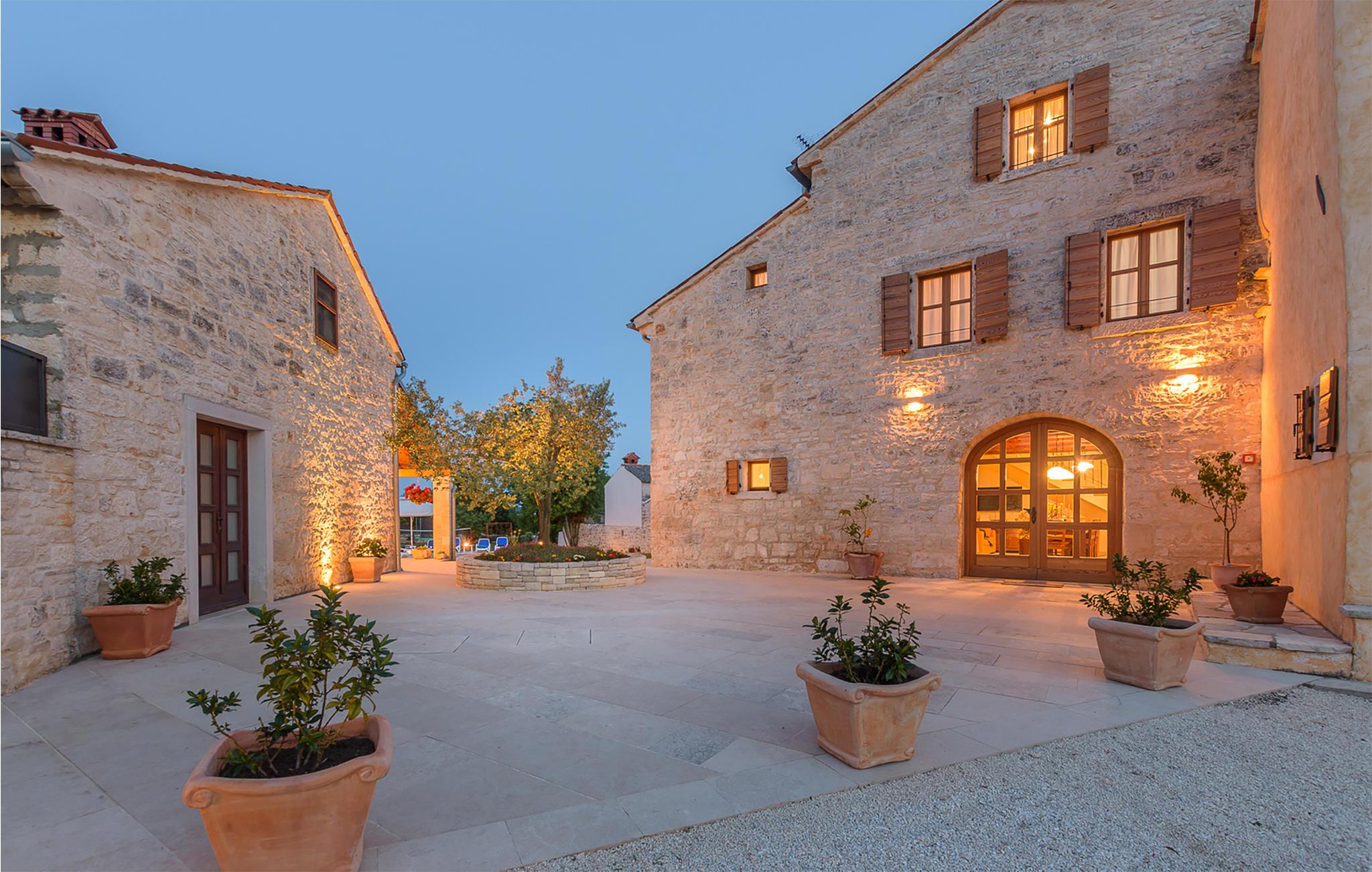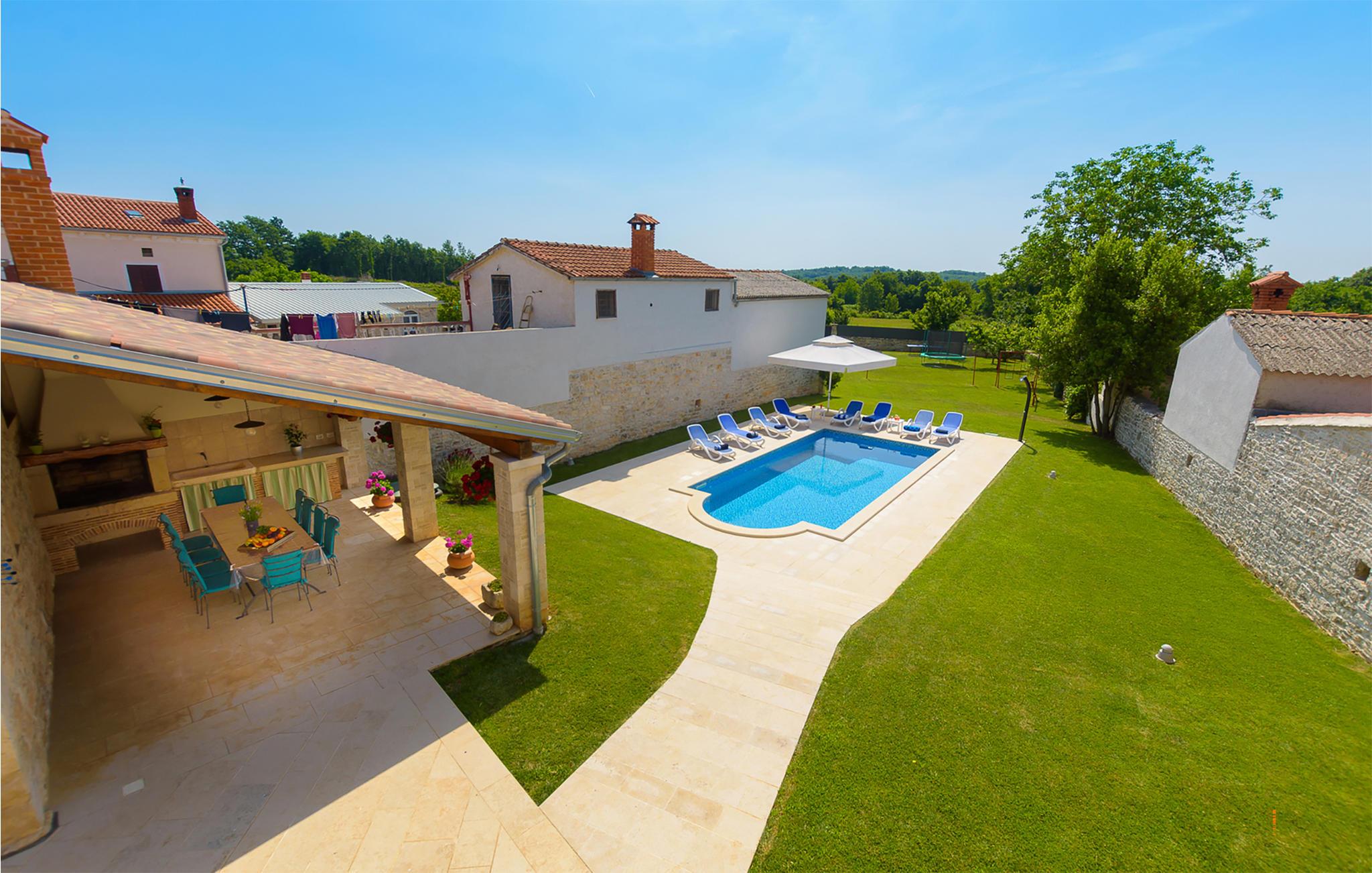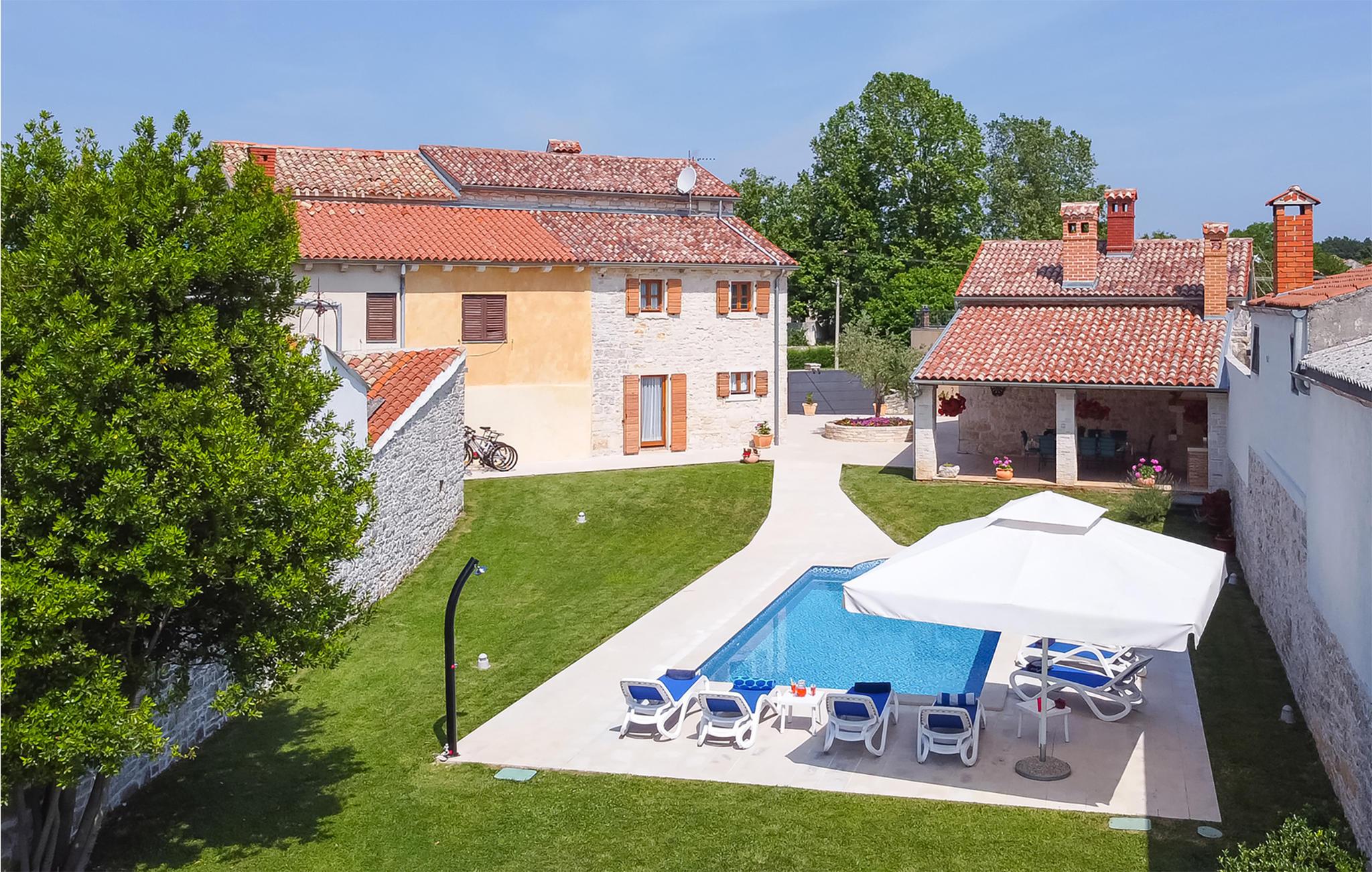 Gulvene er forbundet med indvendige trapper. Huset har 5 soveværelser, 5 badeværelser, køkken og stue. I dette hus har du til en afslappende og vellykket ferie. Blandt andet finder du fitnessudstyr, en sauna og en vinkælder. Du kan slappe af på en stor overdækket terrasse ved siden af ??poolen, mens børnene leger. Ejendommen og parkeringspladserne er helt indhegnet.