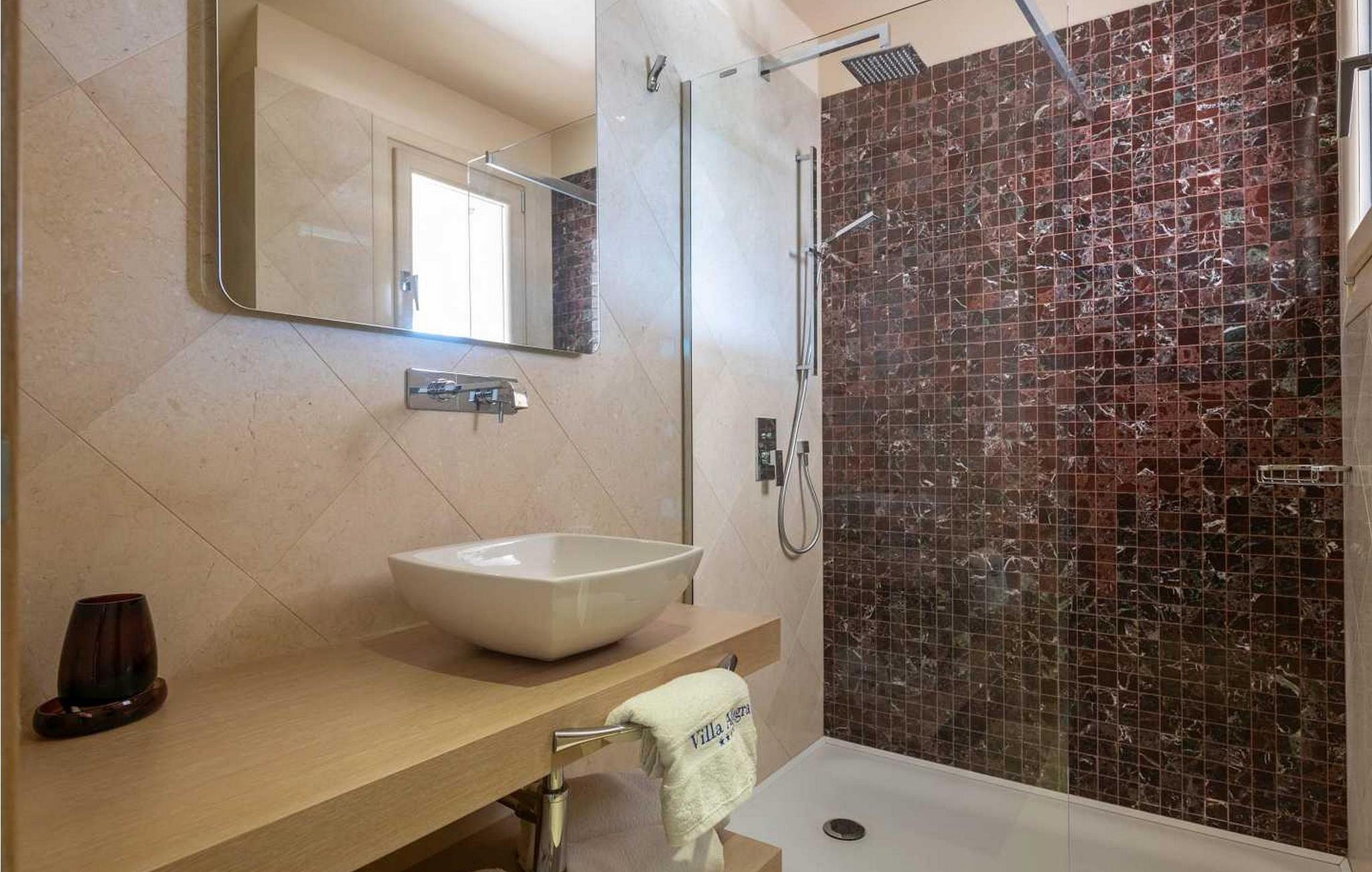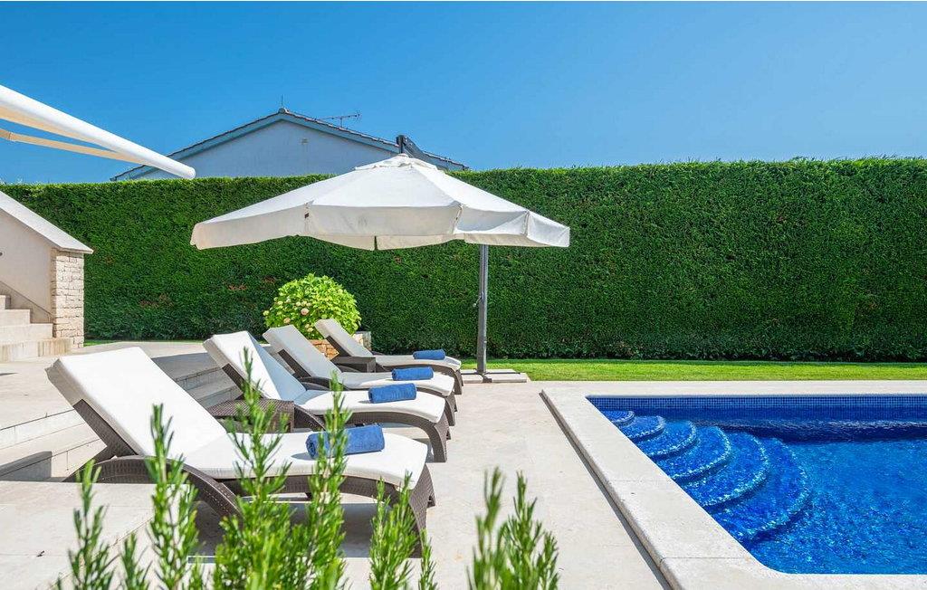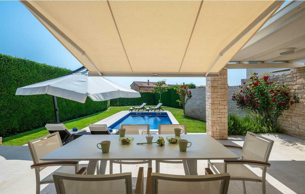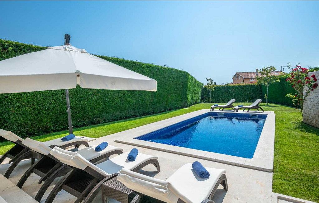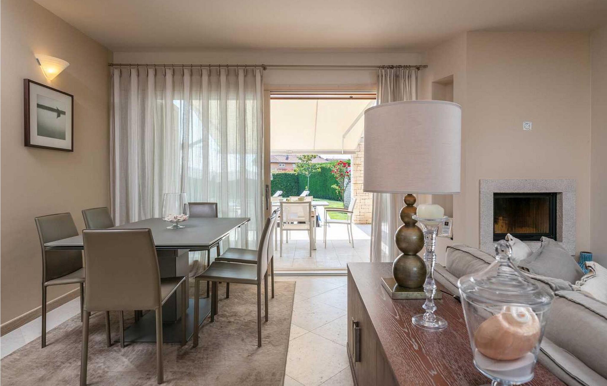 Denne moderne og rigt udstyrede villa med pool ligger i Vabriga, ca. 10 km fra Porec og 1 km fra havet. Beliggende på egen indhegnet gård på 700 kvm, tilbyder villaen sine gæster en velholdt græsplæne, 35 kvm stor privat swimmingpool, overdækket terrasse med siddesæt, udekøkken, én parkeringsplads og garage til én bil. Bygget i 2012, tilbyder Villa Allegra et højt niveau af komfort med møbler af højere kvalitet og interiør møbleret med materialer af høj kvalitet, fra stenbelagt gulv og trapper, gennem badeværelser udstyret med førsteklasses designerfaciliteter til udvendigt træværk af mahogni, alt i dette luksuriøse hjem er underordnet sine gæsters nydelse. Udover dette har villaen også et sofistikeret varme- og kølesystem, som muliggør præcis justering af temperaturen i hvert af rummene, samt intensiteten af gulvvarmen i de koldere perioder af året. Huset er forbundet med et andet identisk hus, men takket være den grønne indhegnede have har gæsterne i villaen Allegra fuldstændig privatliv sikret. Villa med swimmingpool til 6 gæster på cirka 169 kvm fordelt på to etager. I stueetagen er der en rummelig opholdsstue med fuldt udstyret køkken, spisebord og stue med pejs med udgang til haven med swimmingpool, terrasse og udekøkken, et soveværelse med dobbeltseng, bad/toilet. På første sal er der to soveværelser med dobbeltsenge og terrasse, et med bad/toilet og et med bad/toilet med spabad og separat brus. BEMÆRK: Gæster har gratis adgang til feriestedet Lanterna under deres ophold. Bemærk venligst, at denne ejendom ikke accepterer ungdomsgrupper eller polterabends. En ungdomsgruppe på denne ejendom er en gruppe bestående af personer på 26 år eller derunder. Book ikke denne ejendom, hvis du er en ungdomsgruppe eller et polterabend, da din reservation vil blive afvist efter booking, hvilket kan omfatte ved ankomst til ejendommen eller under dit ophold, og du vil ikke blive refunderet.