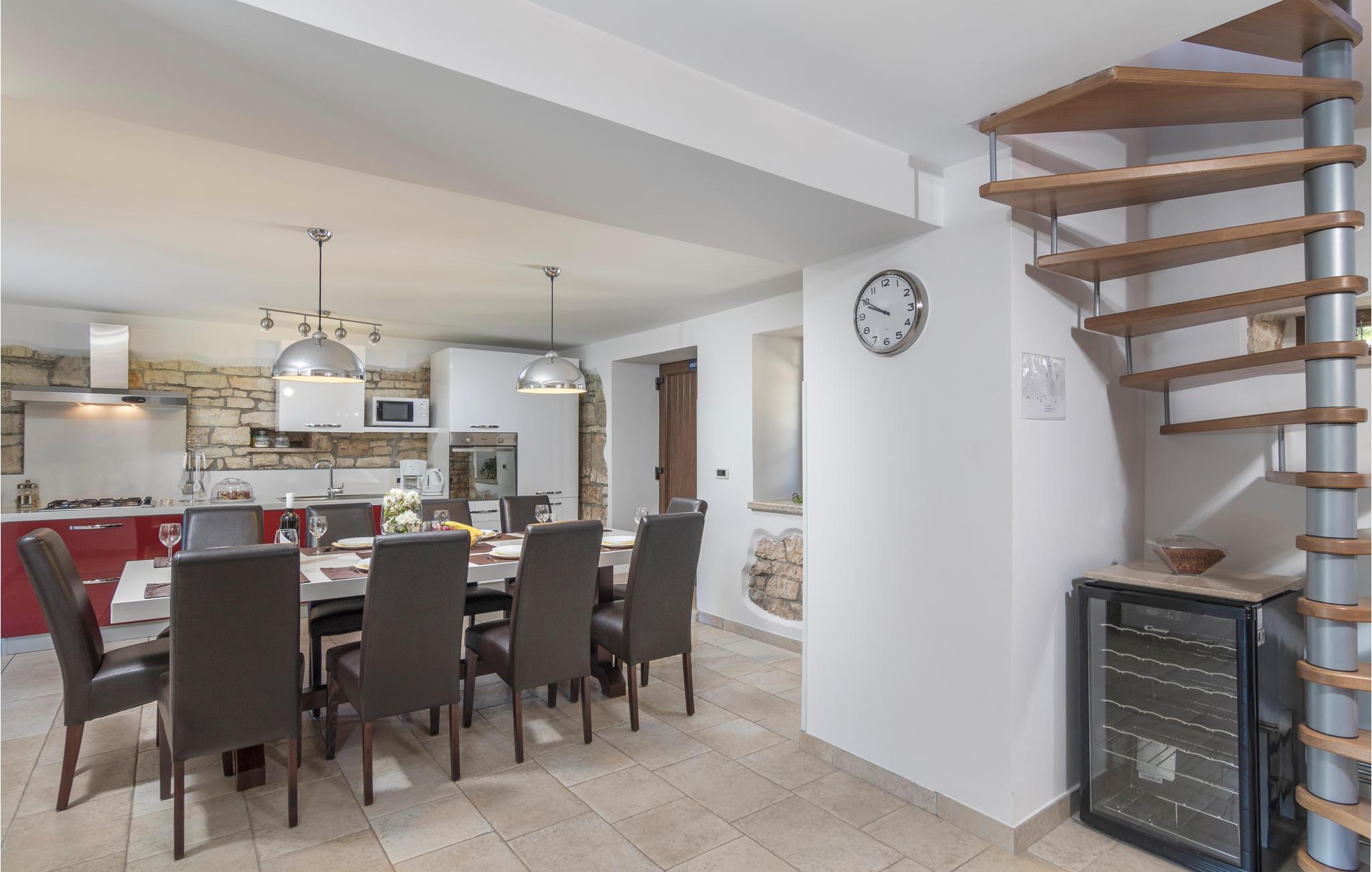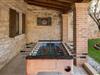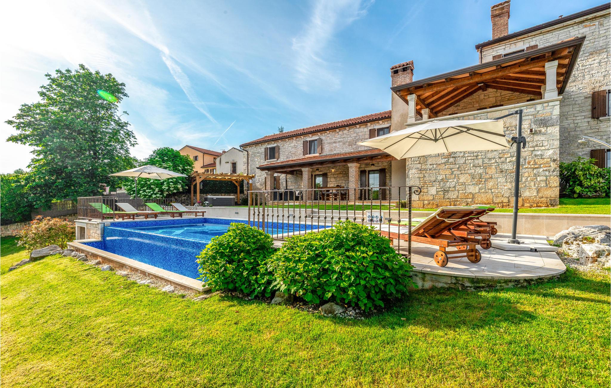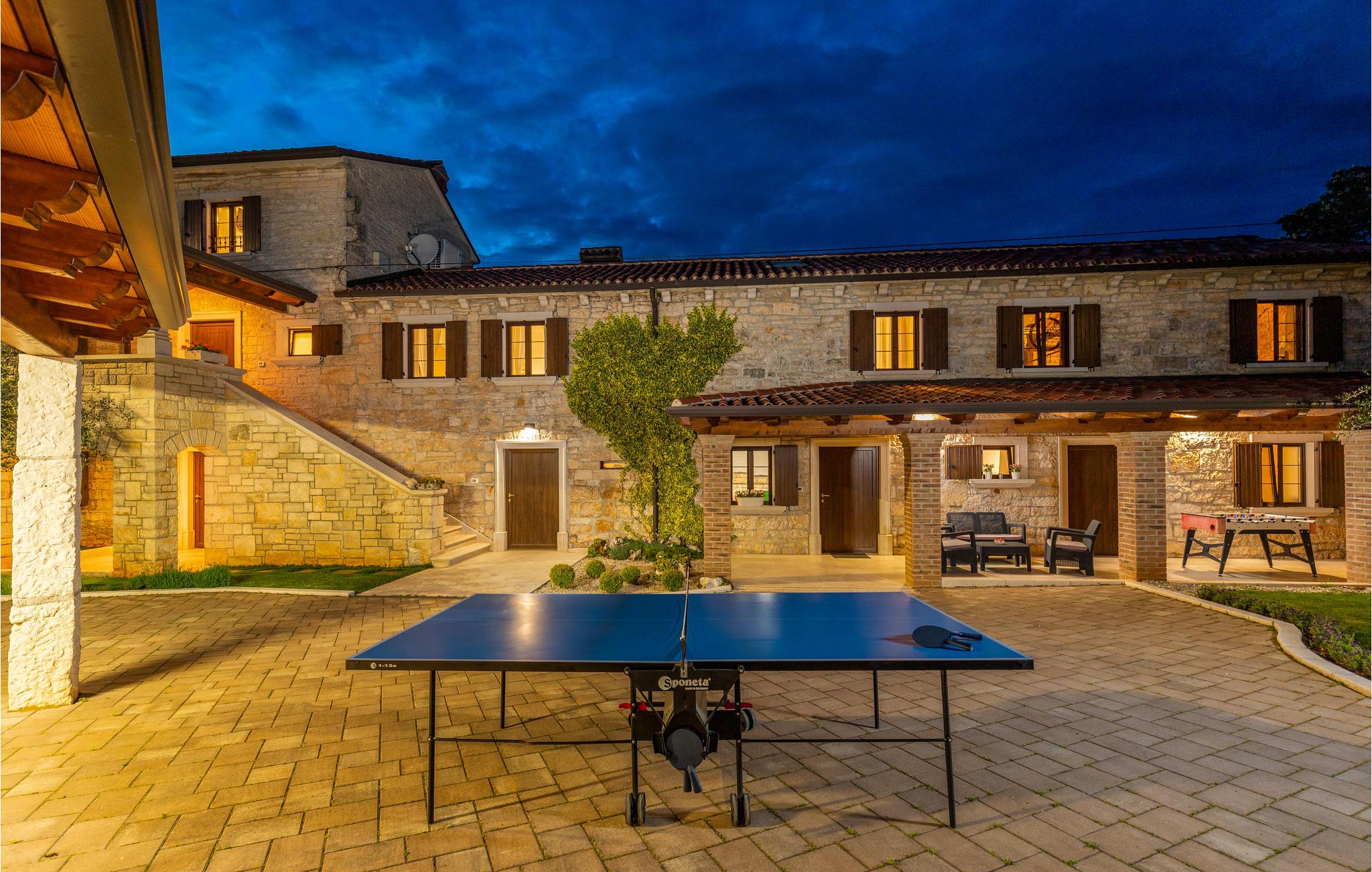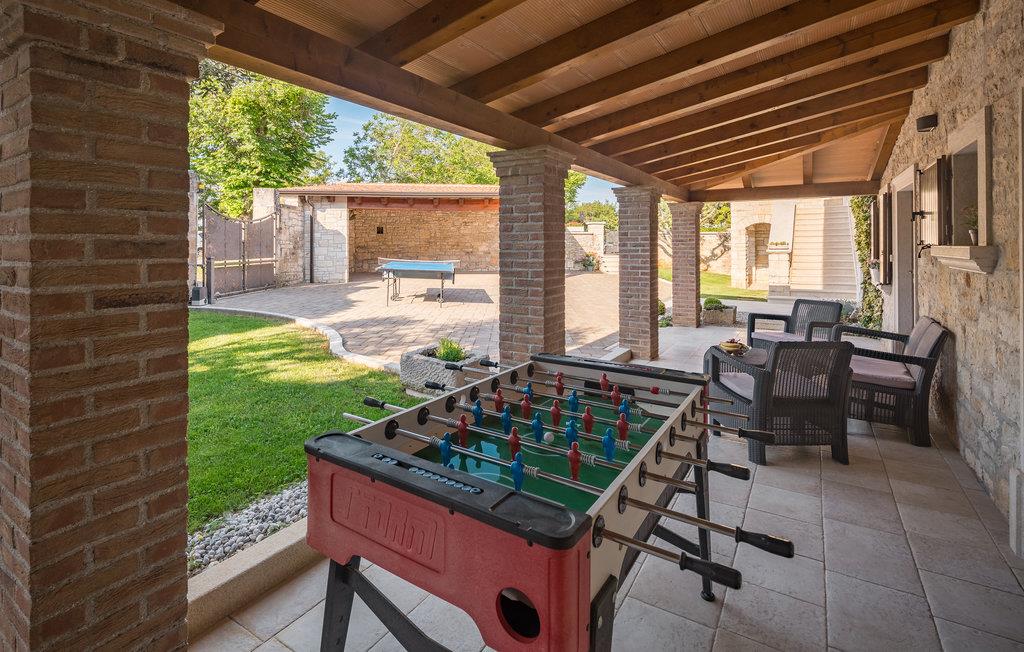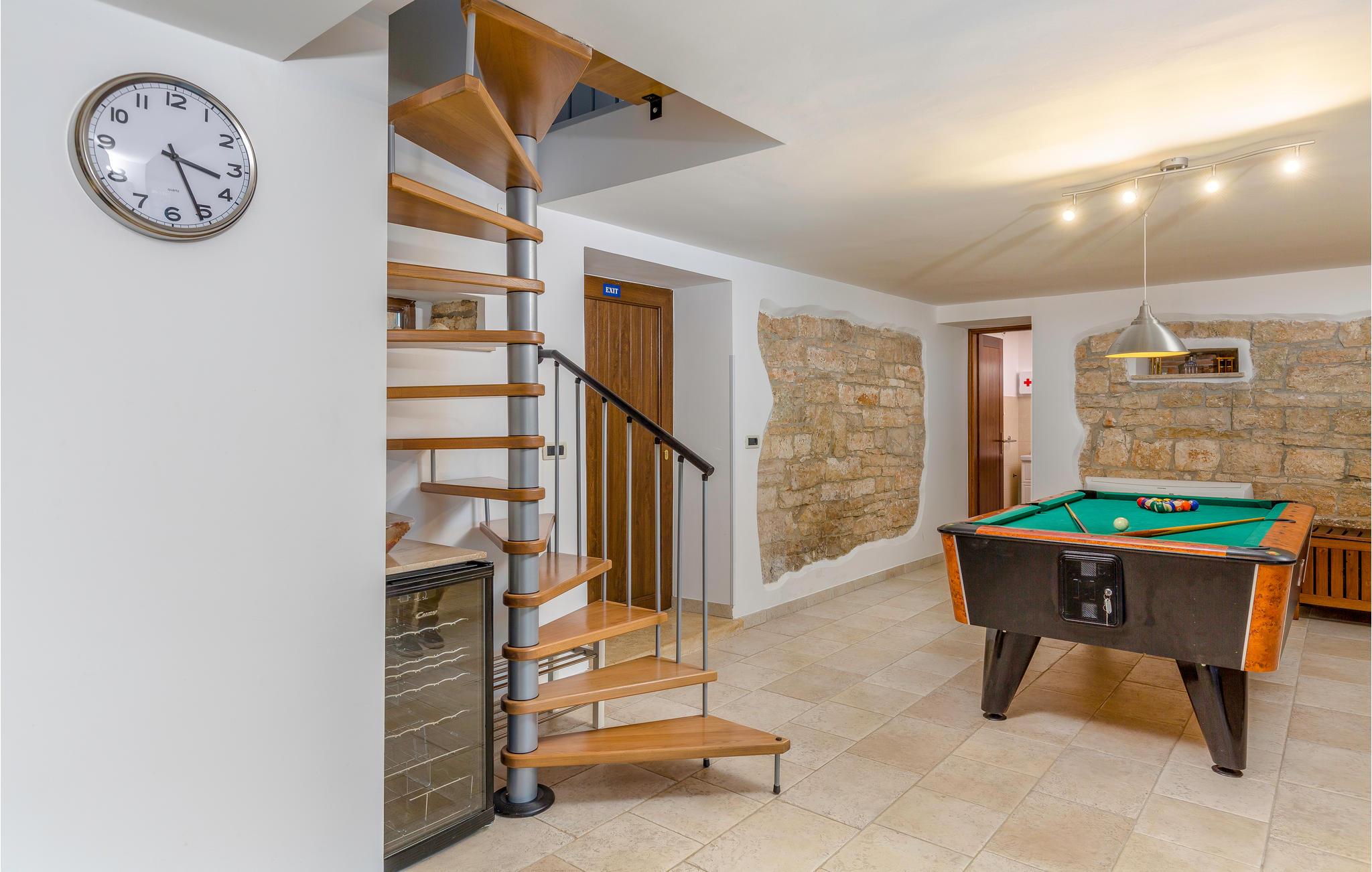 Dette skønne feriehus er gennemrenoveret med bevarelse af husets helt originale og unikke stil. Huset er både komfortabelt og har en skøn atmosfære. I stueplan er der et køkken med spisehjørne, et stort opholdsrum med kamin og et aktivitetsrum med billardbord. Indre trapper fører op til første sal med soveværelser og et legerum med PlayStation. Grunden er delt i to. Den mindste del er en overdækket parkeringsplads, mens dens største del er anlagt i flere planer, med pool og en stor overdækket terrasse. Til denne del af haven er der adgang fra stuen. Der er femten minutter i bil til Porec.